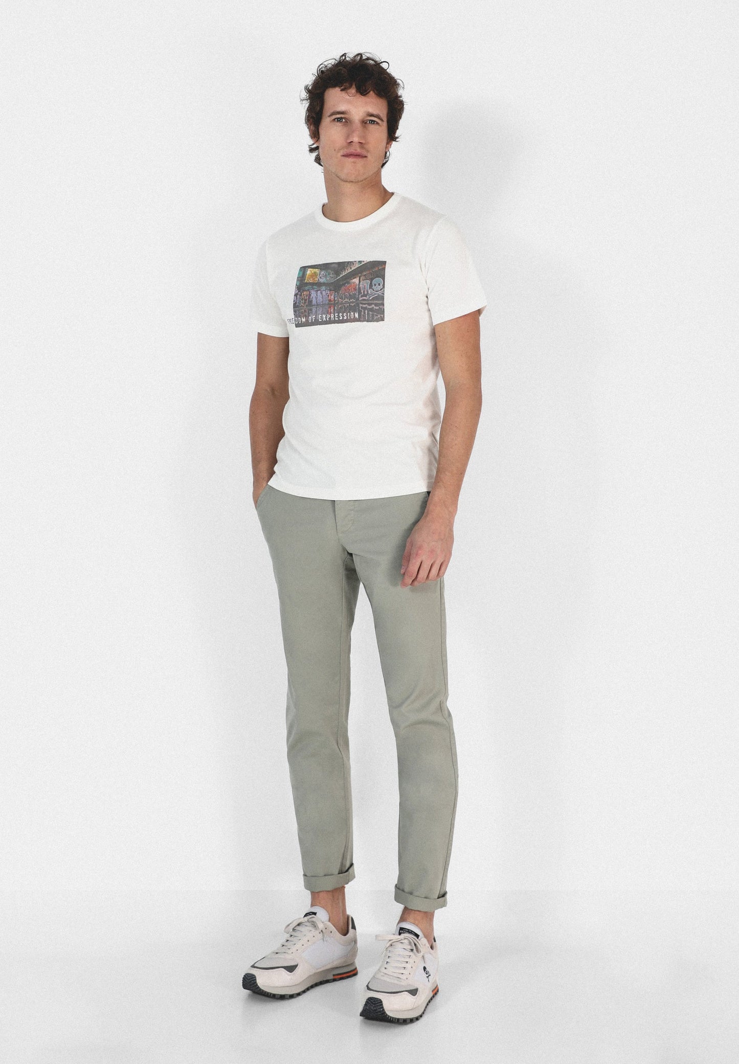 Camiseta confeccionada en tejido mezcla de algodón orgánico, reciclado y poliéster reciclado. Corte Regular Fit, cuello redondo y manga corta. Detalle de print frontal.