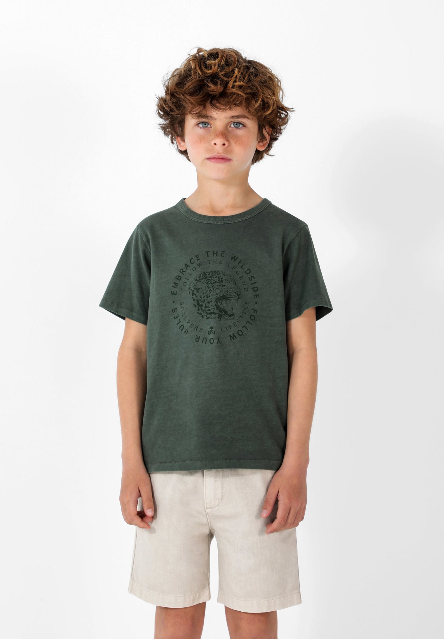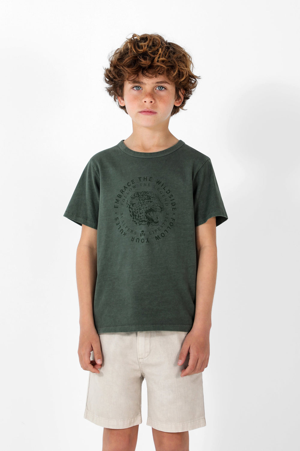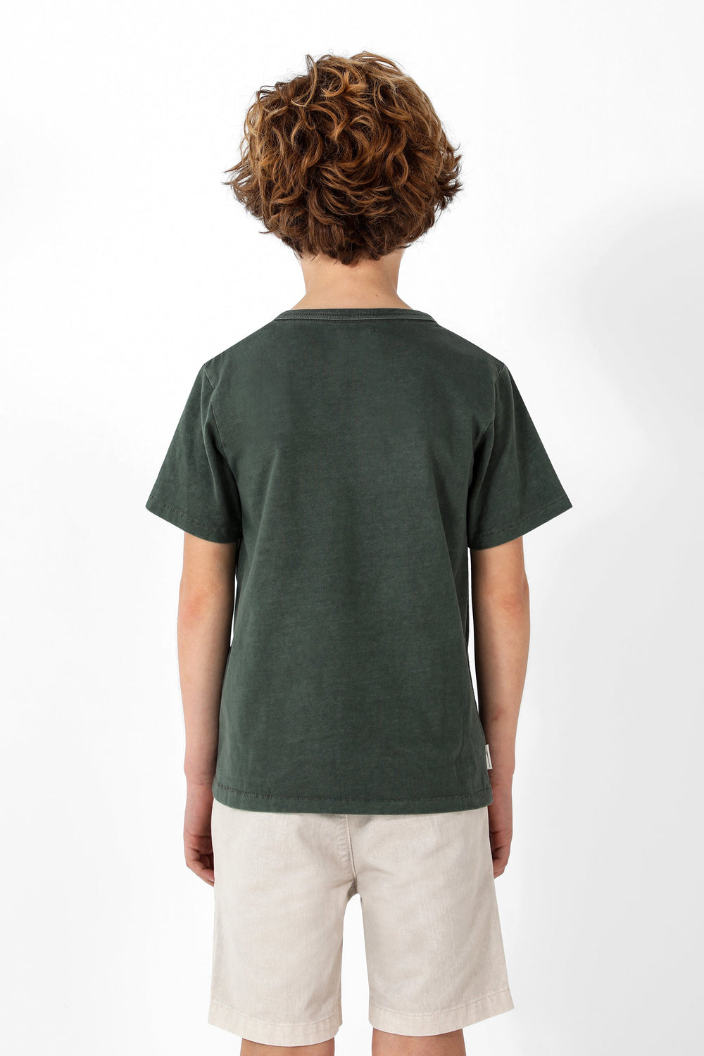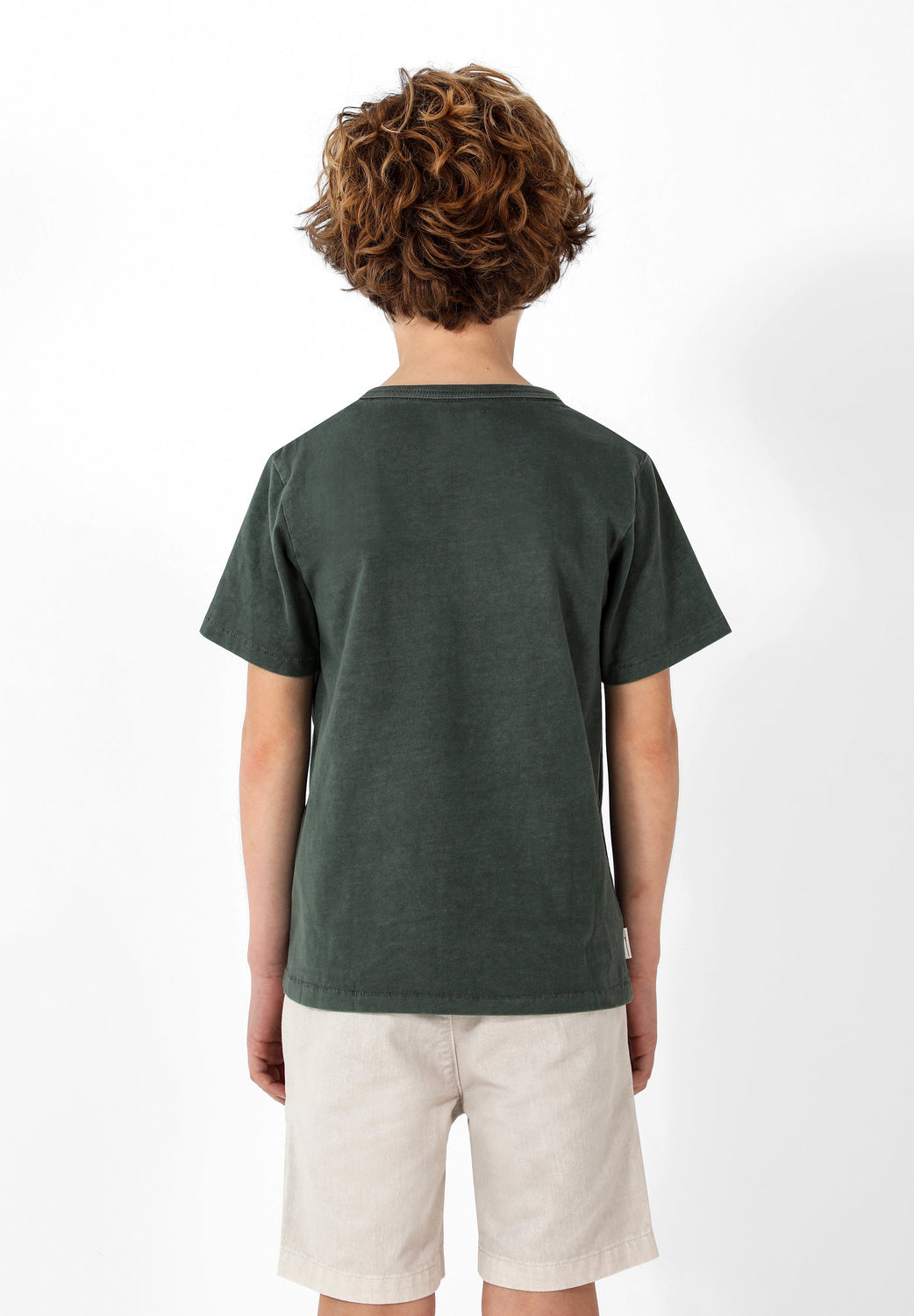 Camiseta confeccionada en tejido 100% algodón orgánico. Corte Regular Fit, cuello redondo y manga corta. Detalle de print redondo frontal.