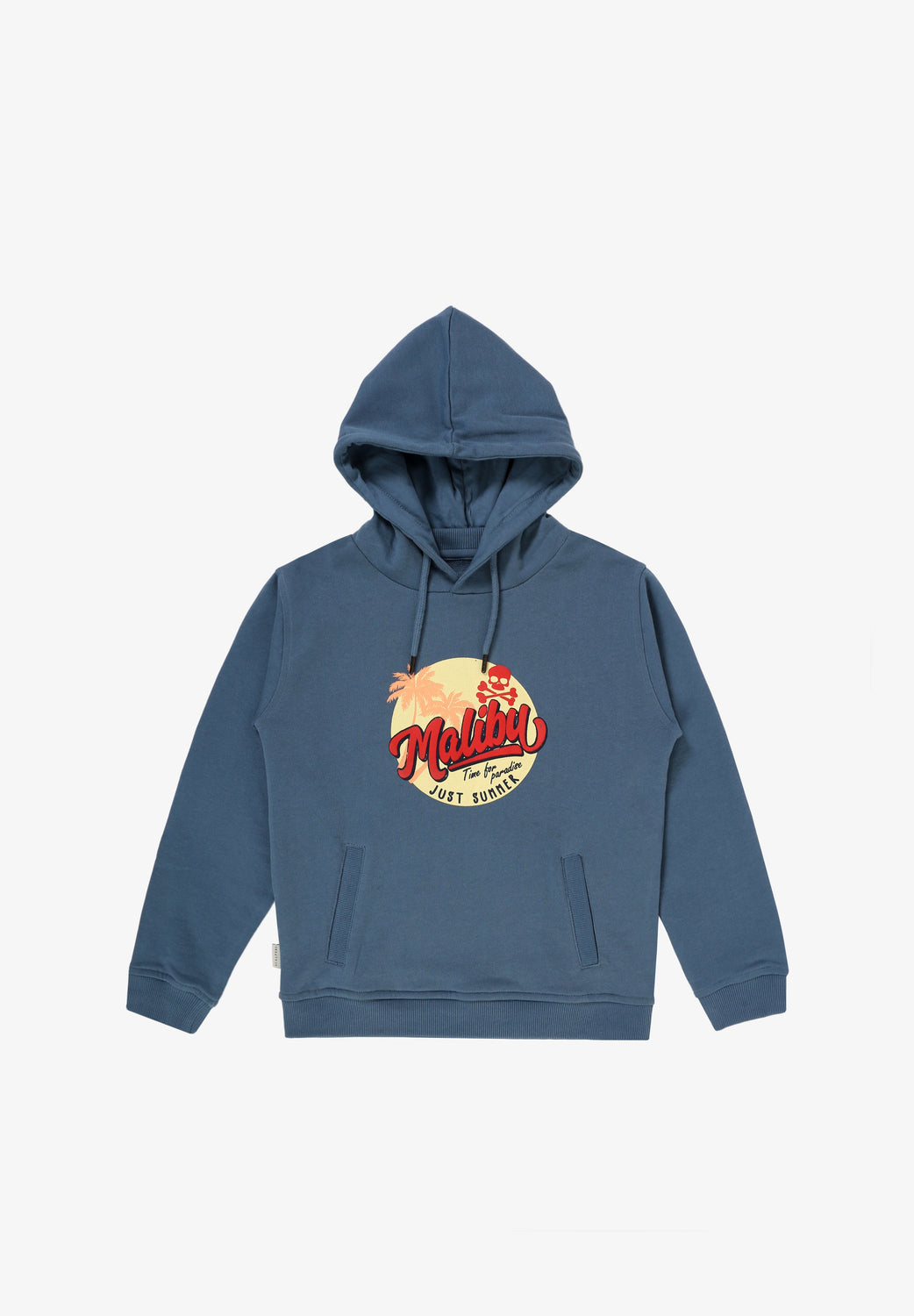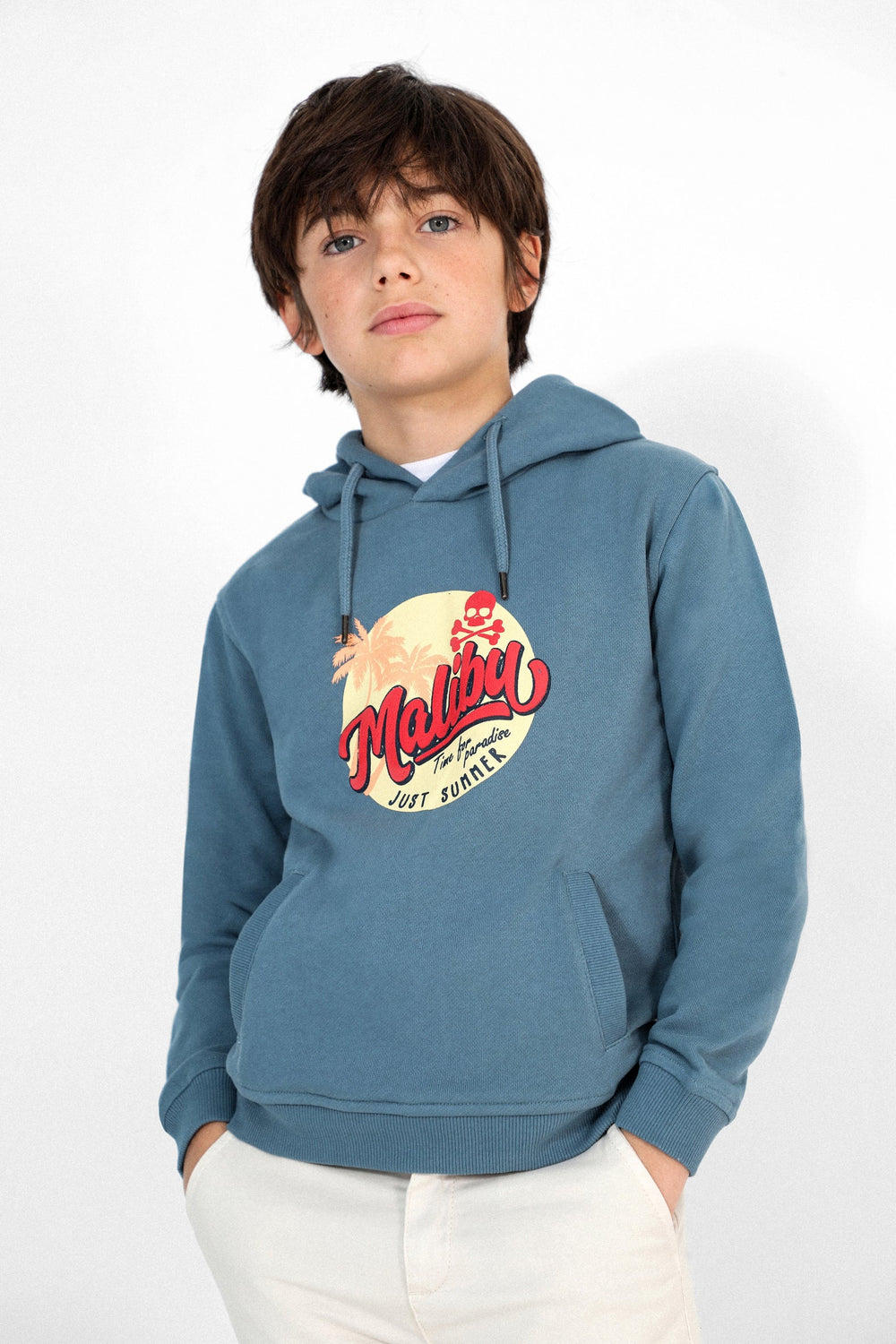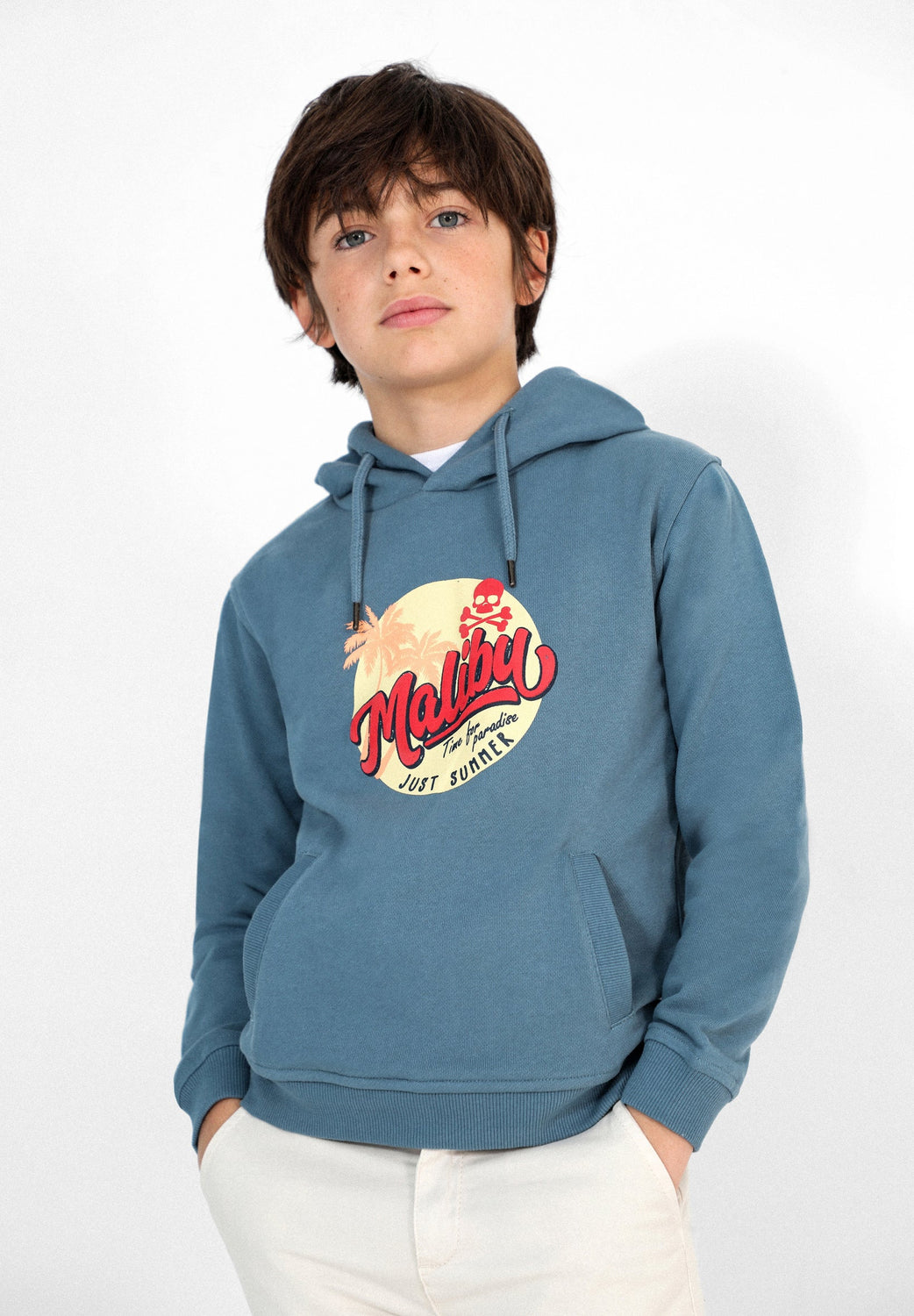 Sudadera confeccionada en tejido 100% algodón orgánico. Corte Regular Fit, cuello con capucha ajustable con cordón y manga larga. Bolsillo canguro y detalle de print frontal Malibú.
