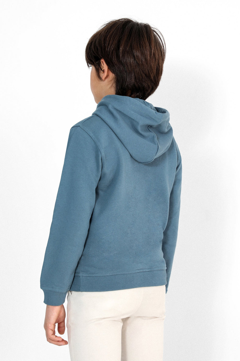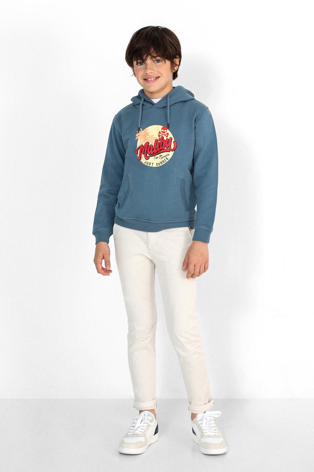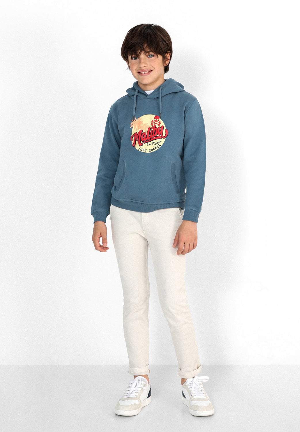 Sudadera confeccionada en tejido 100% algodón orgánico. Corte Regular Fit, cuello con capucha ajustable con cordón y manga larga. Bolsillo canguro y detalle de print frontal Malibú.