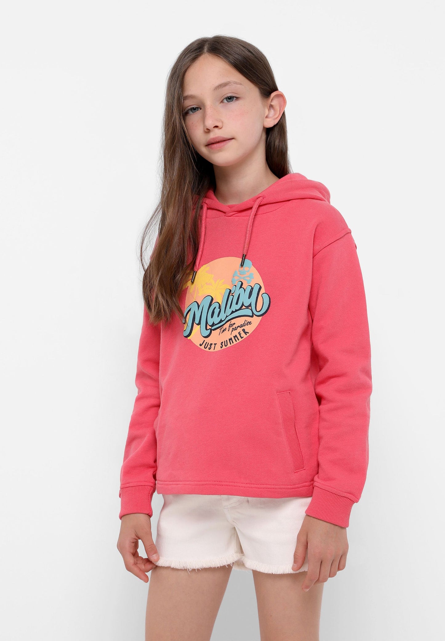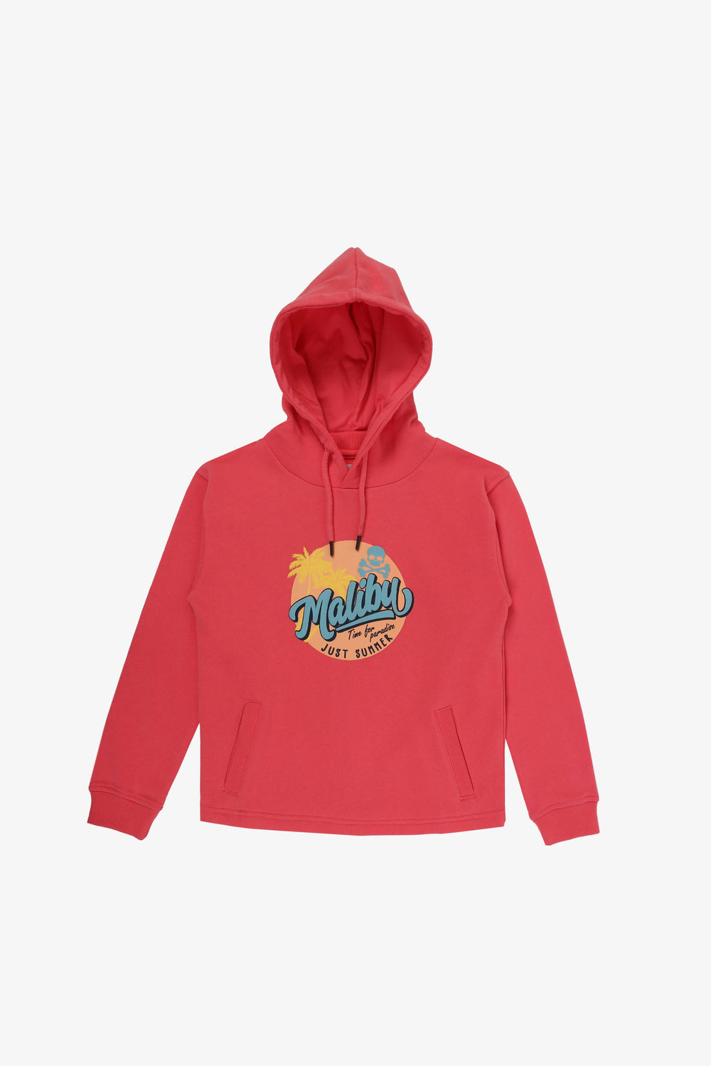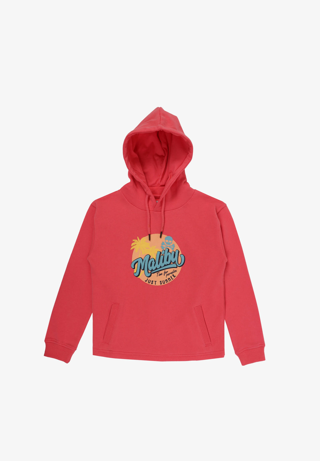 Sudadera confeccionada en tejido 100% algodón orgánico. Corte Regular Fit, cuello con capucha ajustable con cordón y manga larga. Bolsillo canguro y detalle de print frontal Malibú.