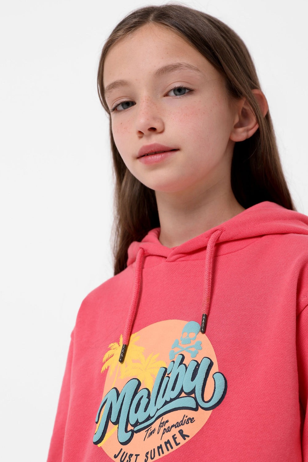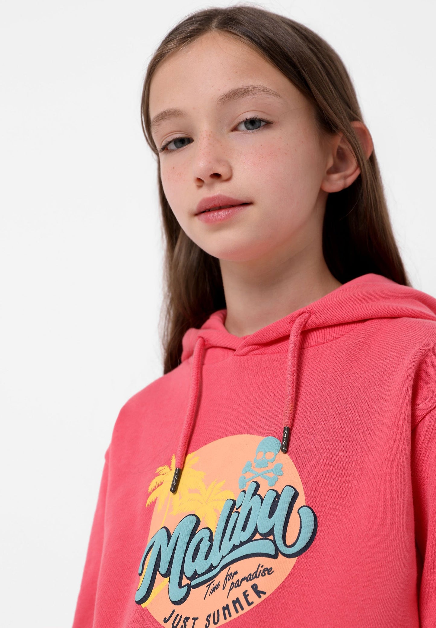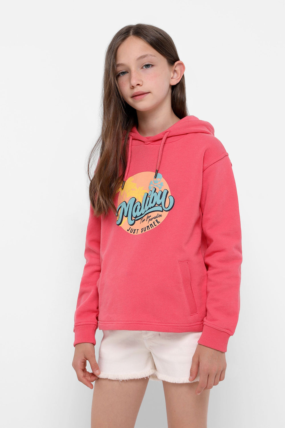 Sudadera confeccionada en tejido 100% algodón orgánico. Corte Regular Fit, cuello con capucha ajustable con cordón y manga larga. Bolsillo canguro y detalle de print frontal Malibú.