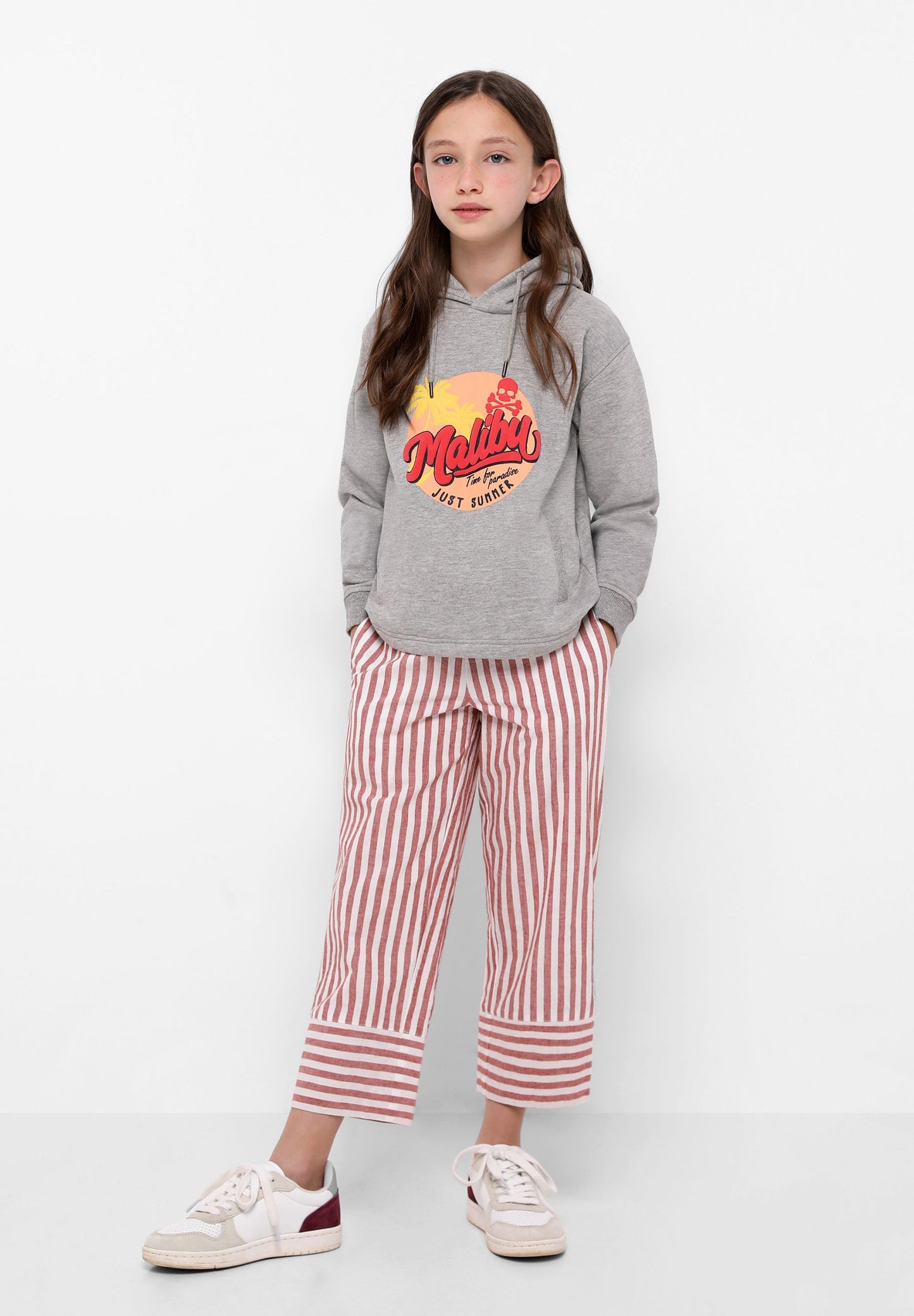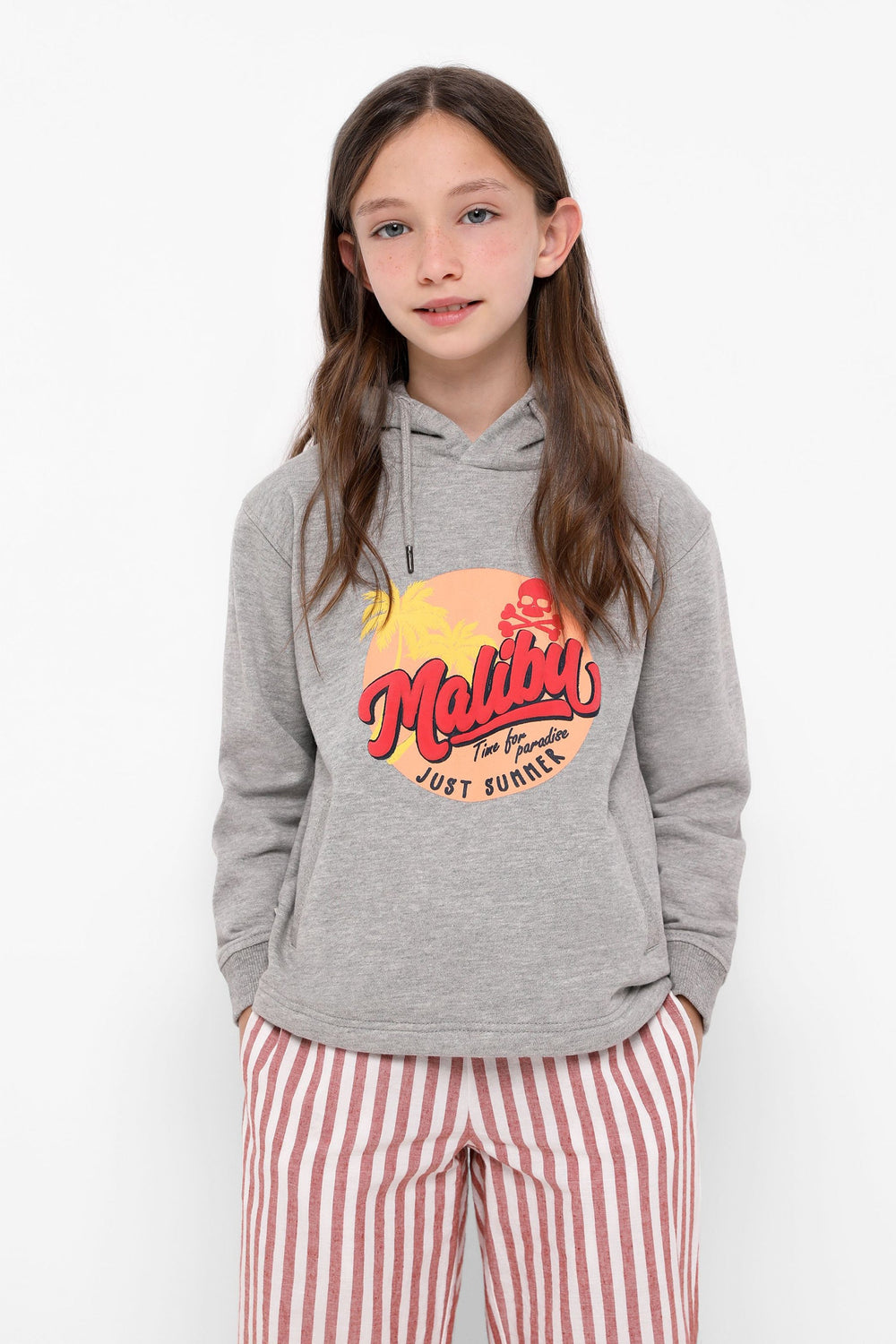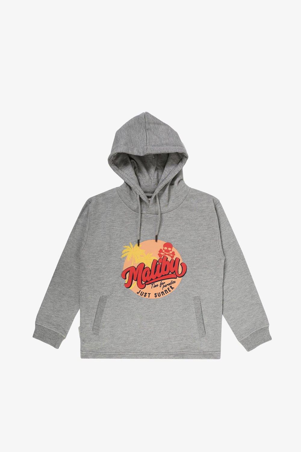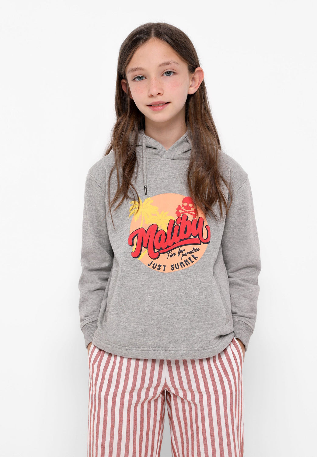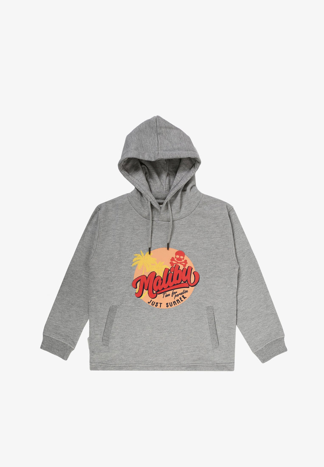 Sudadera confeccionada en tejido 100% algodón orgánico. Corte Regular Fit, cuello con capucha ajustable con cordón y manga larga. Bolsillo canguro y detalle de print frontal Malibú.