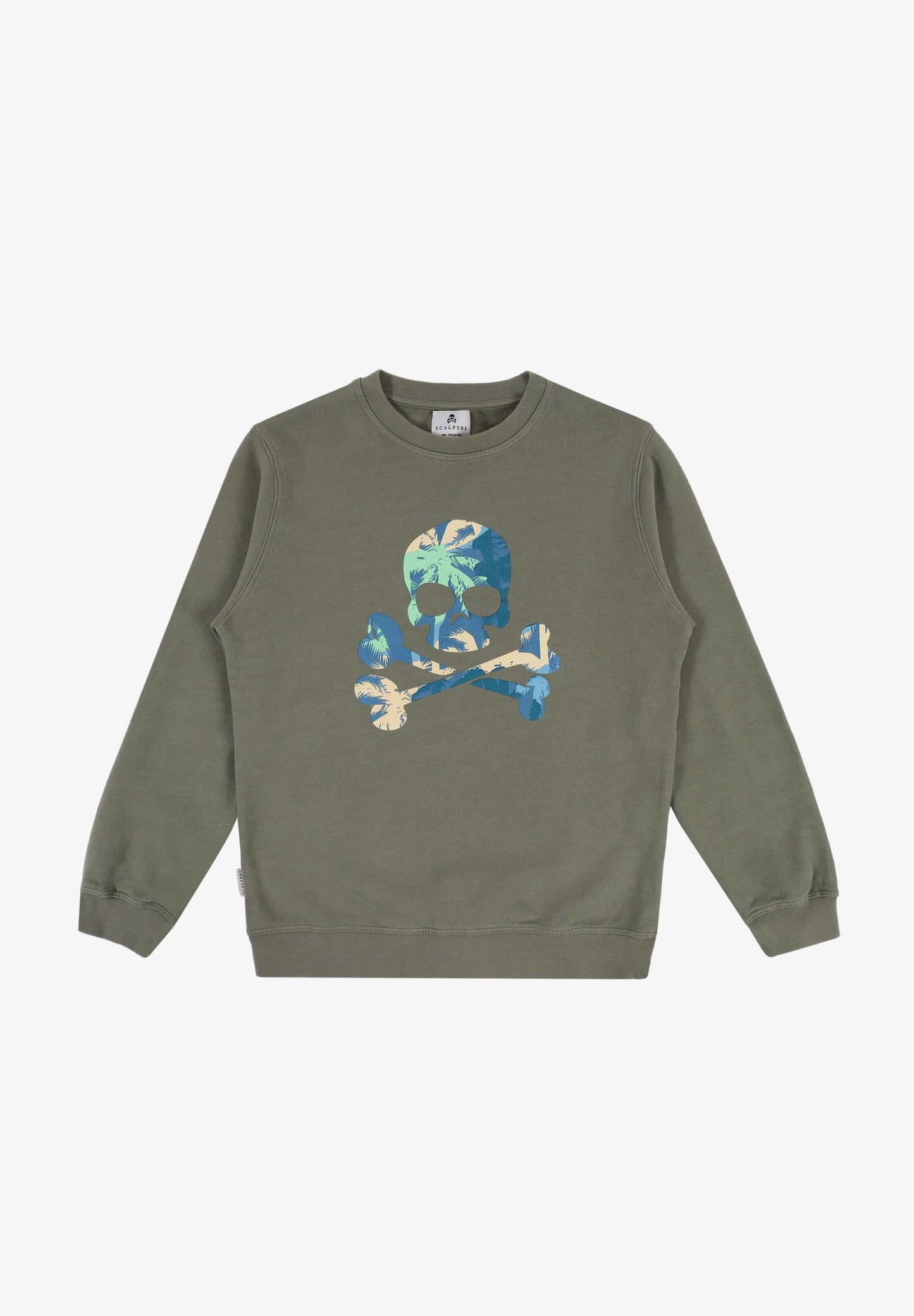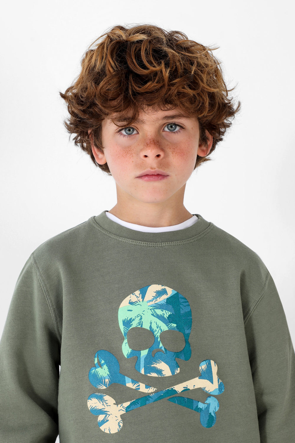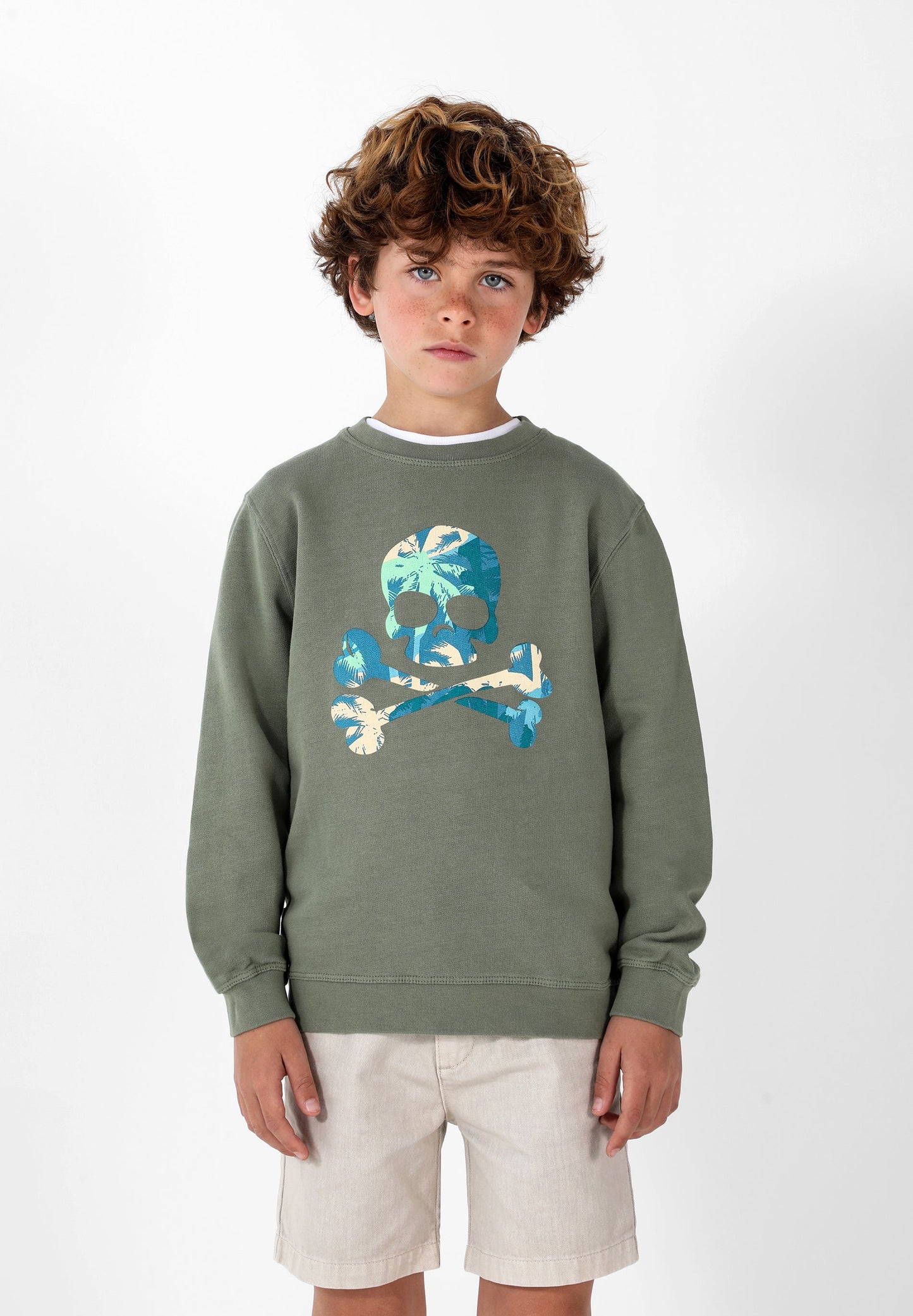 Sudadera confeccionada en tejido 100% algodón orgánico. Corte Regular Fit, cuello redondo y manga larga. Detalle de print de calavera tropical.