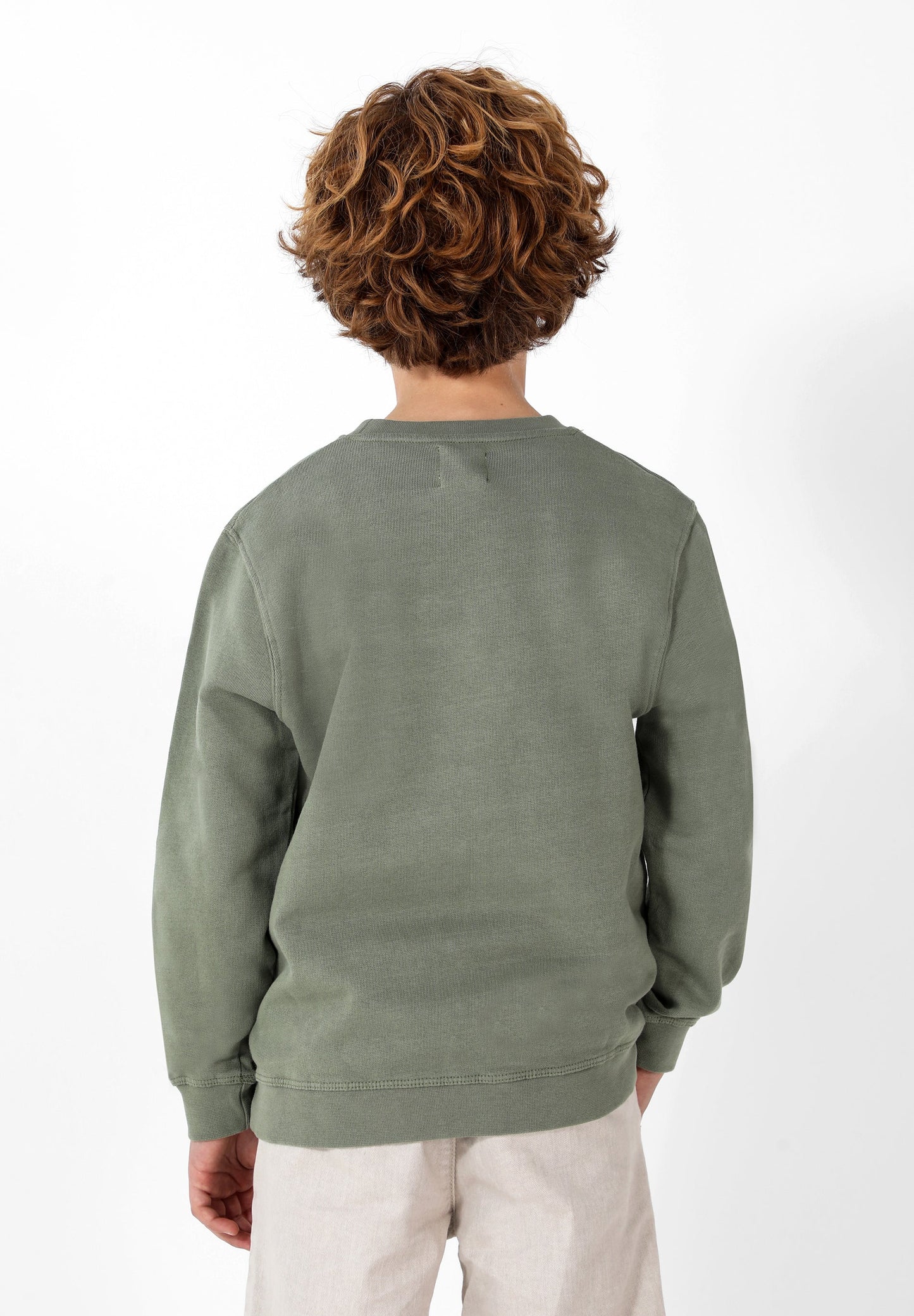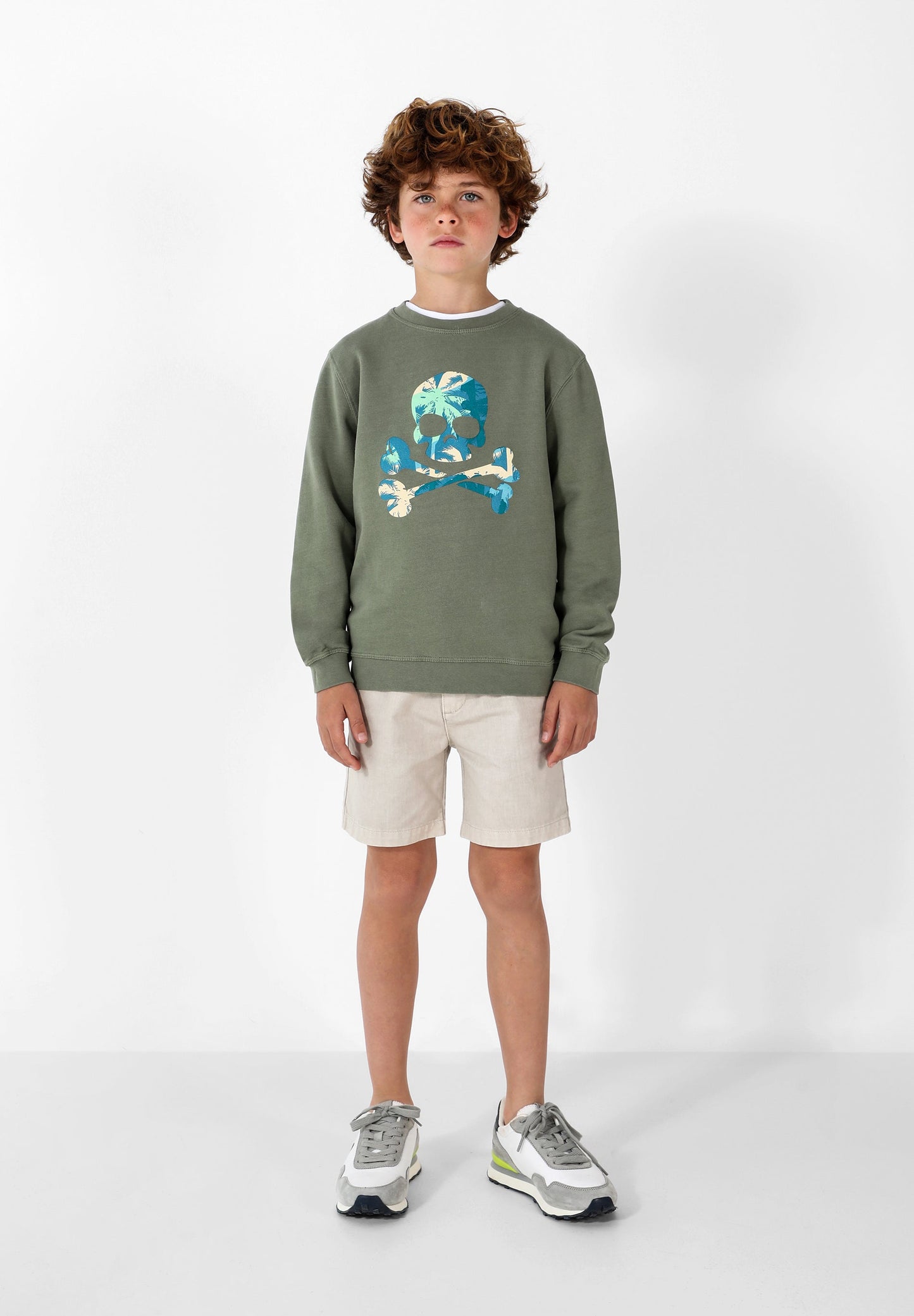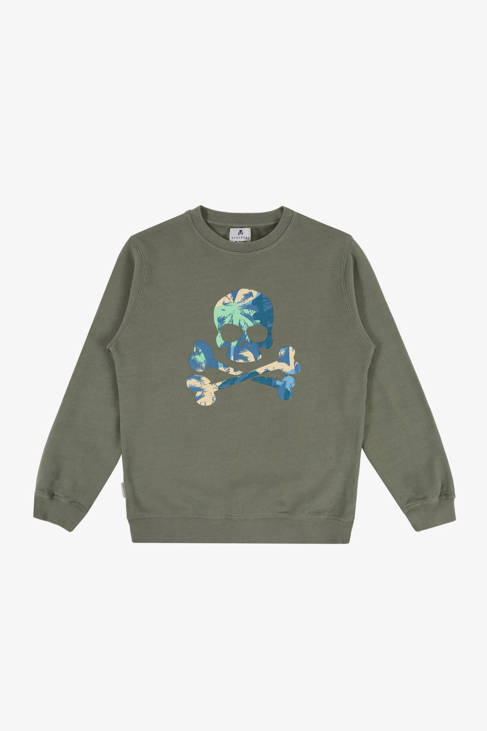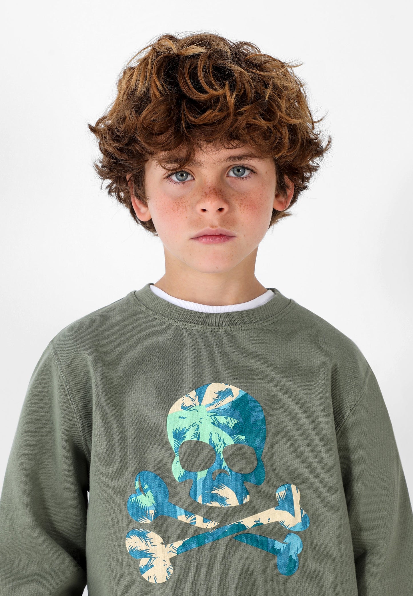 Sudadera confeccionada en tejido 100% algodón orgánico. Corte Regular Fit, cuello redondo y manga larga. Detalle de print de calavera tropical.