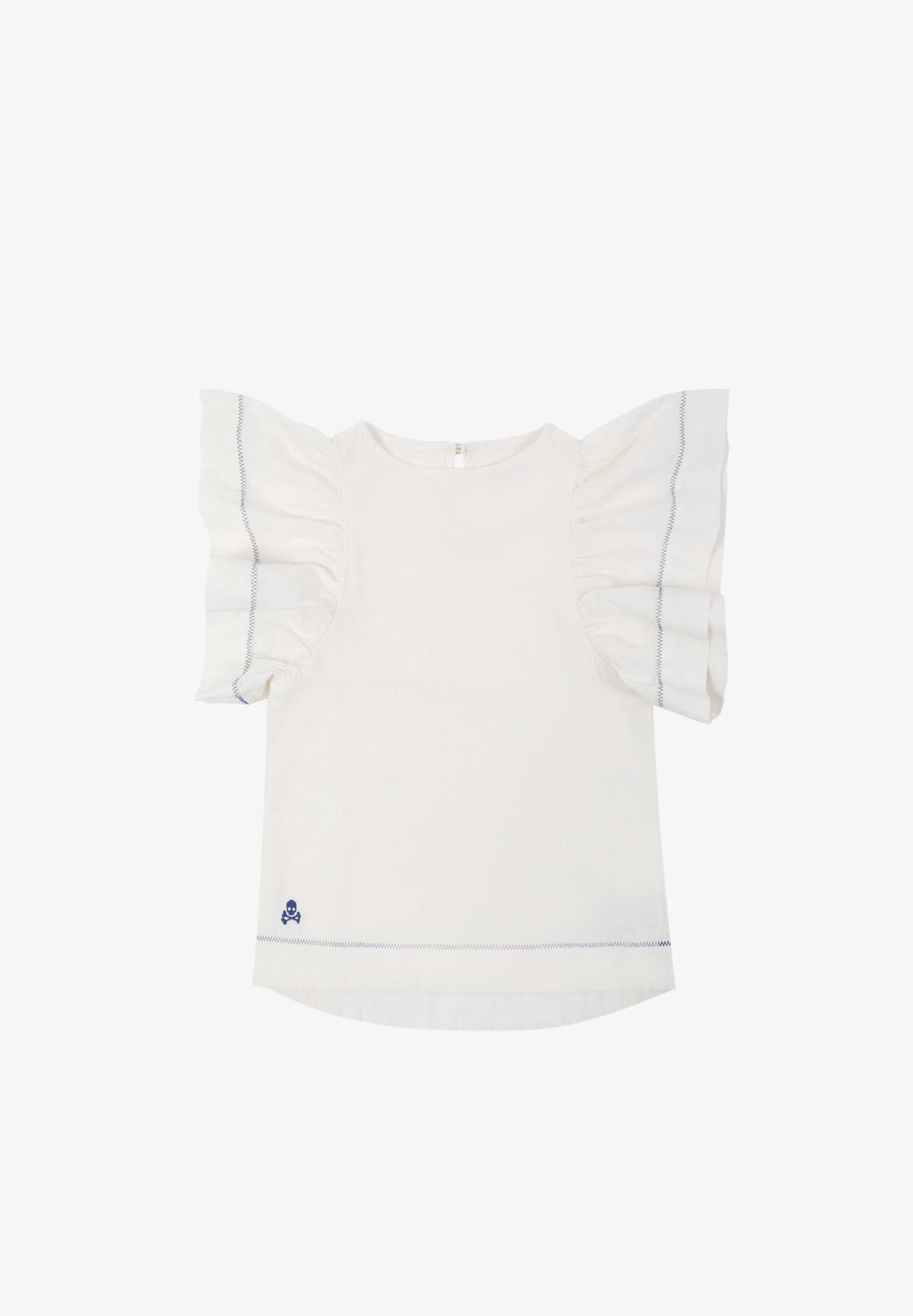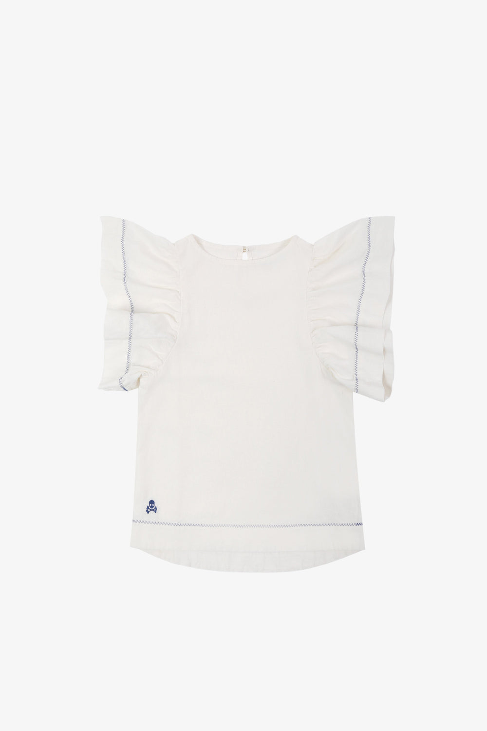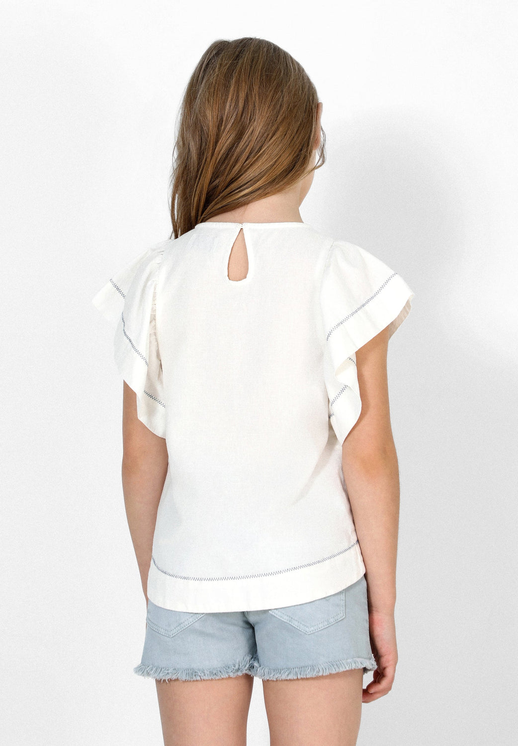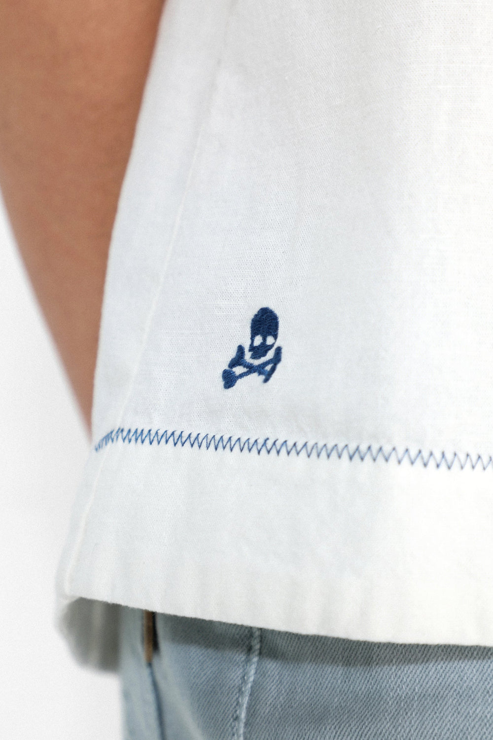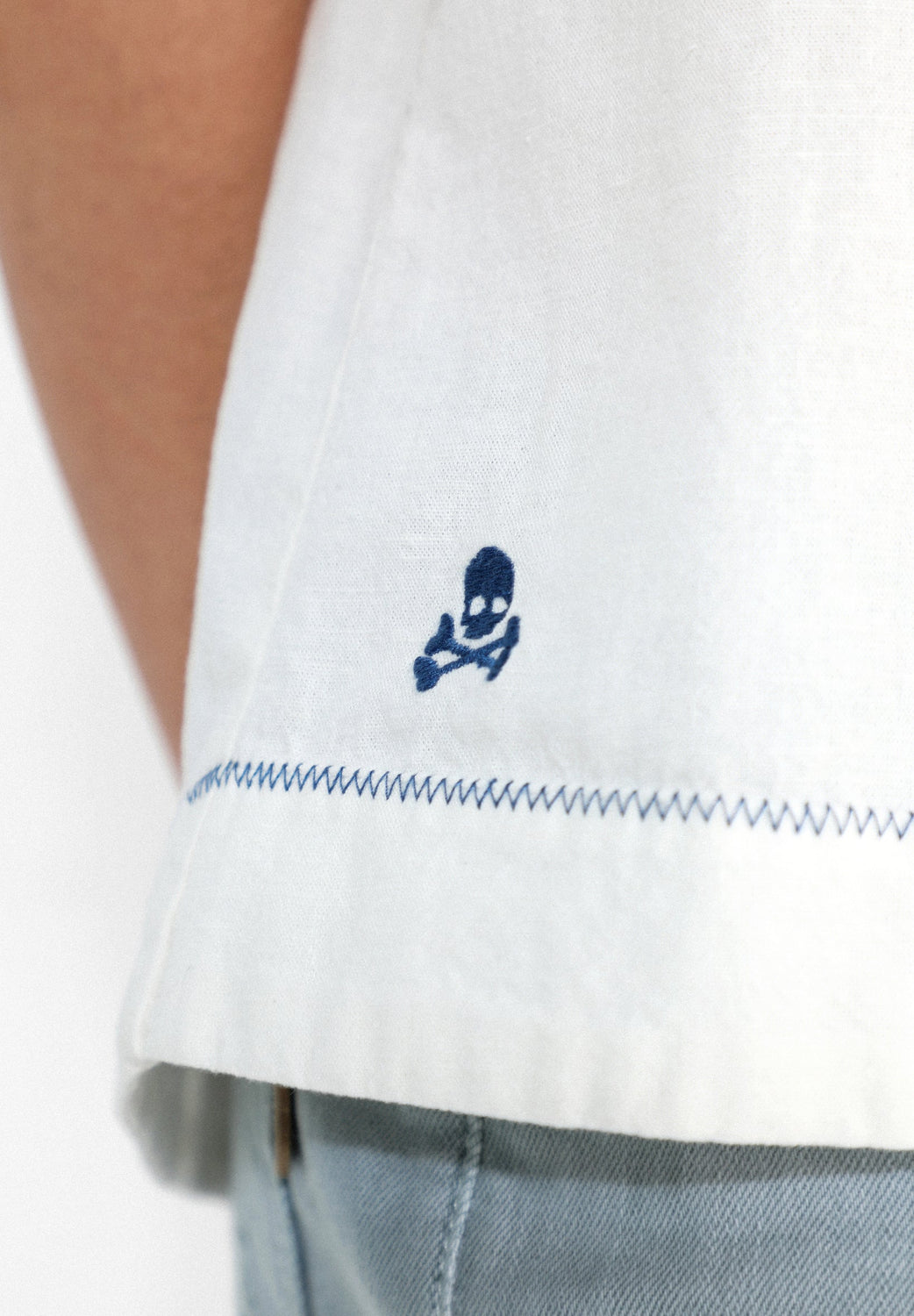 Blusa confeccionada en tejido de algodón y lino. Corte Regular Fit, cuello redondo y cierre con botón trasero. Manga con volante y detalle de calavera en el bajo.