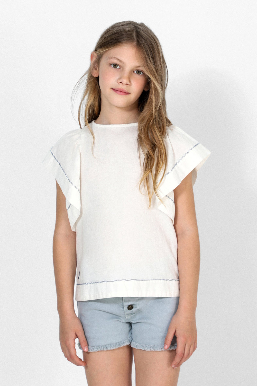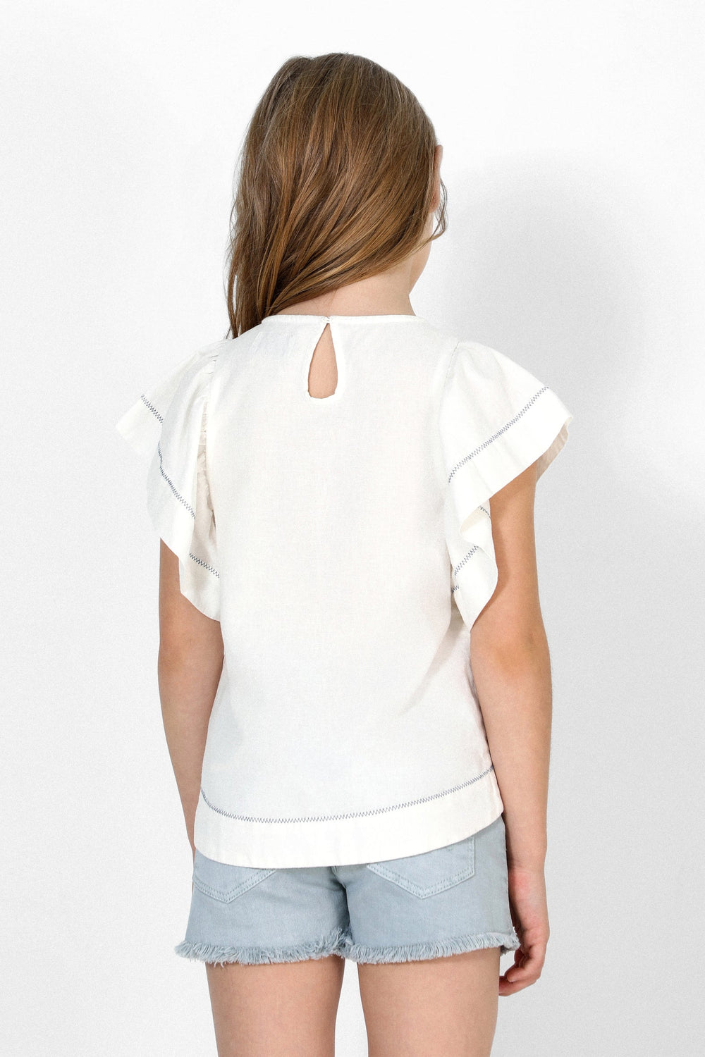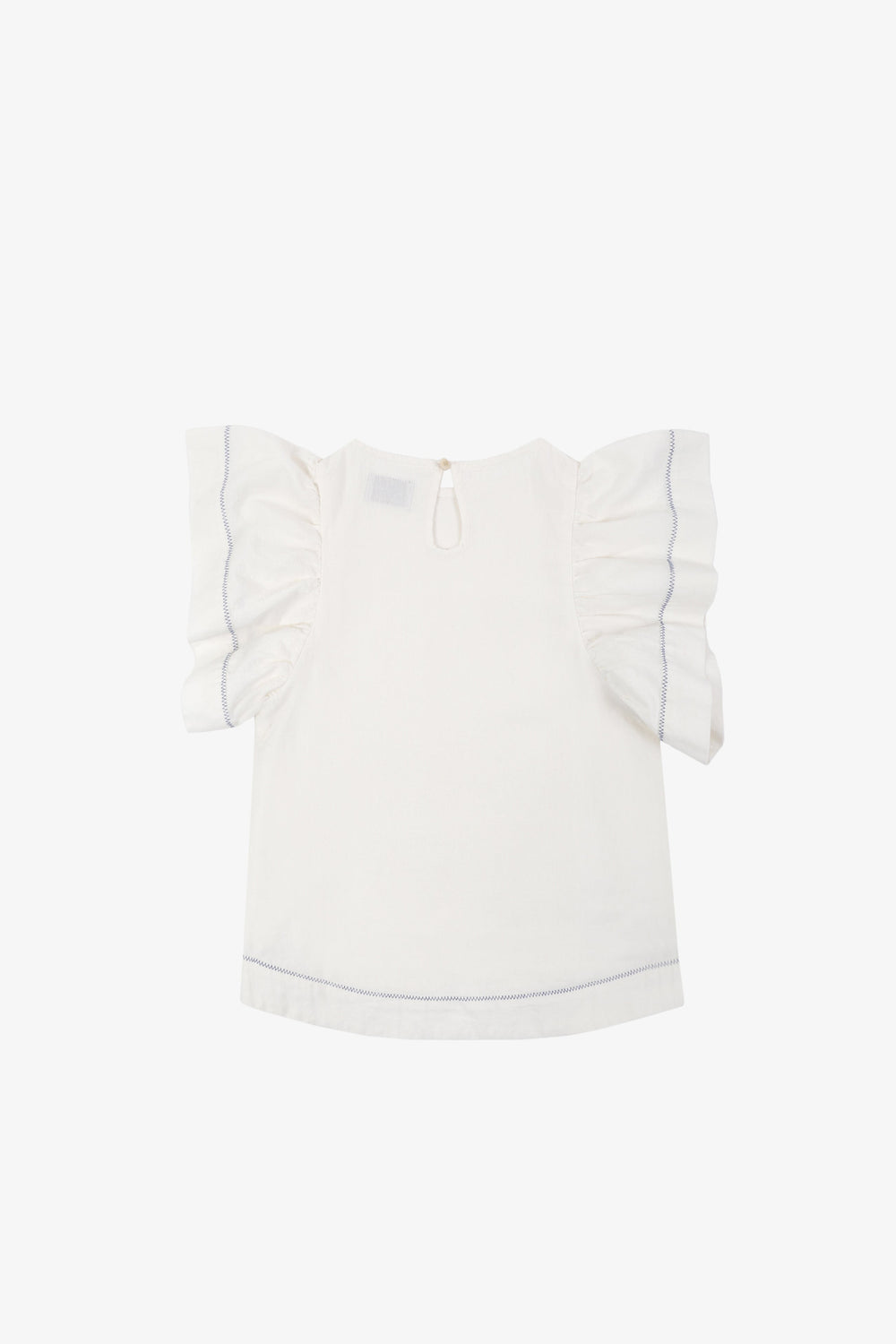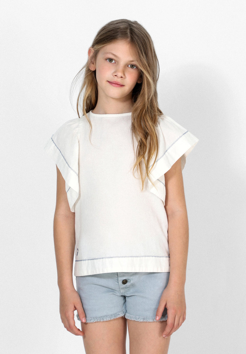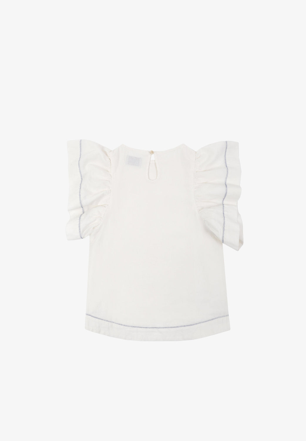 Blusa confeccionada en tejido de algodón y lino. Corte Regular Fit, cuello redondo y cierre con botón trasero. Manga con volante y detalle de calavera en el bajo.