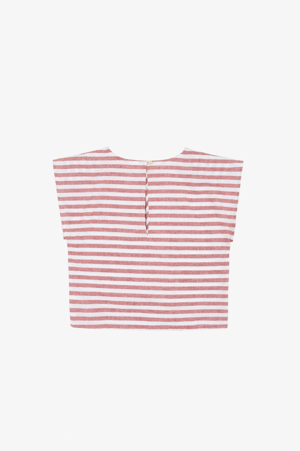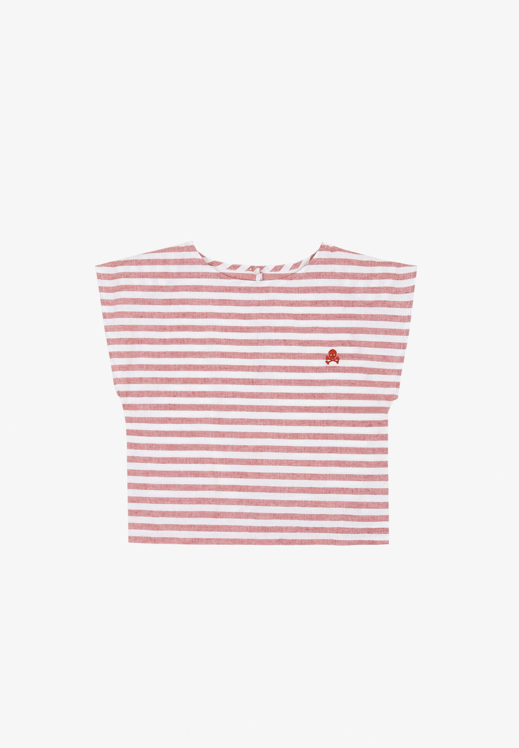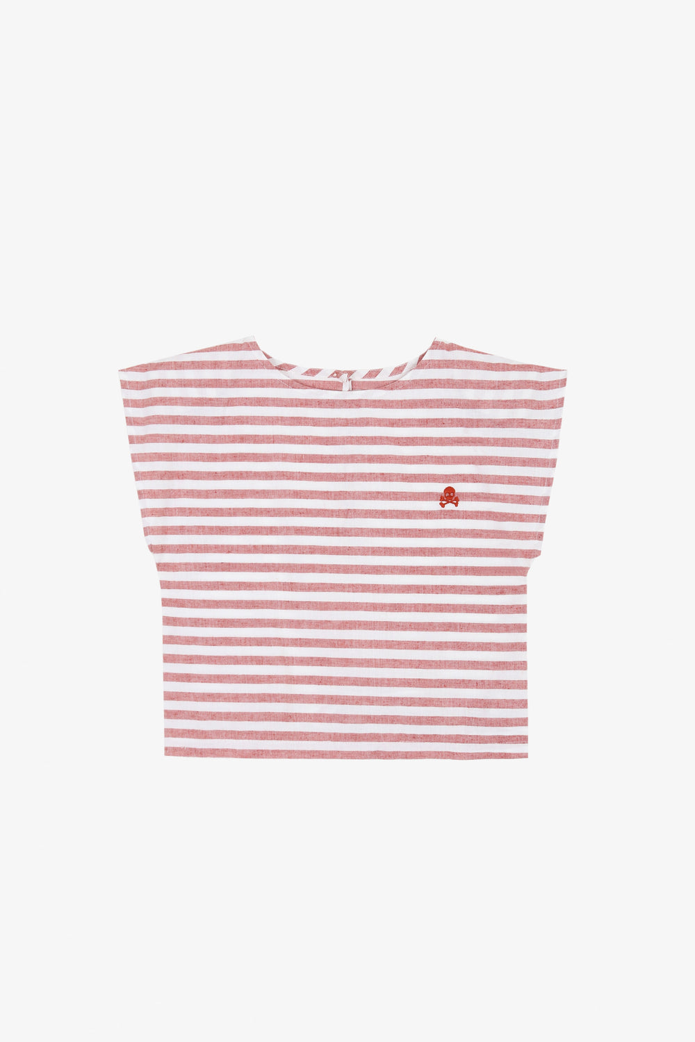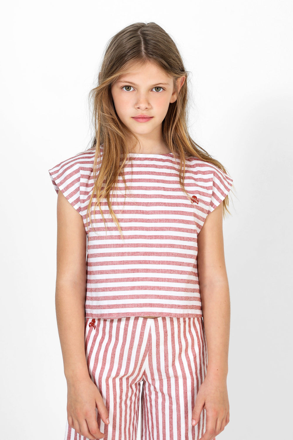 Blusa de rayas confeccionada en tejido mezcla de algodón y lino. Corte Regular Fit, cuello redondo y manga corta. Detalle de calavera bordada en el pecho.