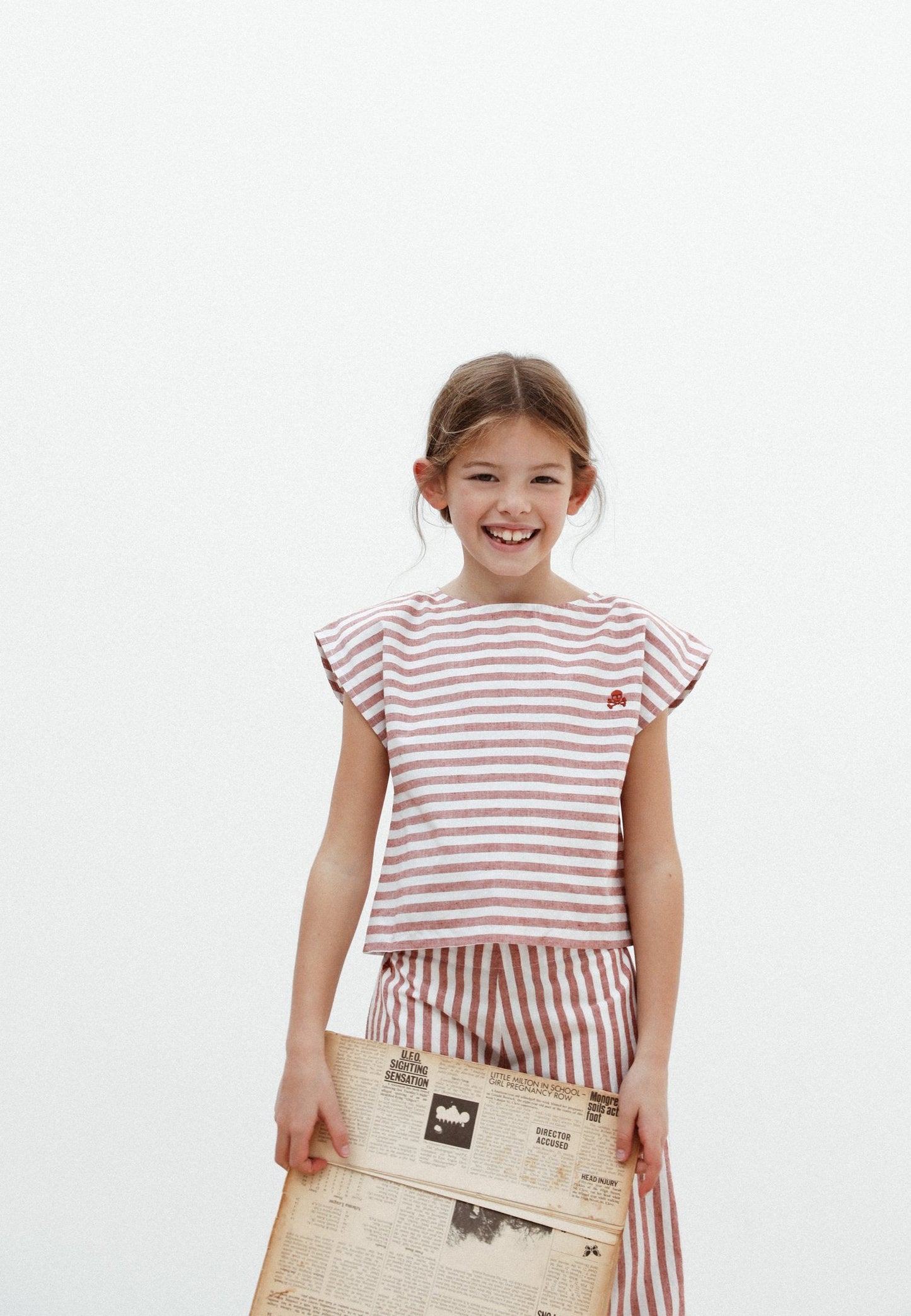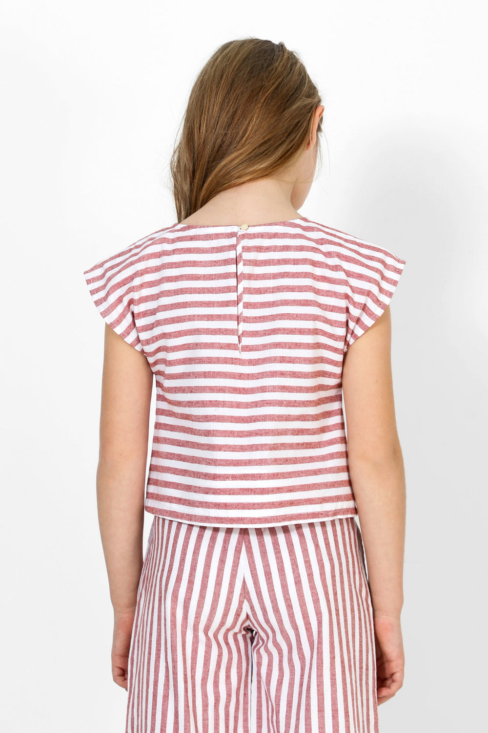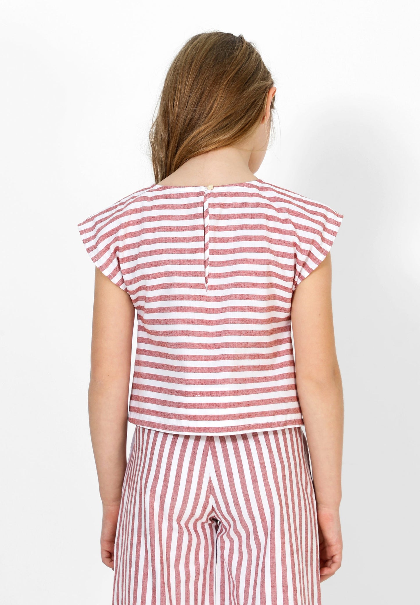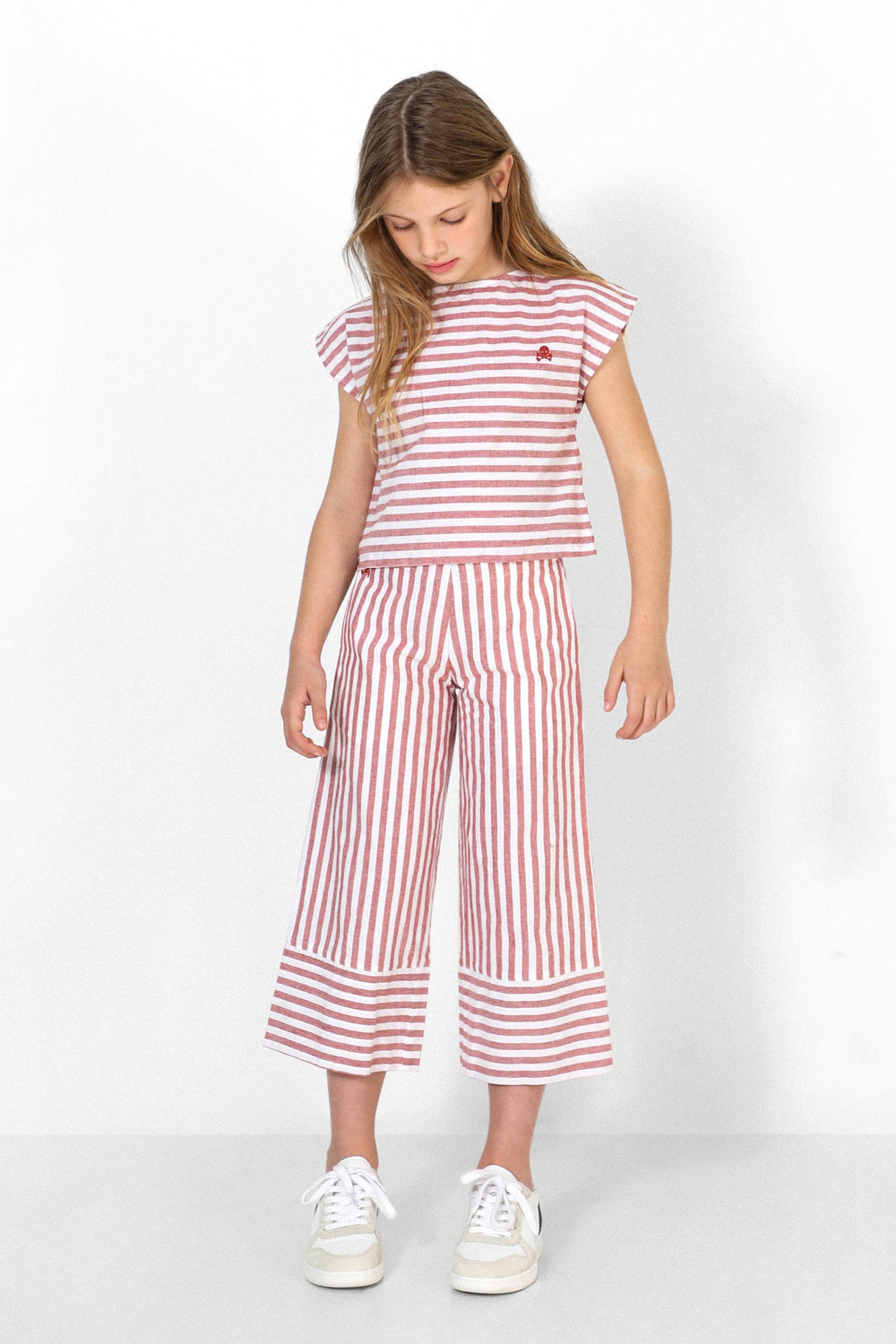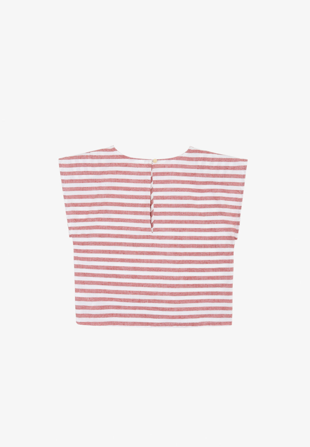 Blusa de rayas confeccionada en tejido mezcla de algodón y lino. Corte Regular Fit, cuello redondo y manga corta. Detalle de calavera bordada en el pecho.