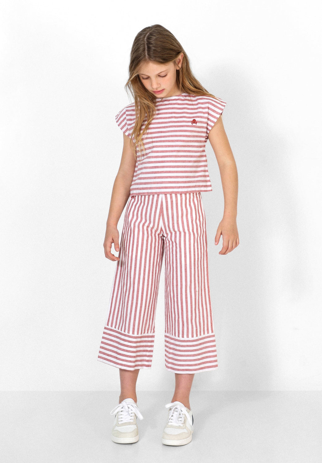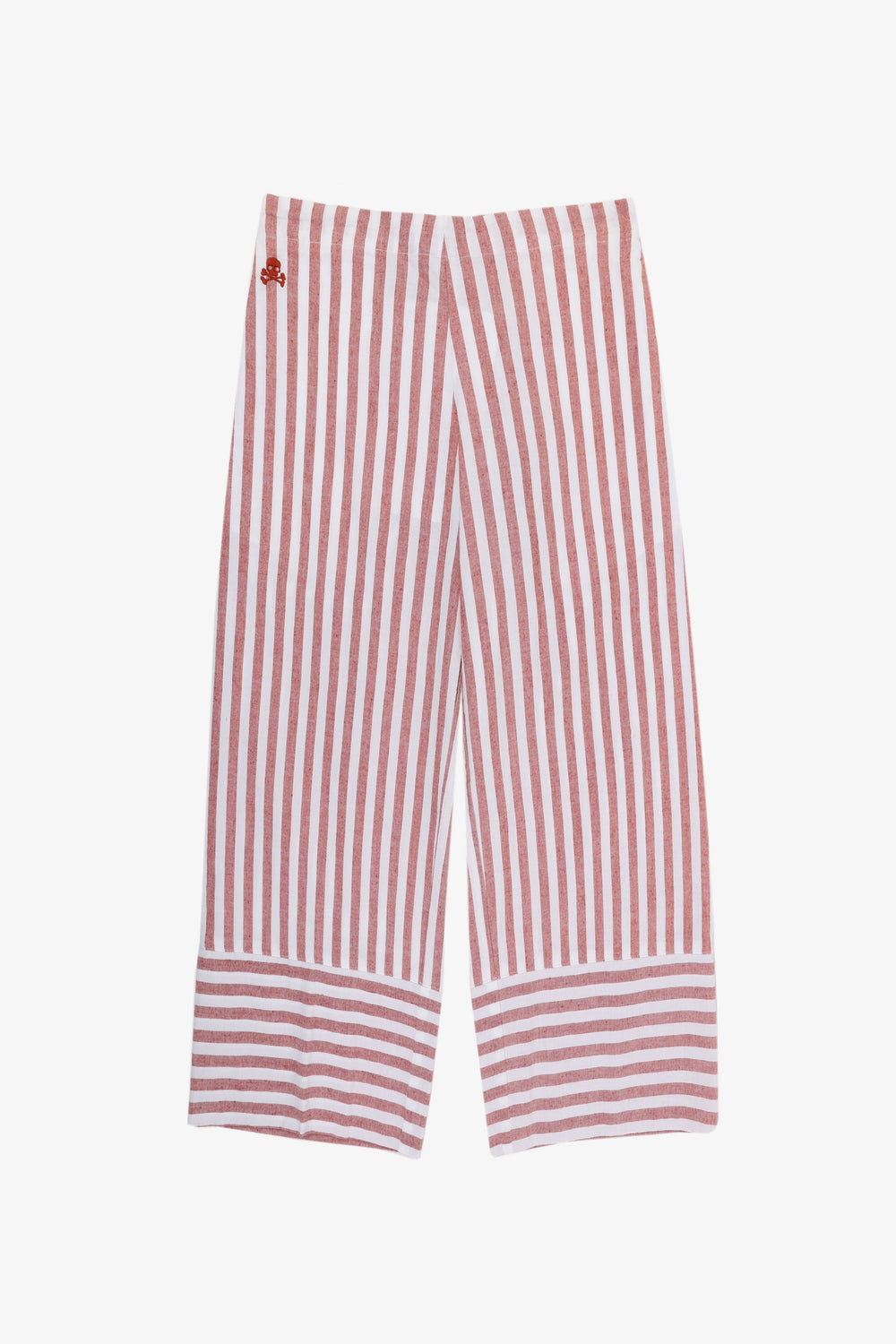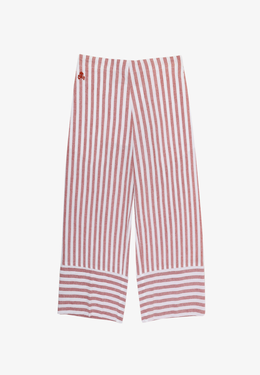 Pantalón con estampado de rayas confeccionados en mezcla de algodón y lino. Corte culotte, cinturilla elástica sin cierre y detalle de calavera bordada.