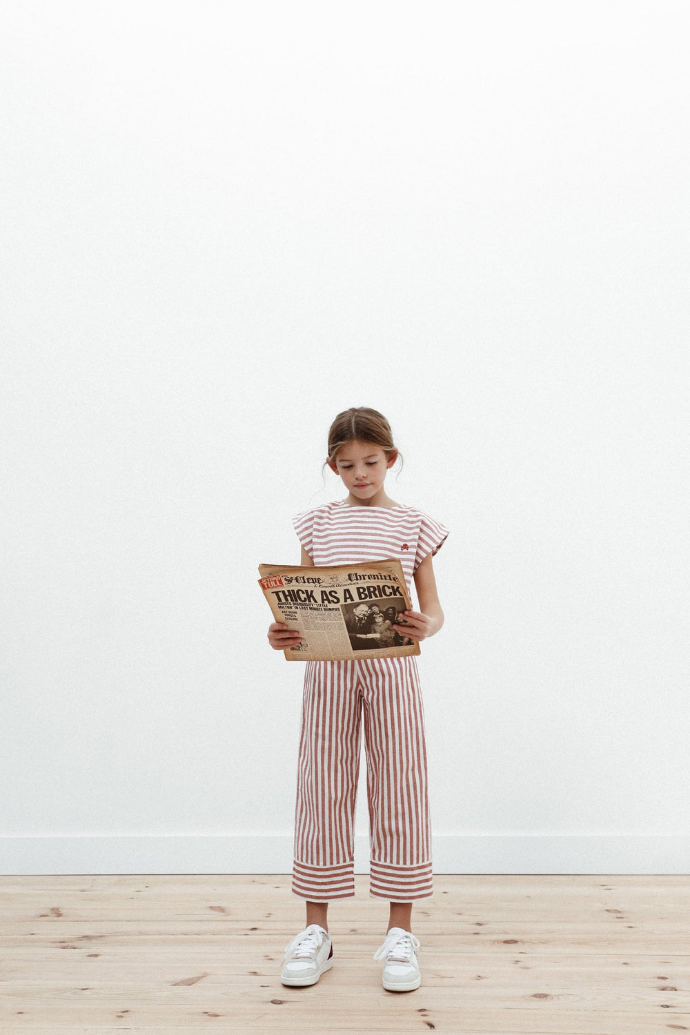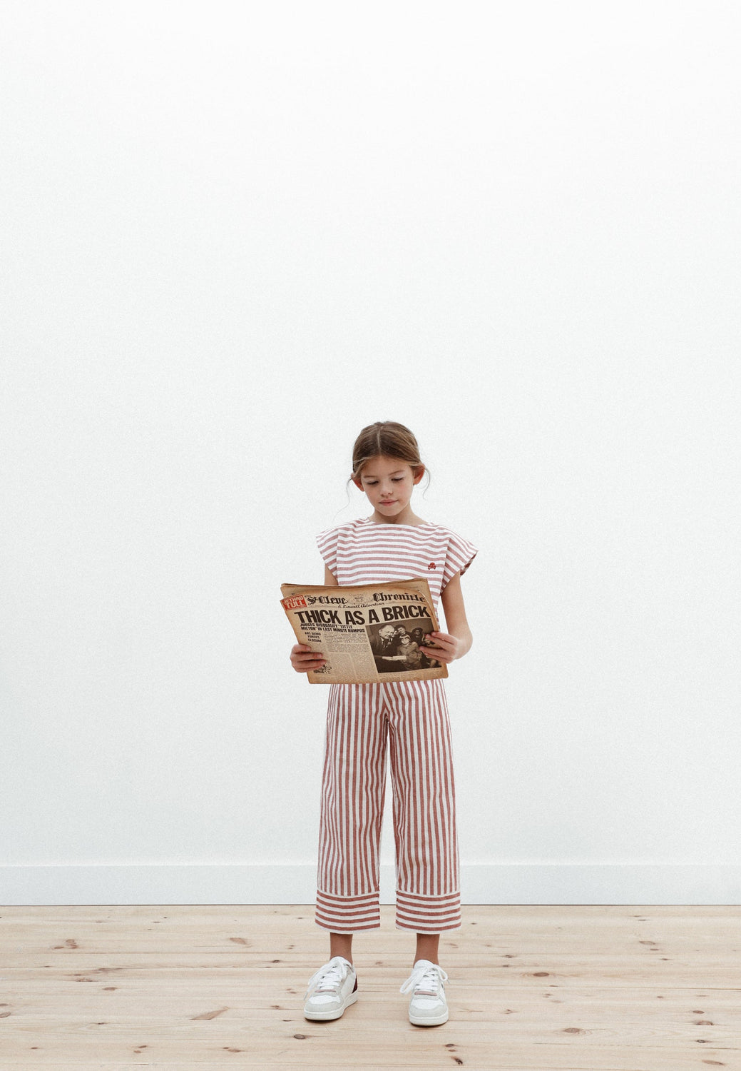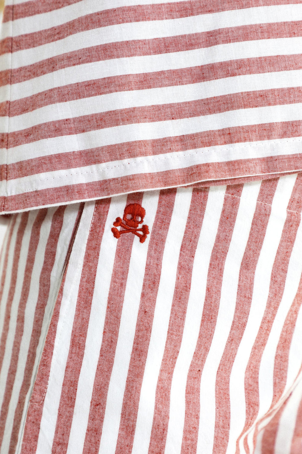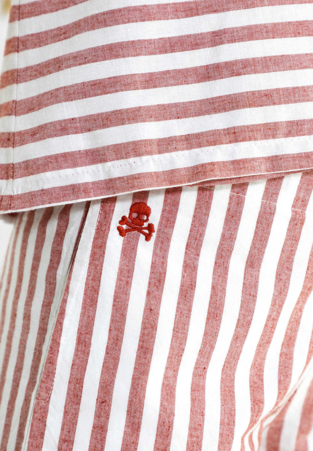 Pantalón con estampado de rayas confeccionados en mezcla de algodón y lino. Corte culotte, cinturilla elástica sin cierre y detalle de calavera bordada.