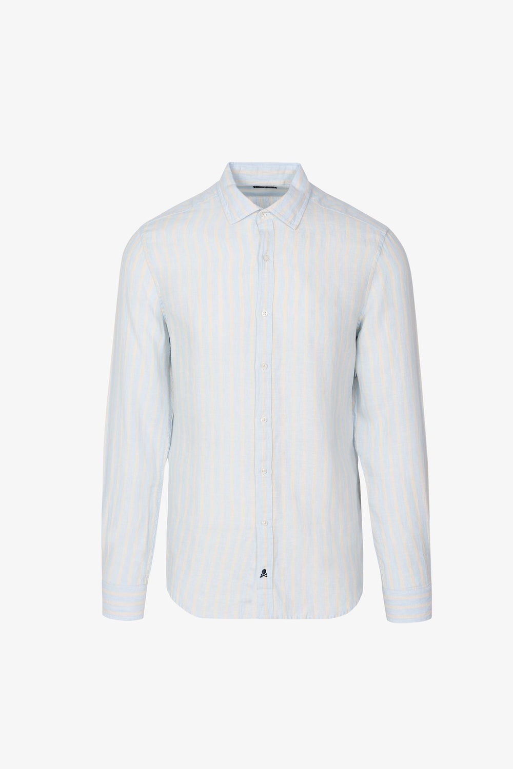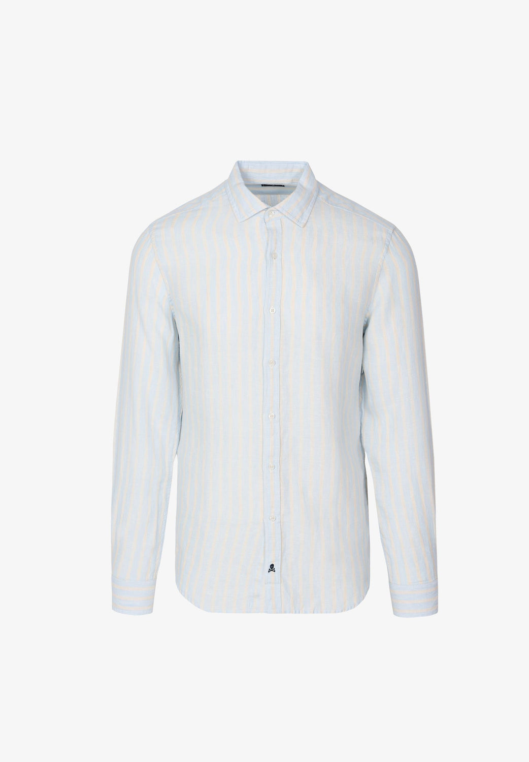 Camisa con estampado de rayas confeccionada en tejido 100% lino. Corte Slim Fit, cuello italiano y cierre con botones. Manga larga terminada en puño con botones.