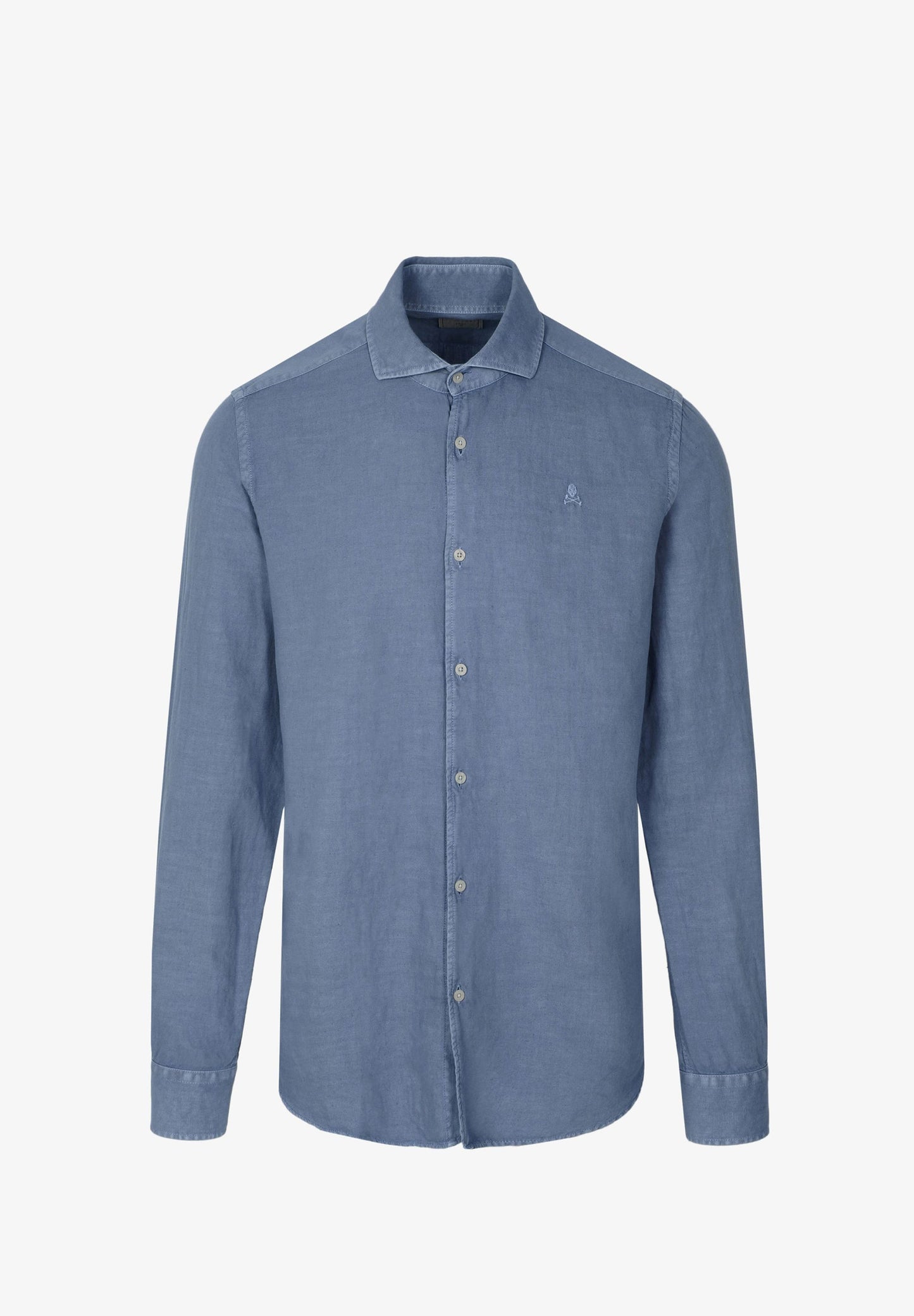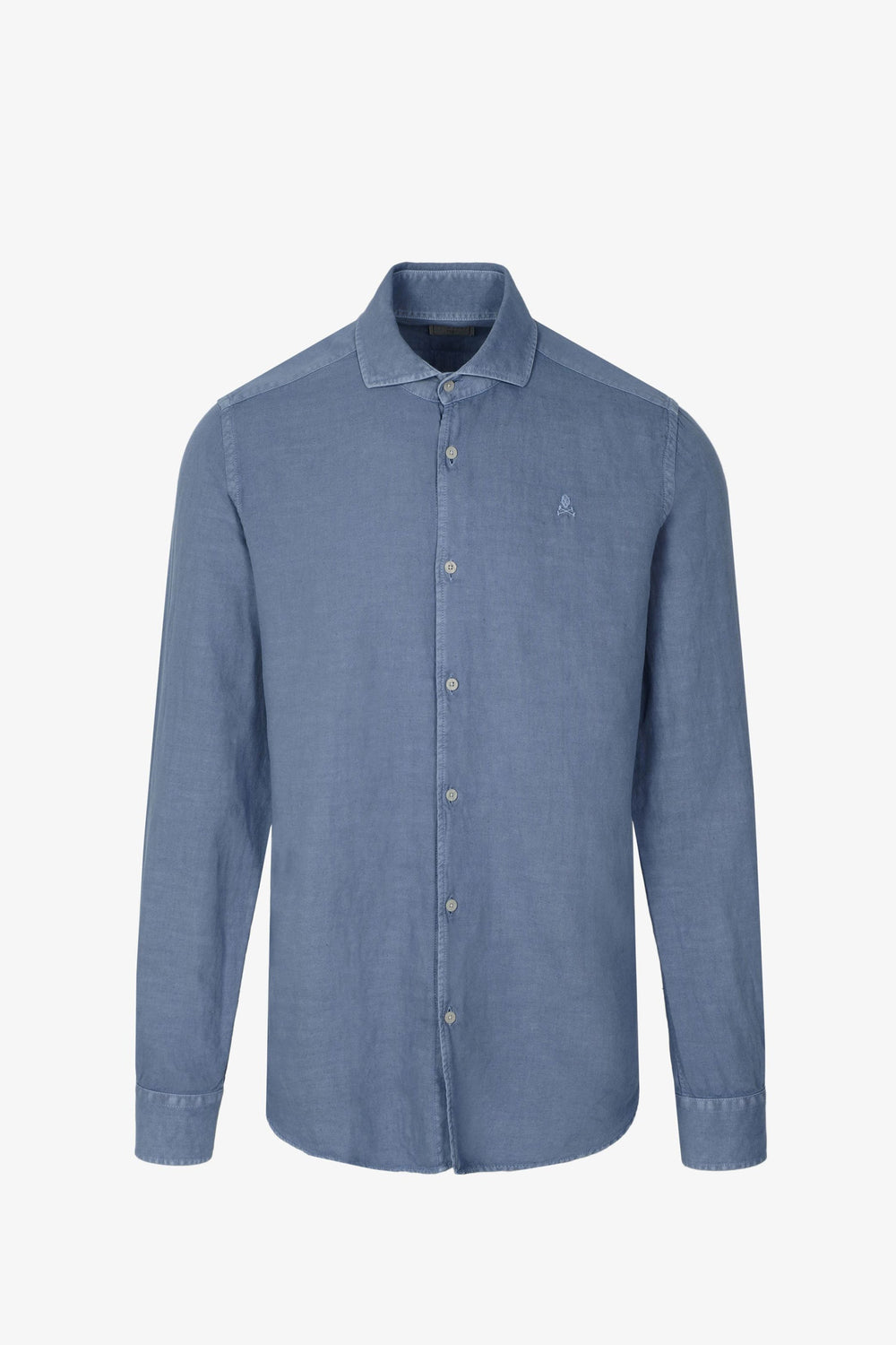 Camisa confeccionada en tejido mezcla de algodón y lino. Corte Regular Fit, cuello cutaway y cierre con botones. Manga larga terminada en puño con botones y detalle de calavera a tono.