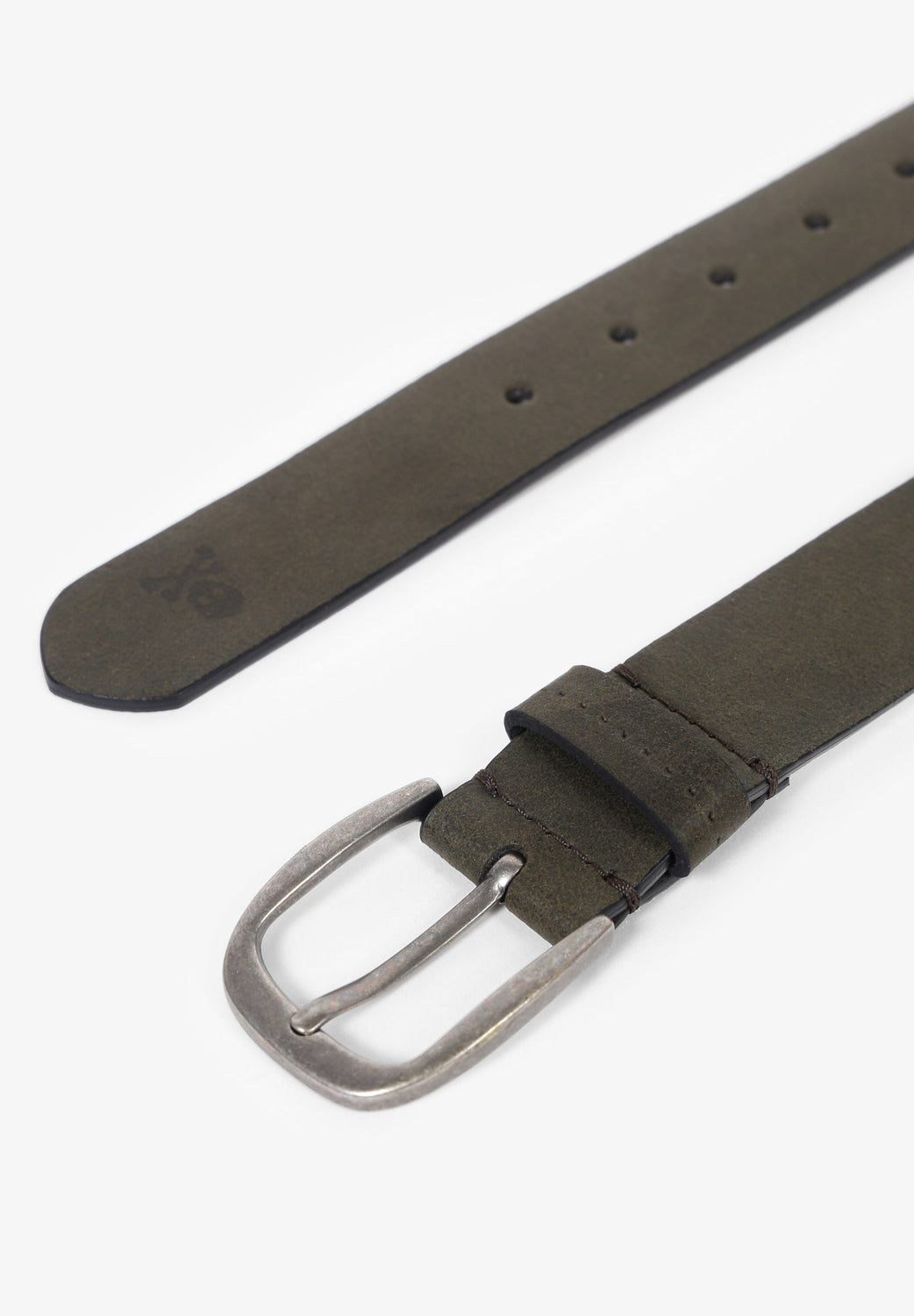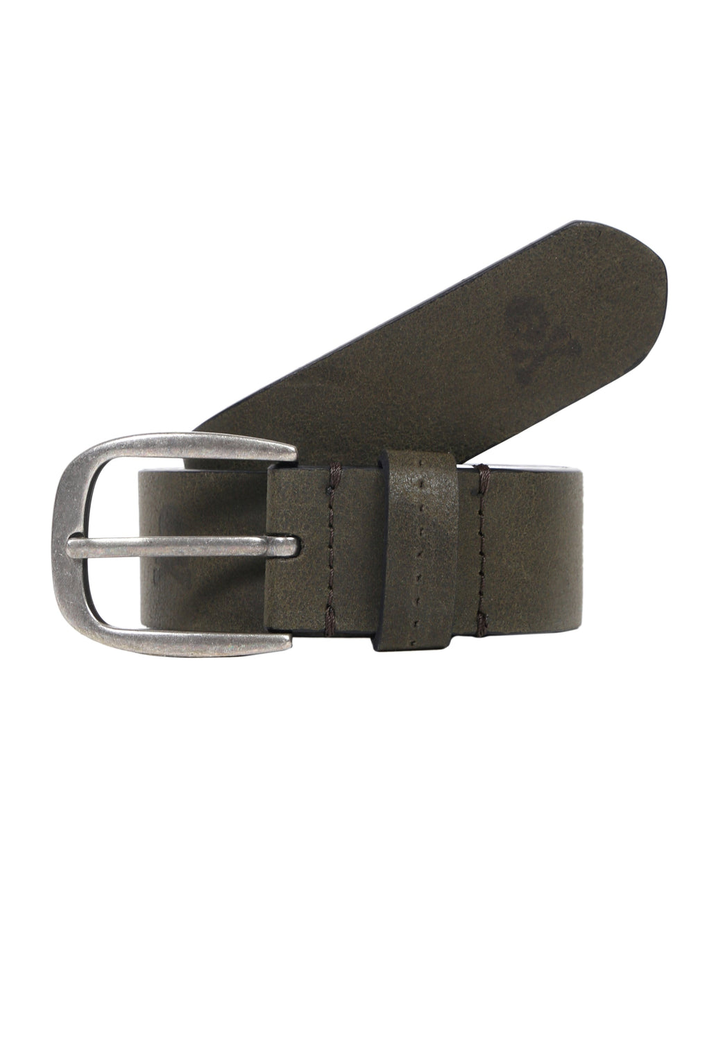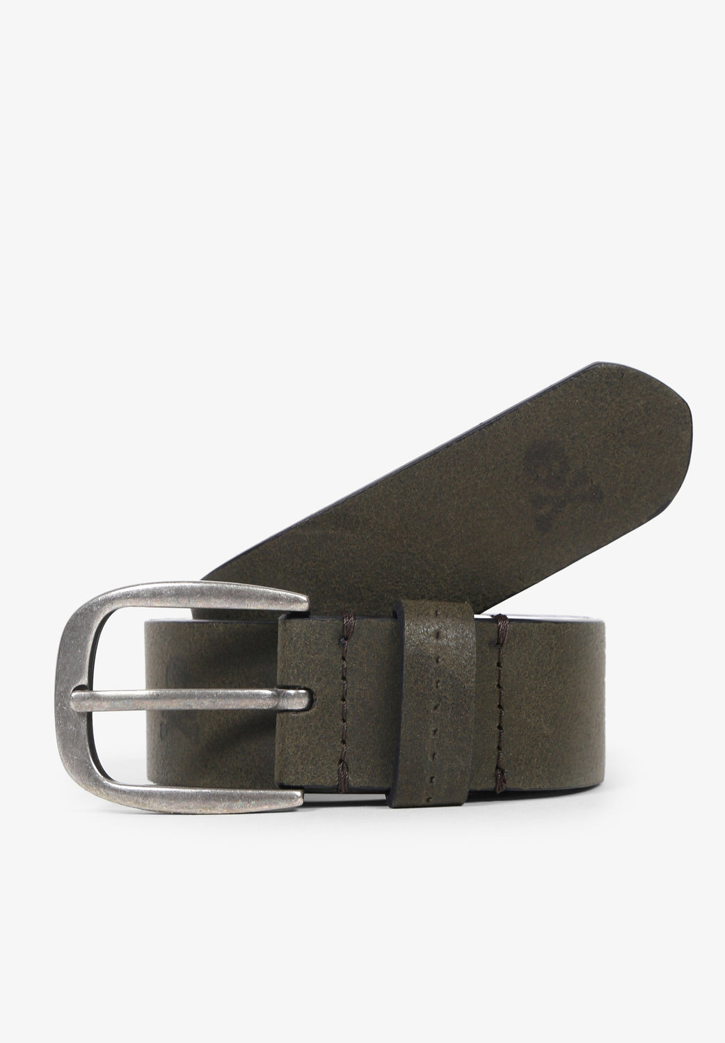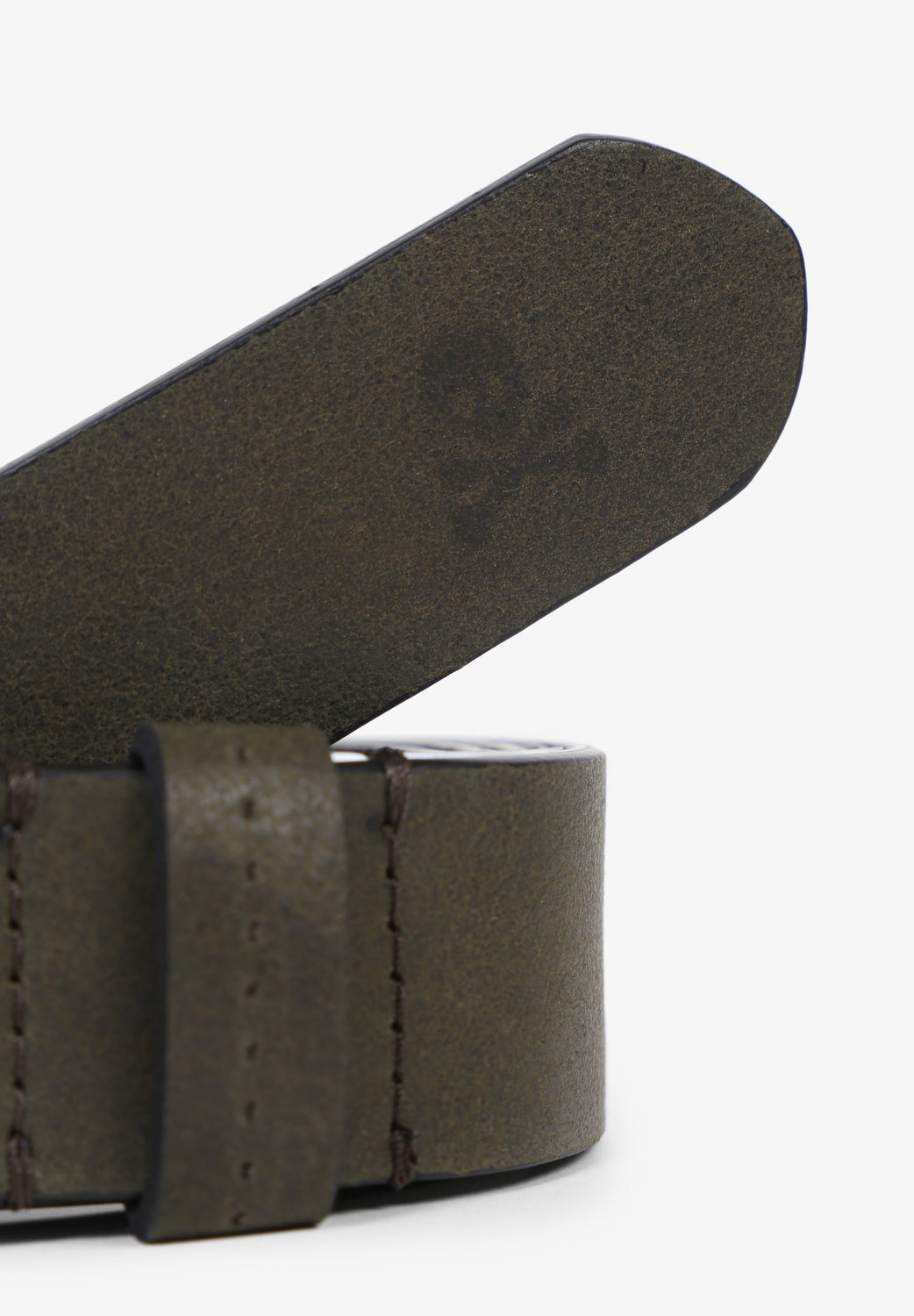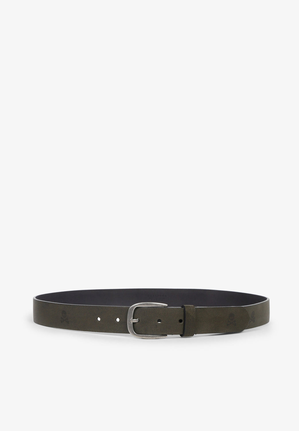 Cinturón confeccionado en piel vegana sostenible. Cierre con hebilla metálica y detalle de grabado de calavera.