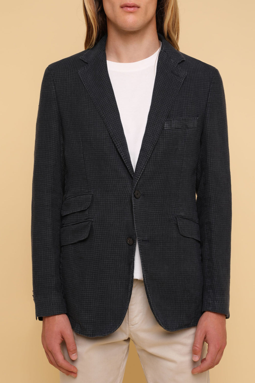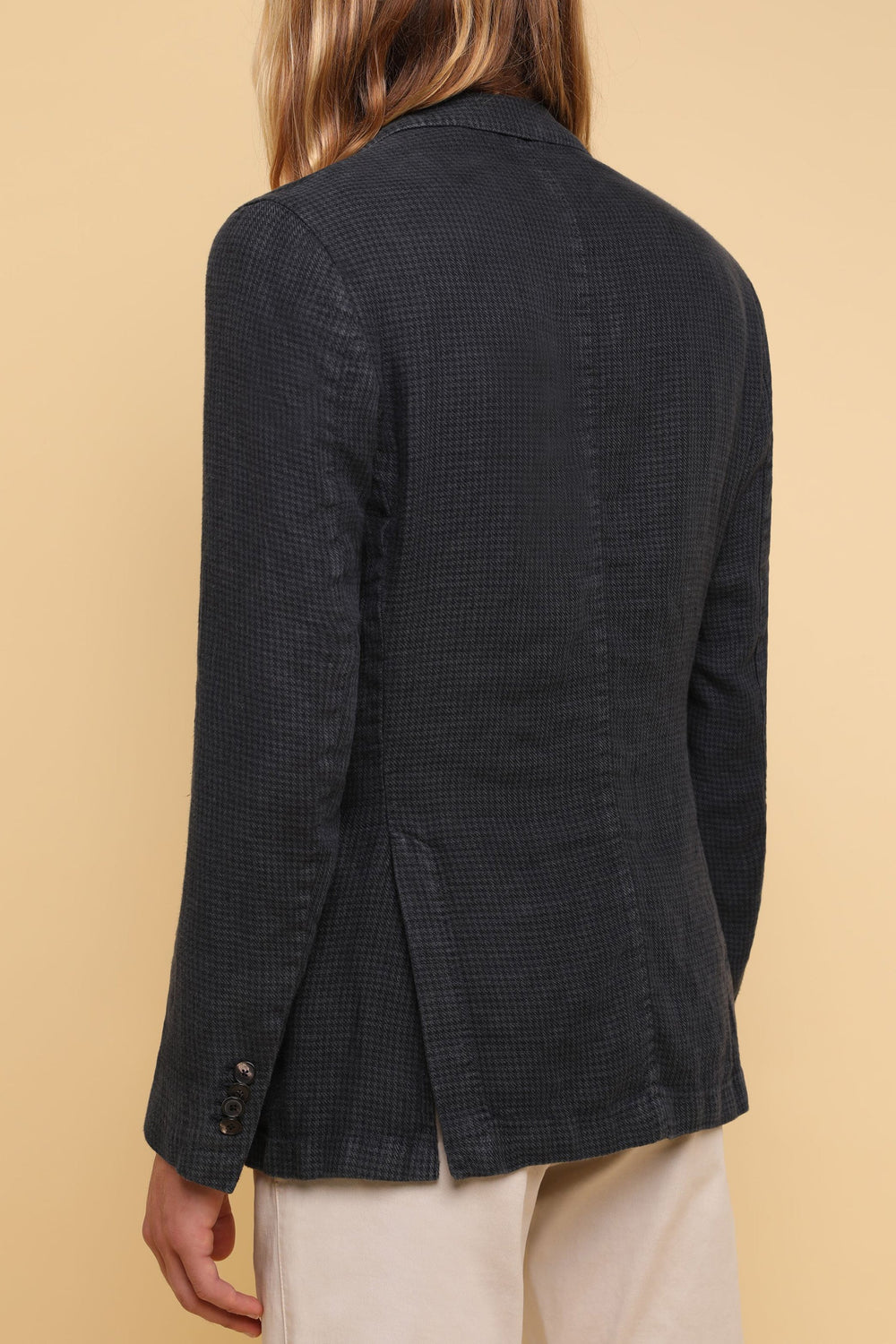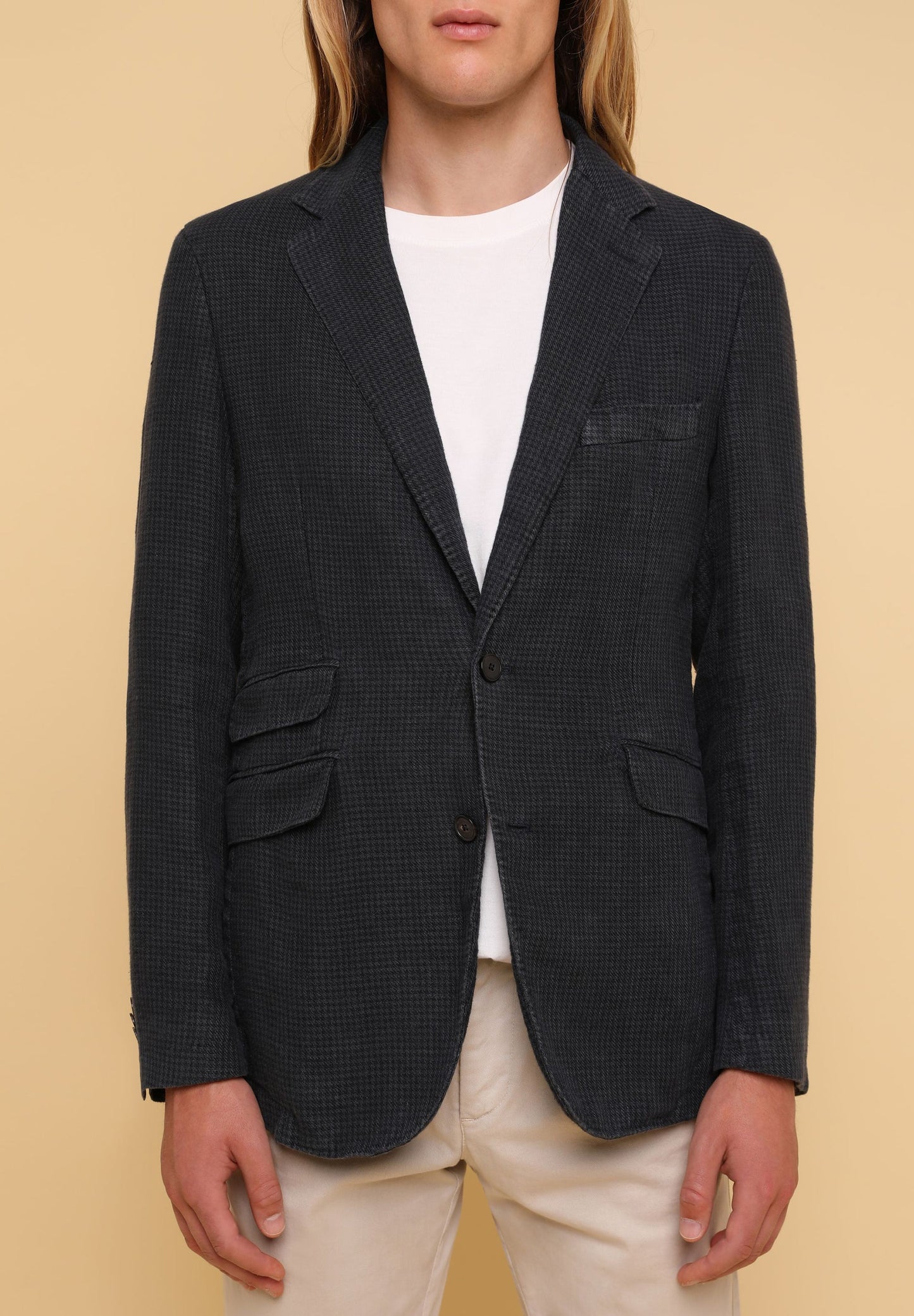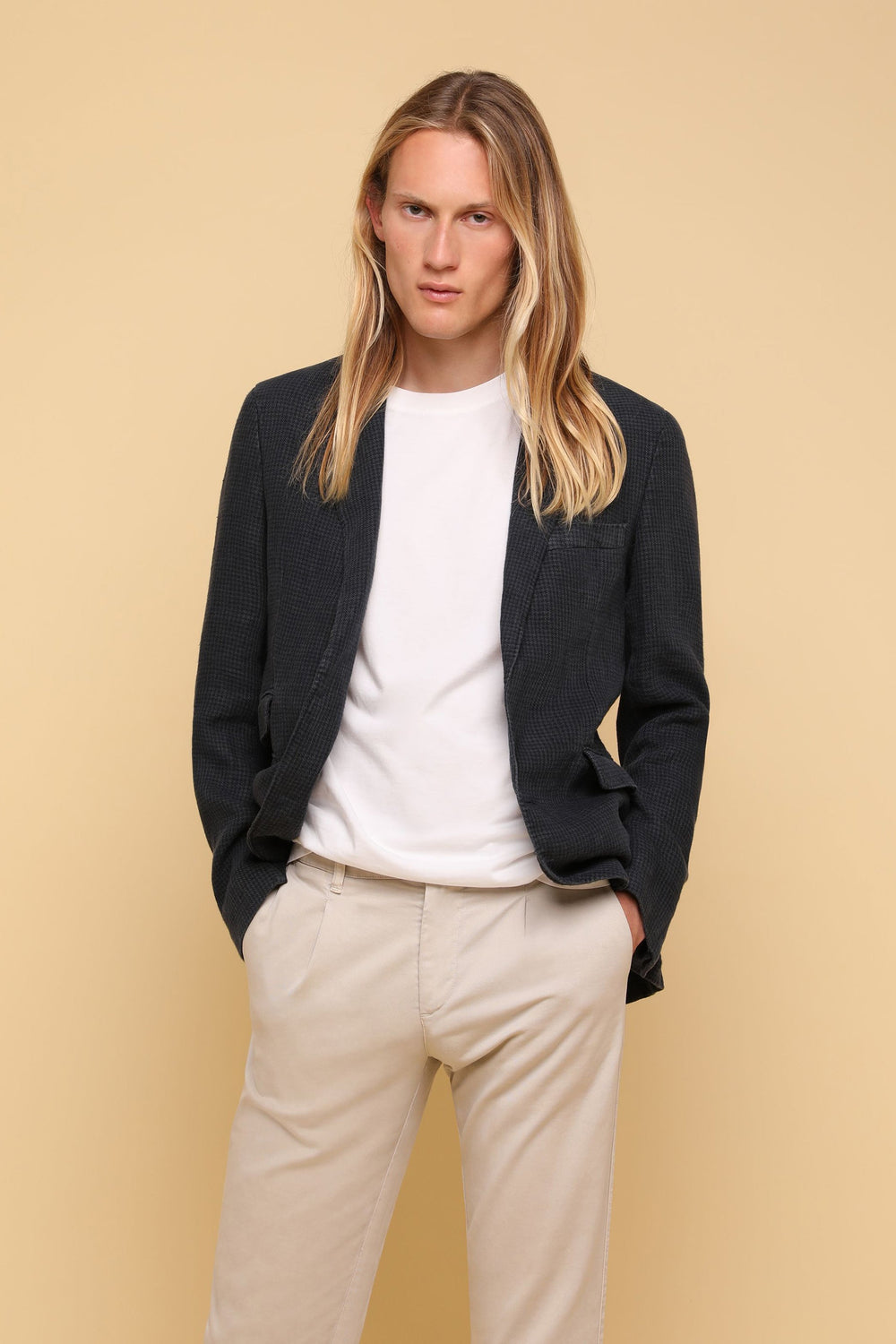 Americana confeccionada en tejido 100% lino. Corte Regular Fit, cuello con solapas de muesca y cierre con botones. Manga larga terminada en puño con botones y bolsillo insertado en el pecho y con tapeta en el bajo.