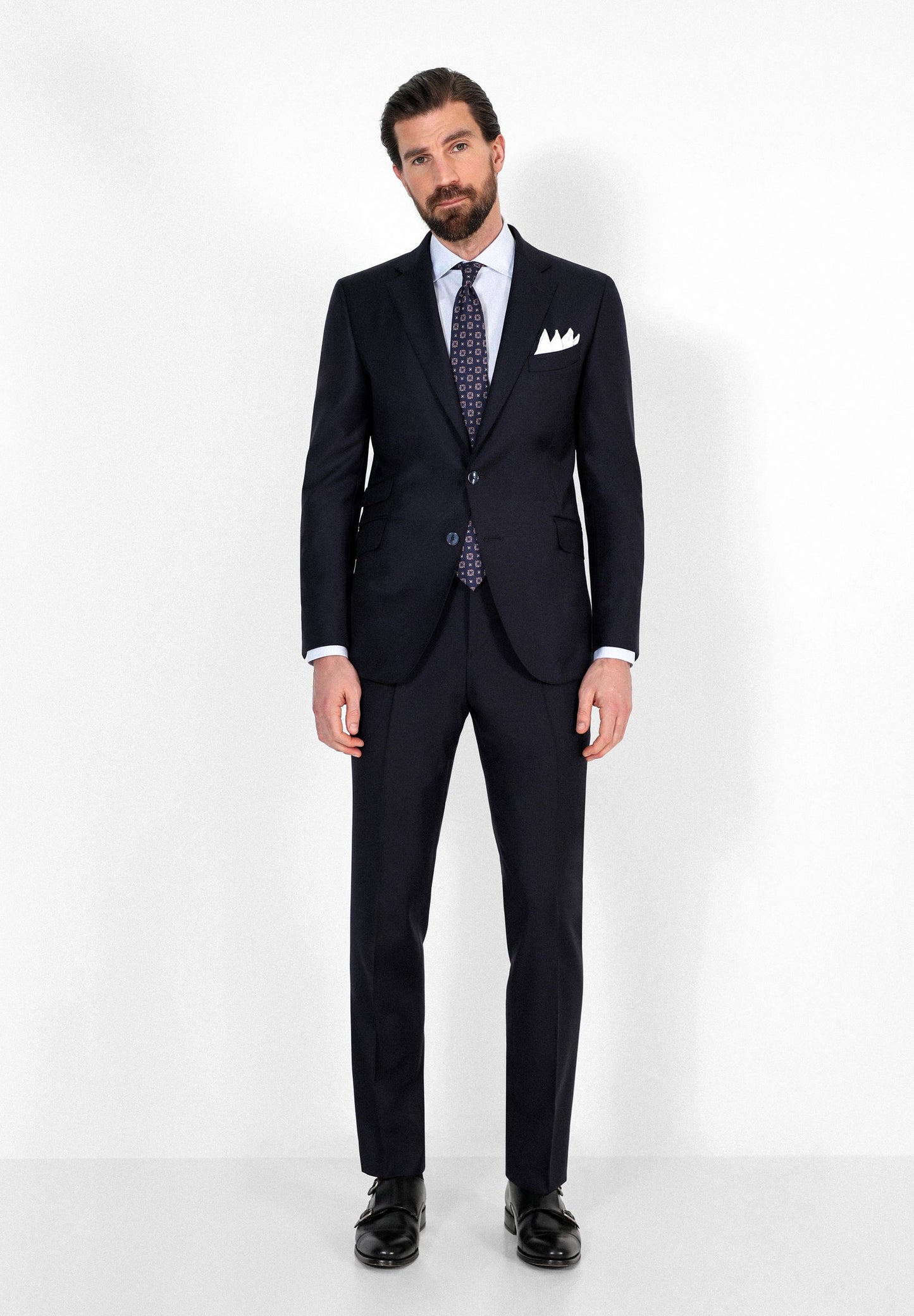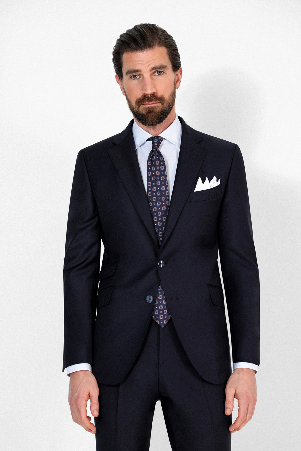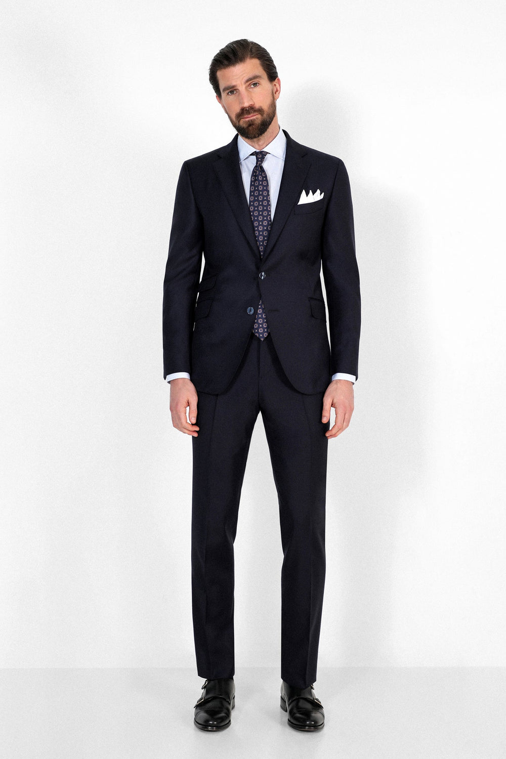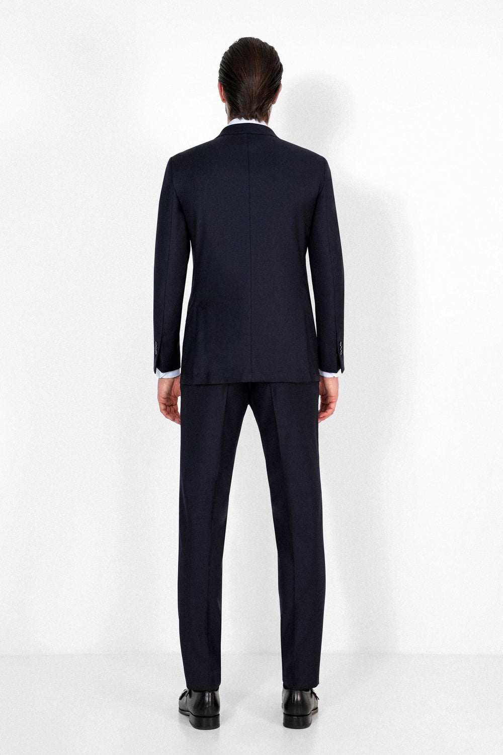 Traje confeccionado en tejido 100% lana. Americana de corte Regular Fit, cuello con solapas de muesca y cierre con botones, manga larga terminada en puño con botones y bolsillo insertado. Pantalón de corte Regular Fit, cierre con botón y cremallera y bolsillos laterales.