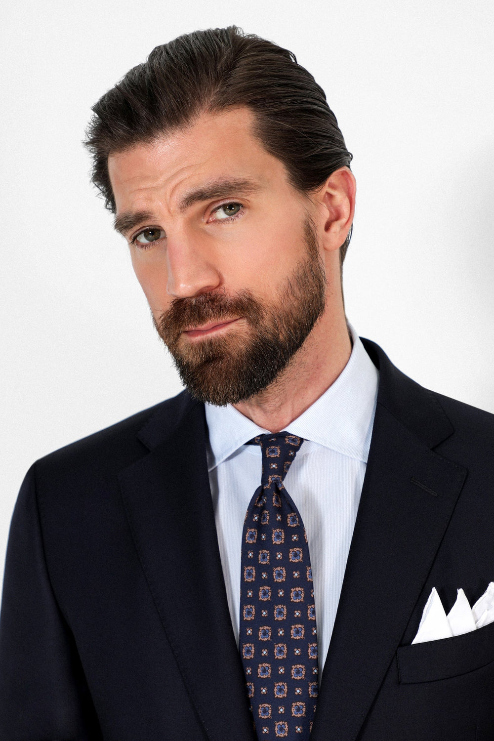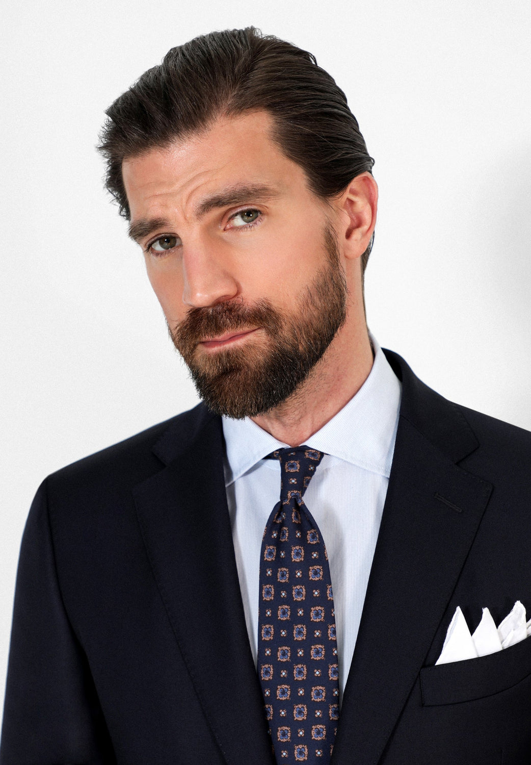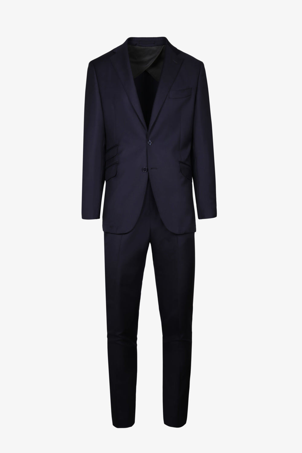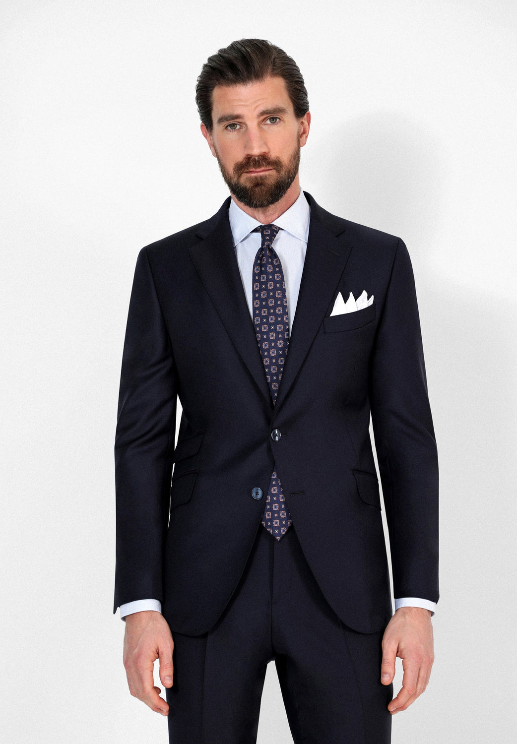 Traje confeccionado en tejido 100% lana. Americana de corte Regular Fit, cuello con solapas de muesca y cierre con botones, manga larga terminada en puño con botones y bolsillo insertado. Pantalón de corte Regular Fit, cierre con botón y cremallera y bolsillos laterales.