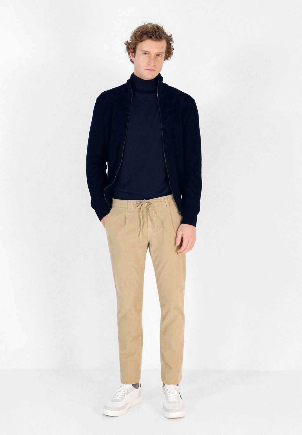 Pantalón confeccionado en tejido de pana. Corte Regular Fit con cintura elástica, cierre con cremallera, botón y lazada y bolsillos laterales.