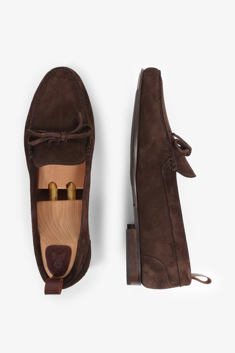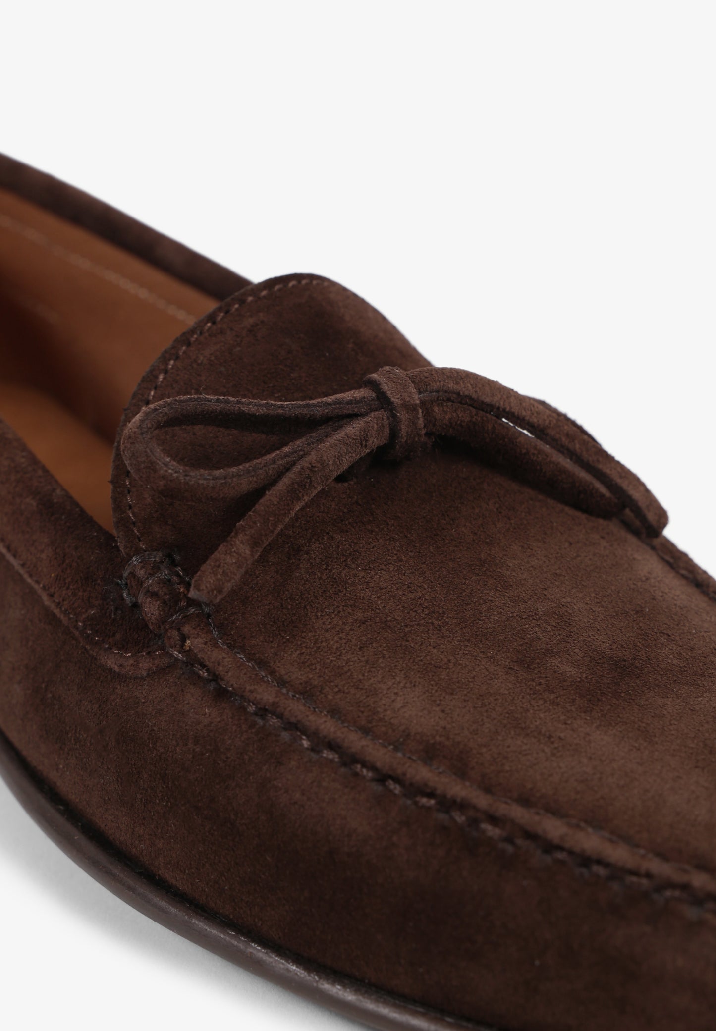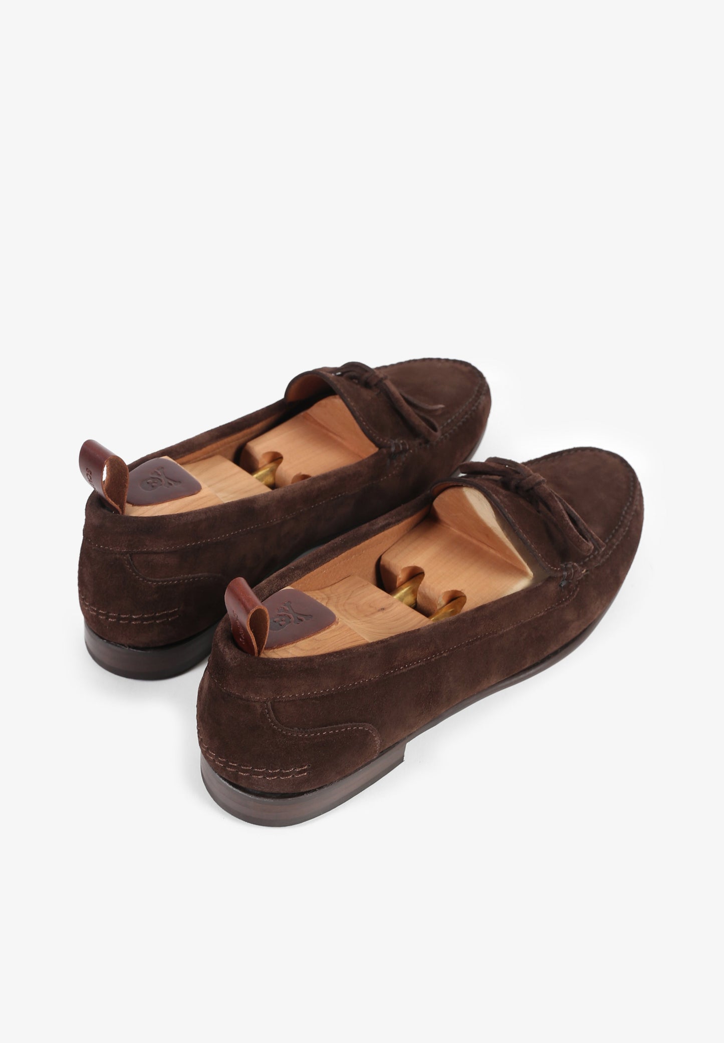 Mocasines confeccionados en piel con acabado en ante. Suela de goma y detalle de lazo frontal.