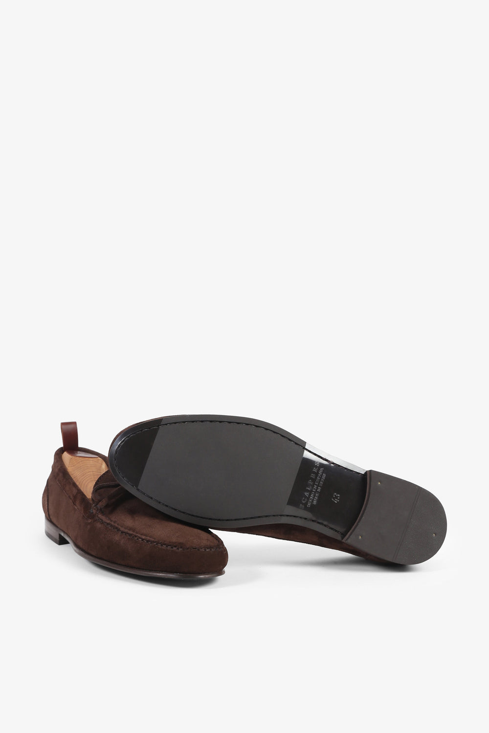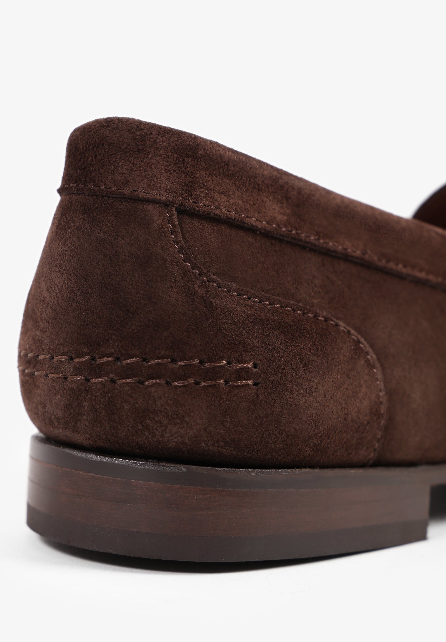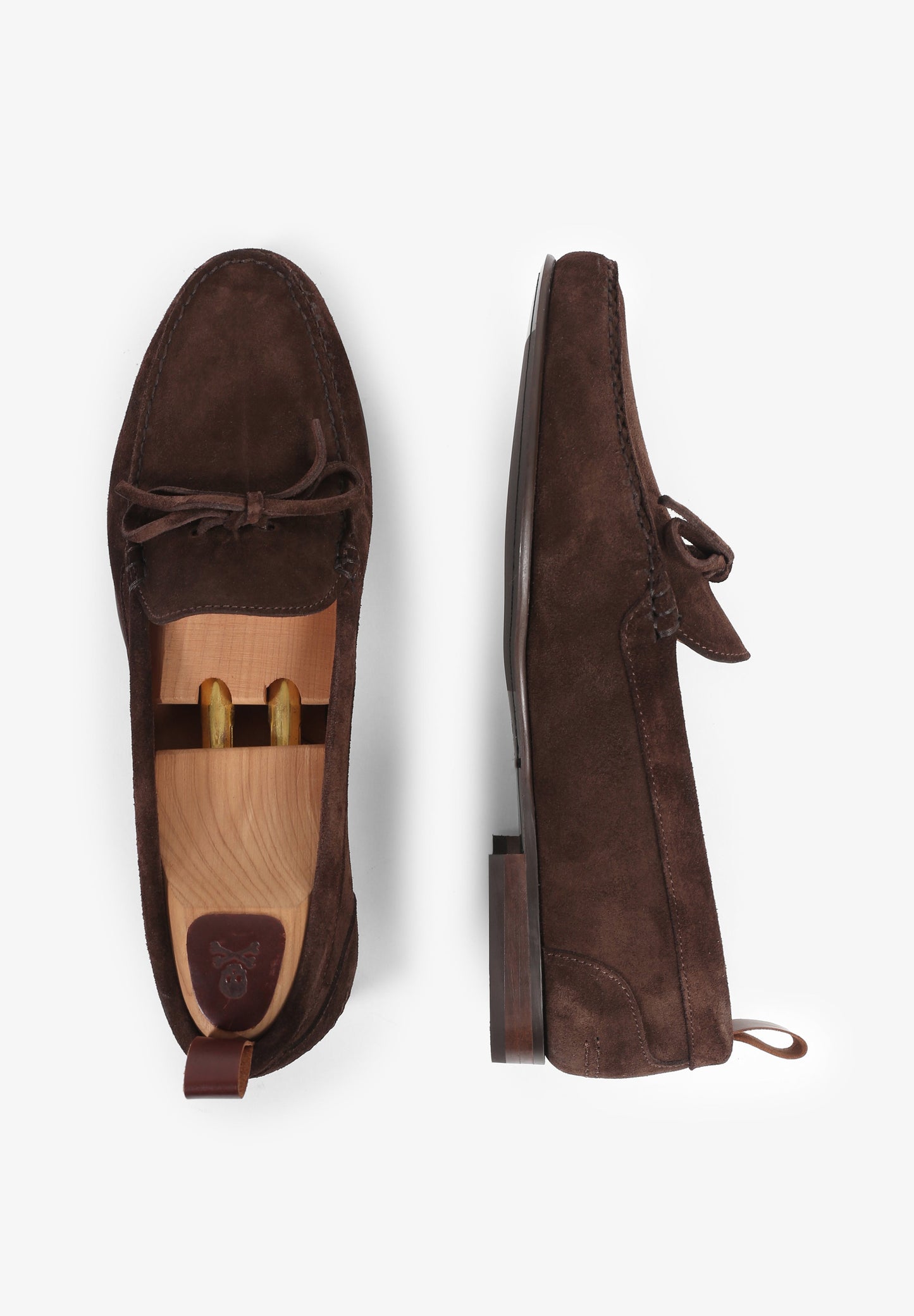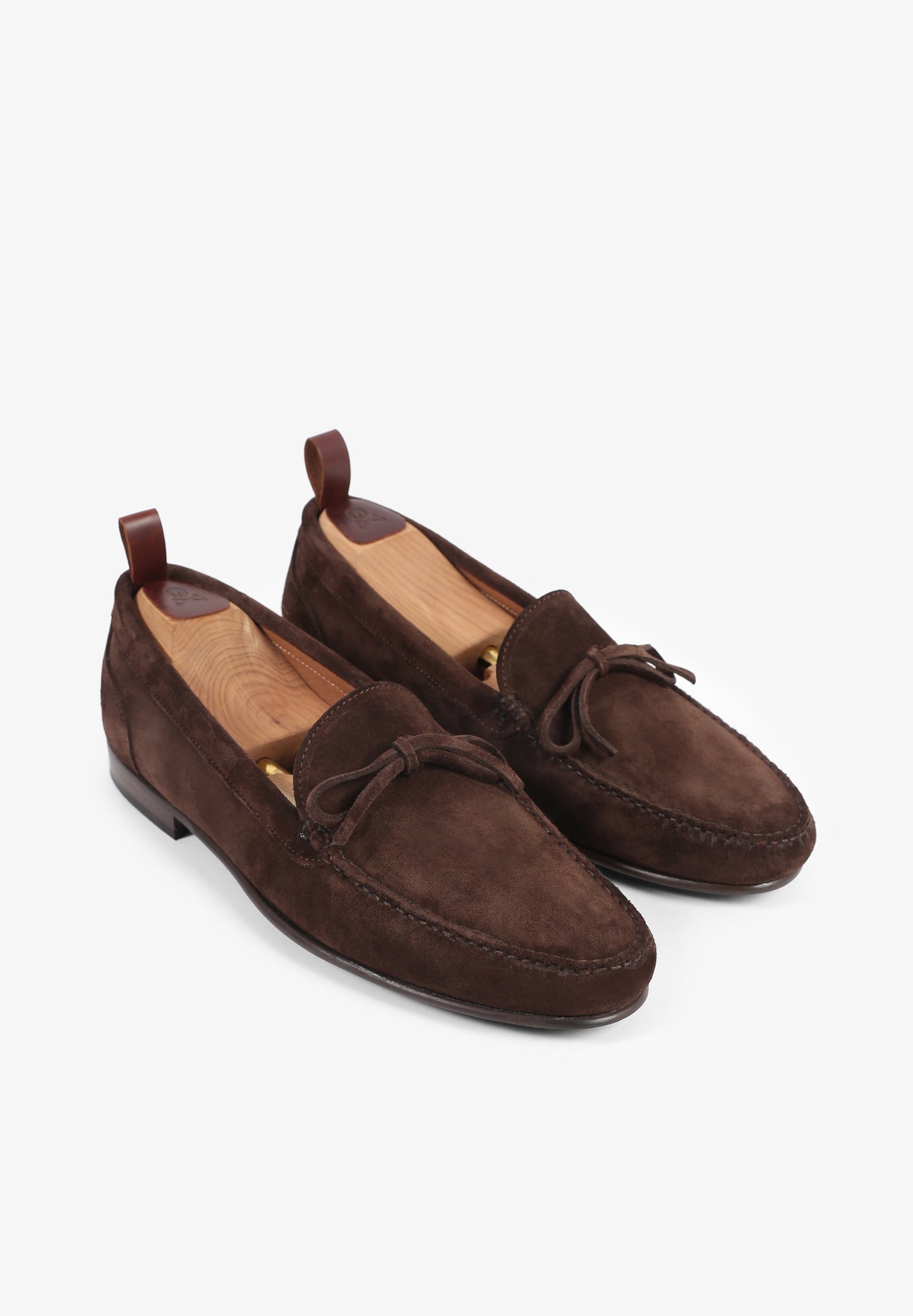 Mocasines confeccionados en piel con acabado en ante. Suela de goma y detalle de lazo frontal.
