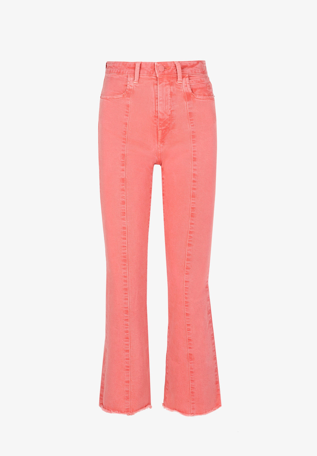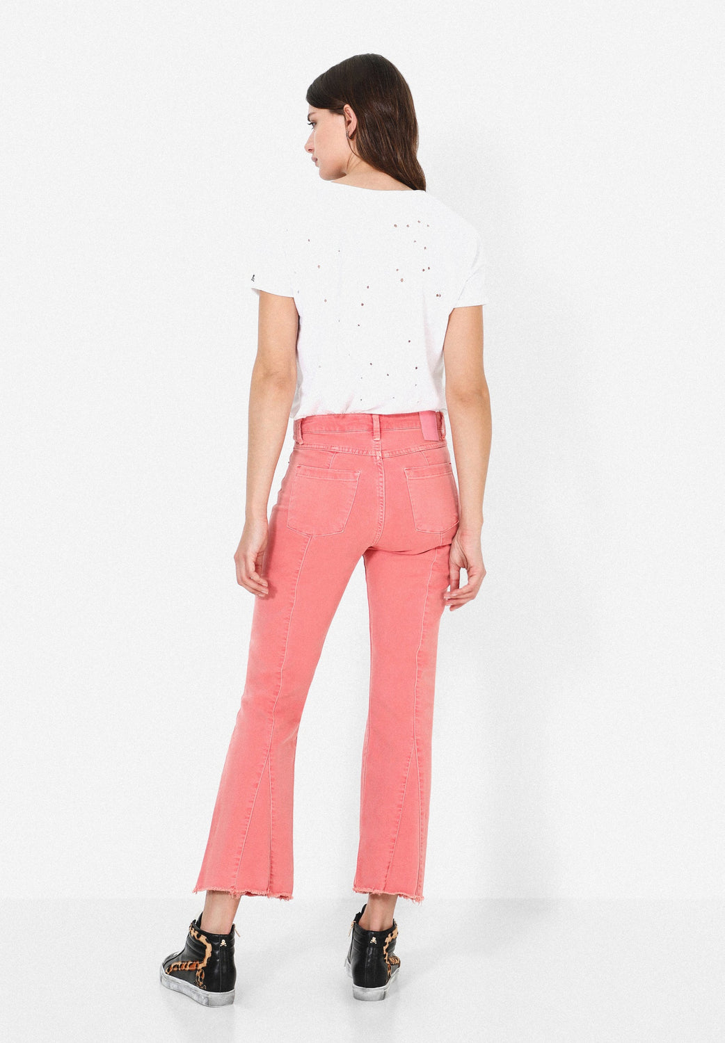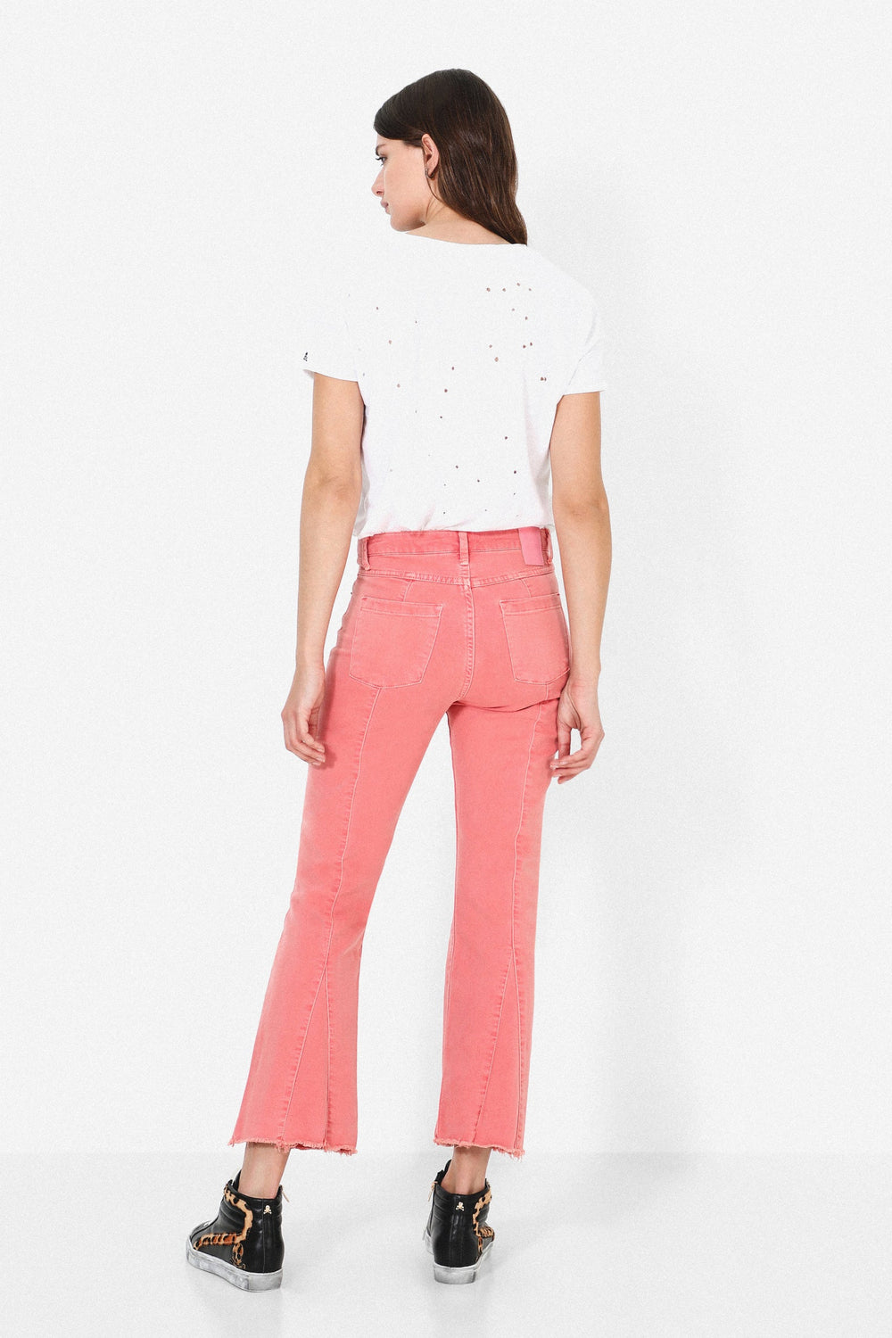 Jeans confeccionados en tejido de algodón ligeramente elástico. Corte flare tobilelro con tiro alto, cierre con botón y cremallera y bolsillos insertados y traseros. Tiene trabillas y detalle de costuras.