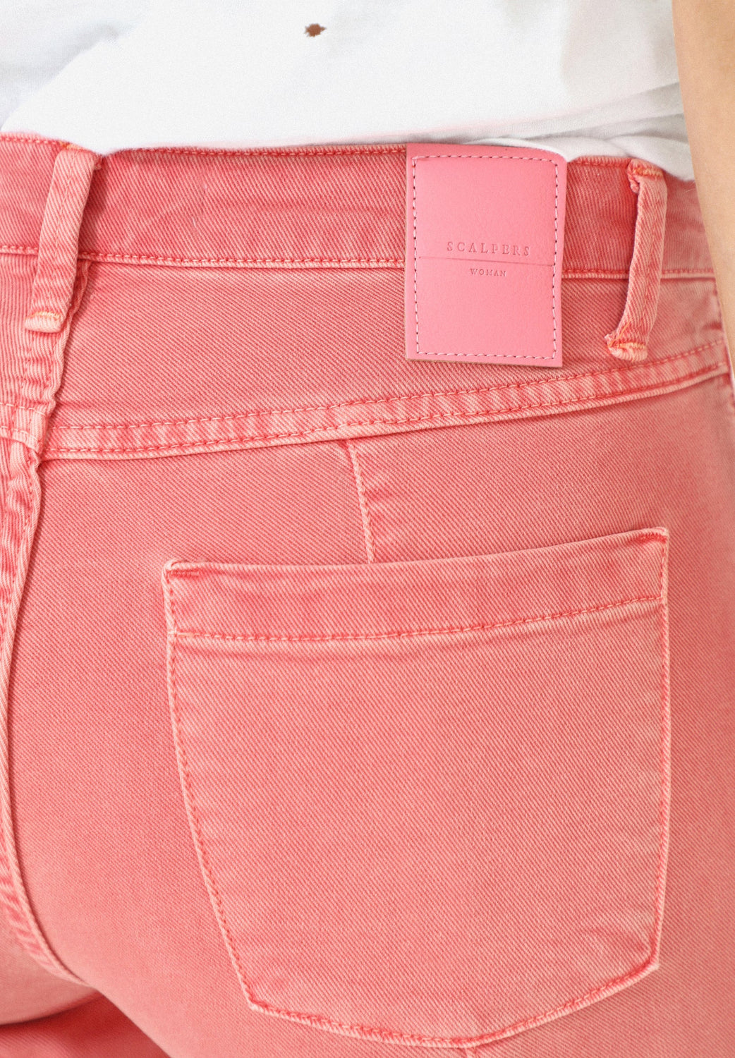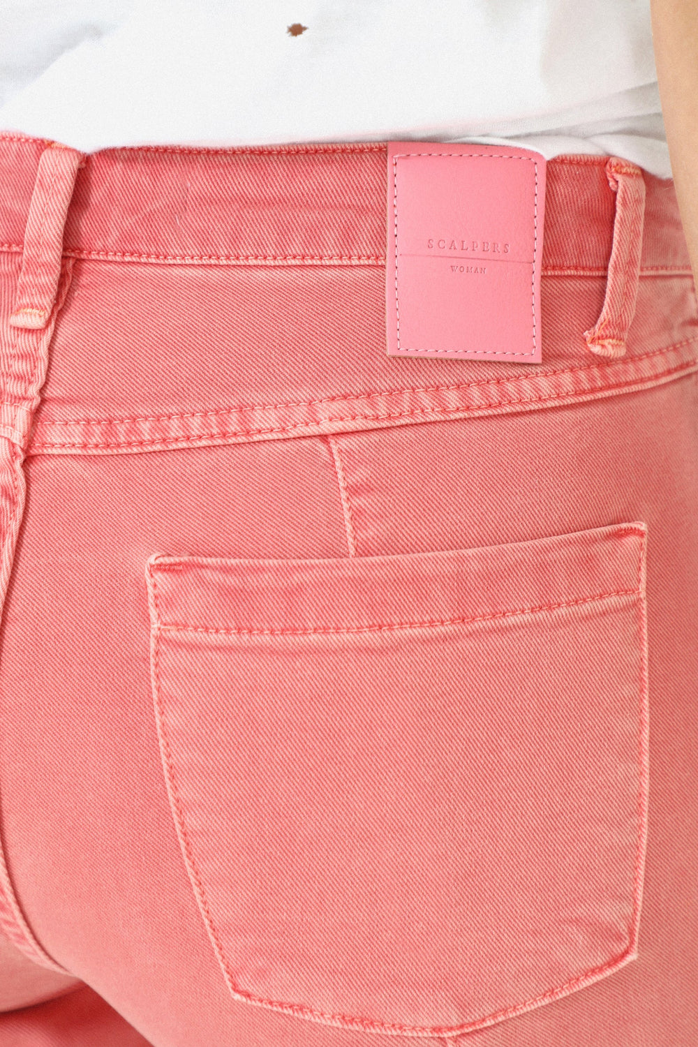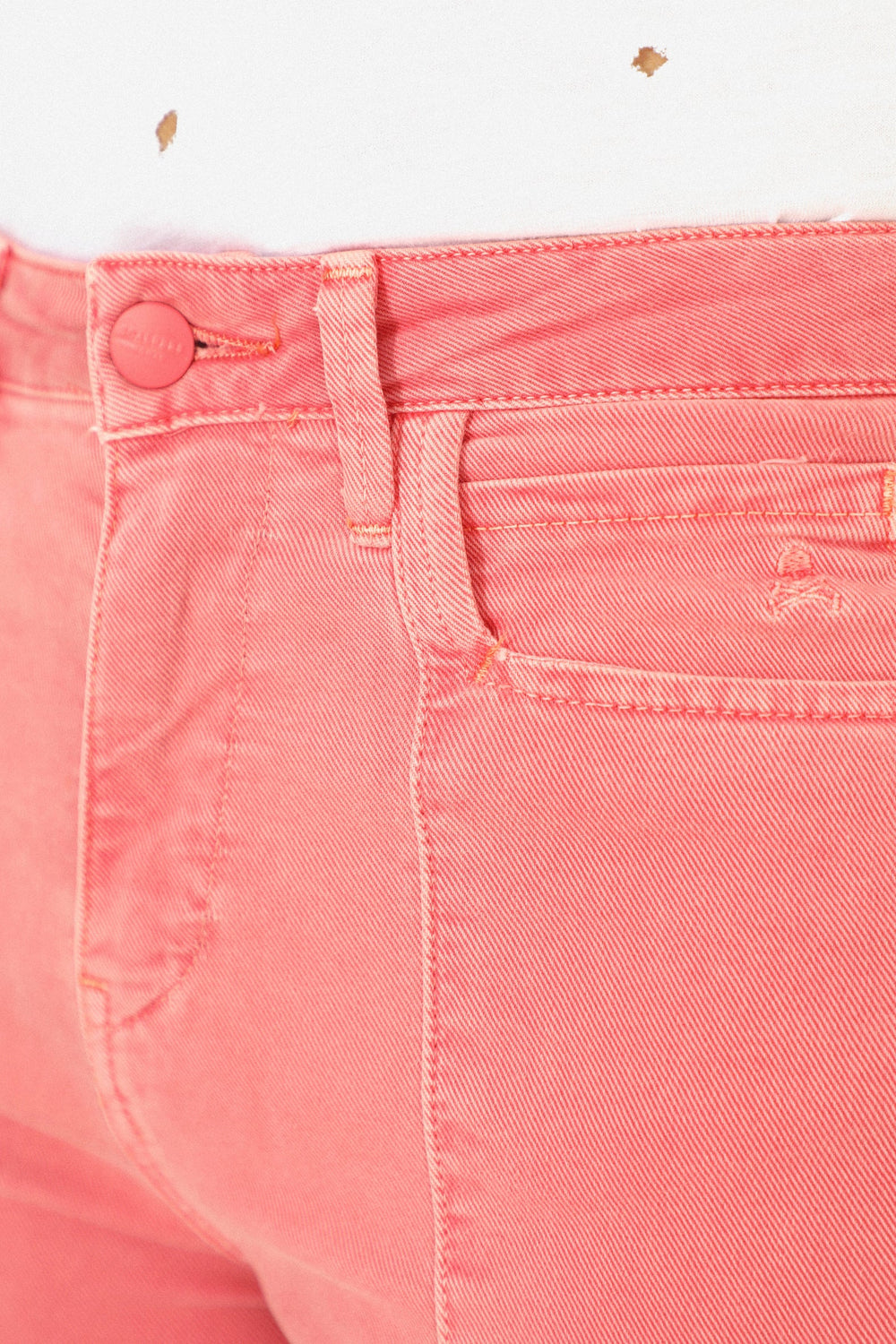 Jeans confeccionados en tejido de algodón ligeramente elástico. Corte flare tobilelro con tiro alto, cierre con botón y cremallera y bolsillos insertados y traseros. Tiene trabillas y detalle de costuras.