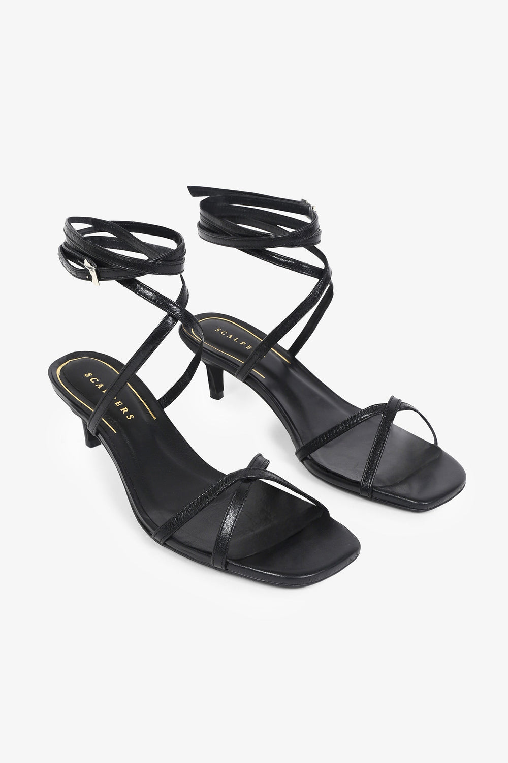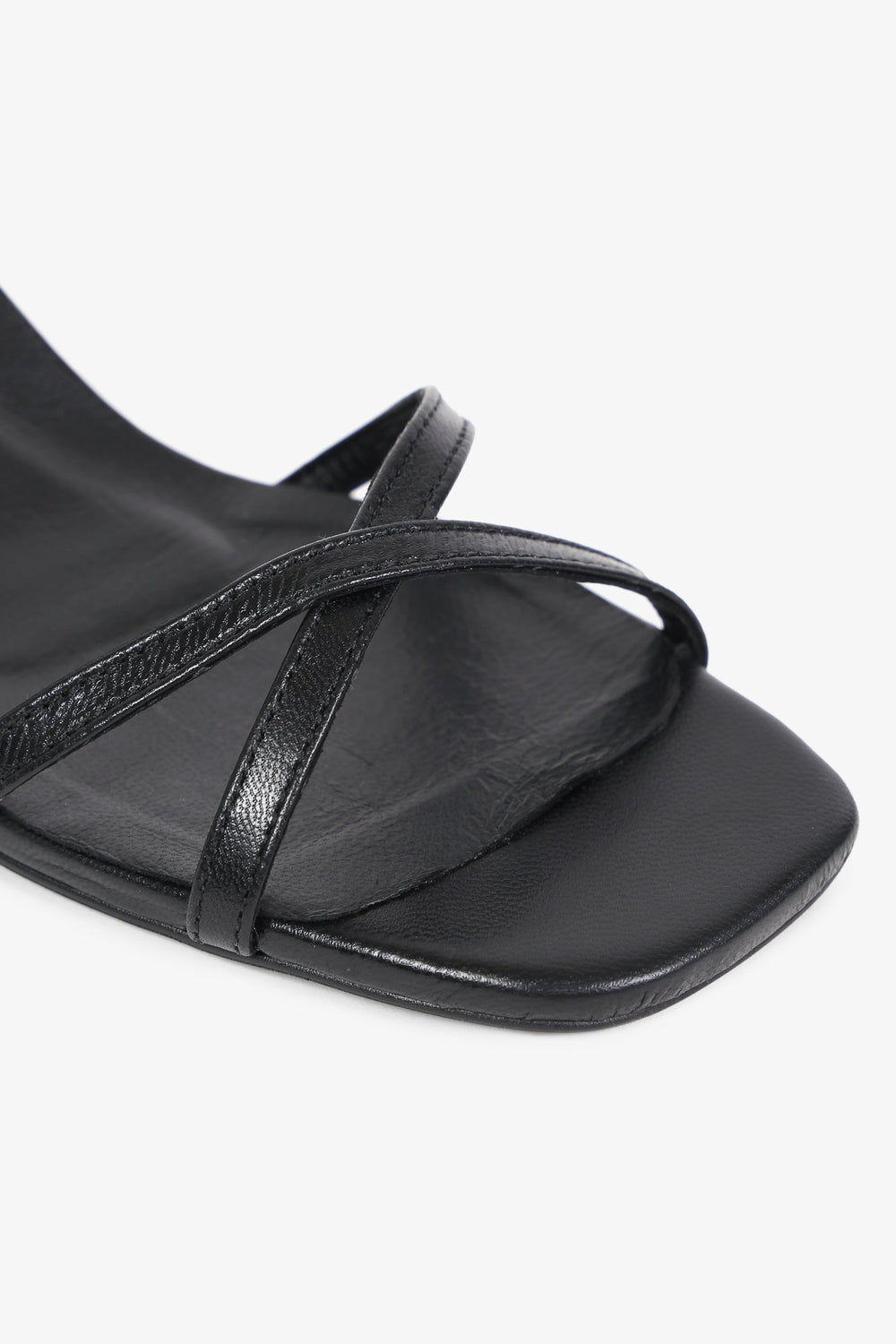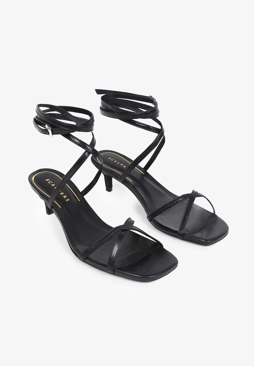 Sandalias con tacón confeccionadas en piel. Doble tira al tobillo con cierre de hebilla y doble tira delantera. Suela de goma.