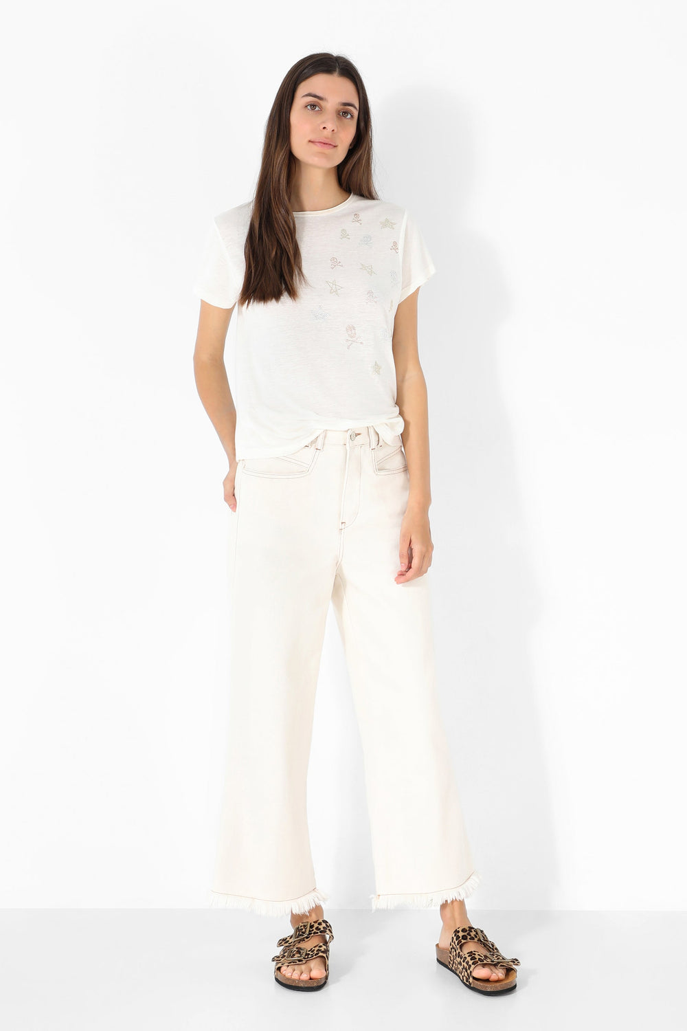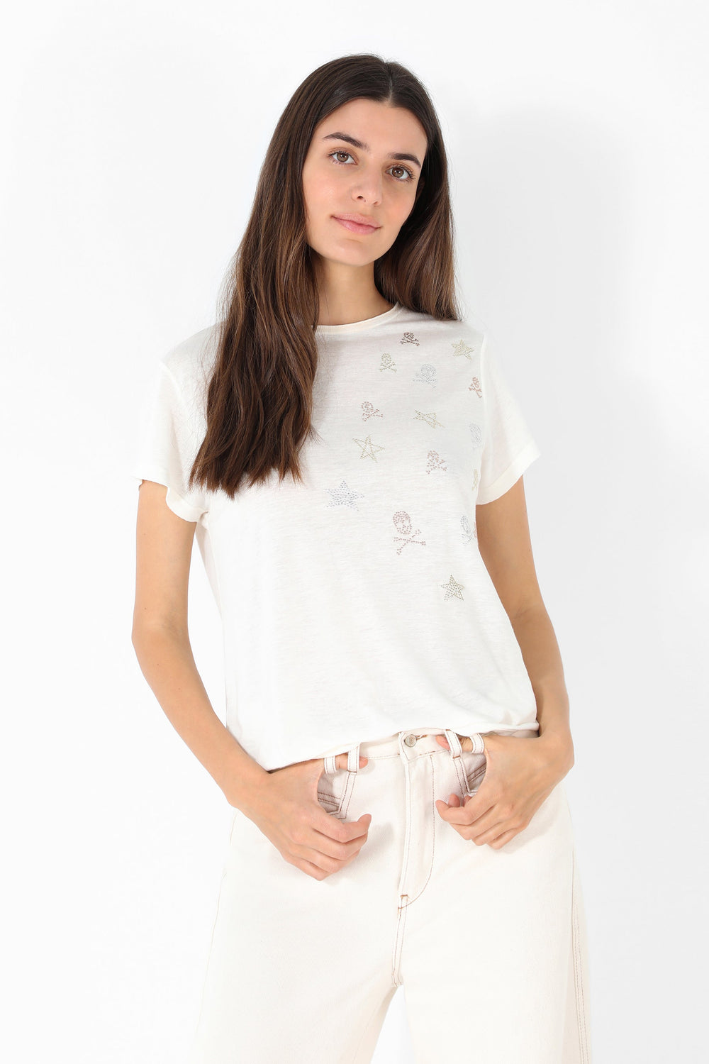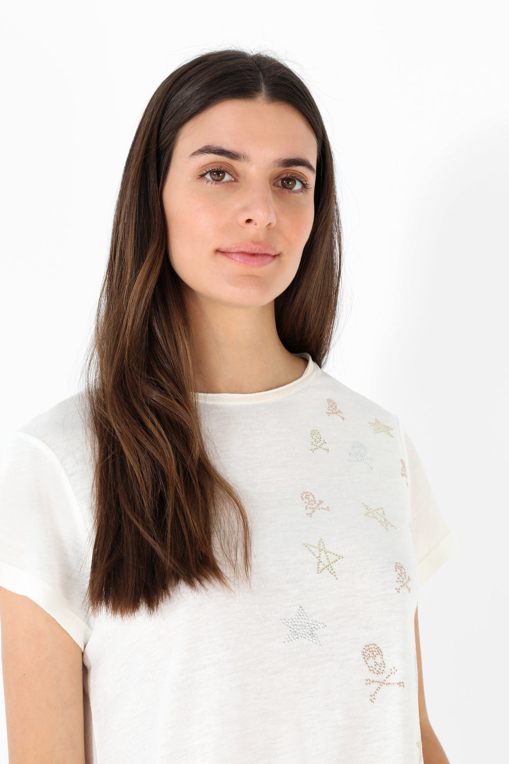 Camiseta confeccionada en tejido de lino. Corte Regular Fit, cuello redondo y manga corta. Detalle de prints bordados de mini tachuelas.
