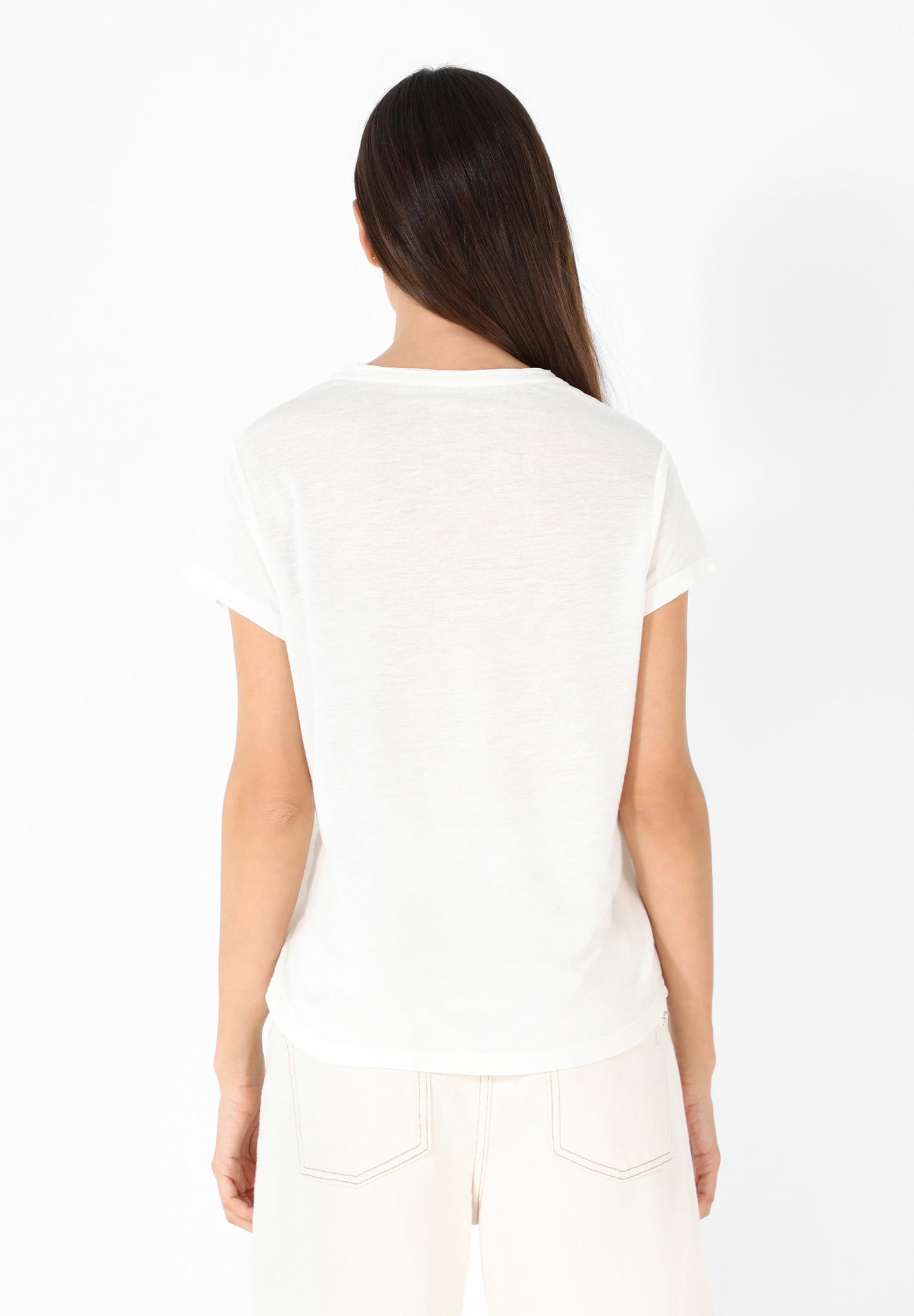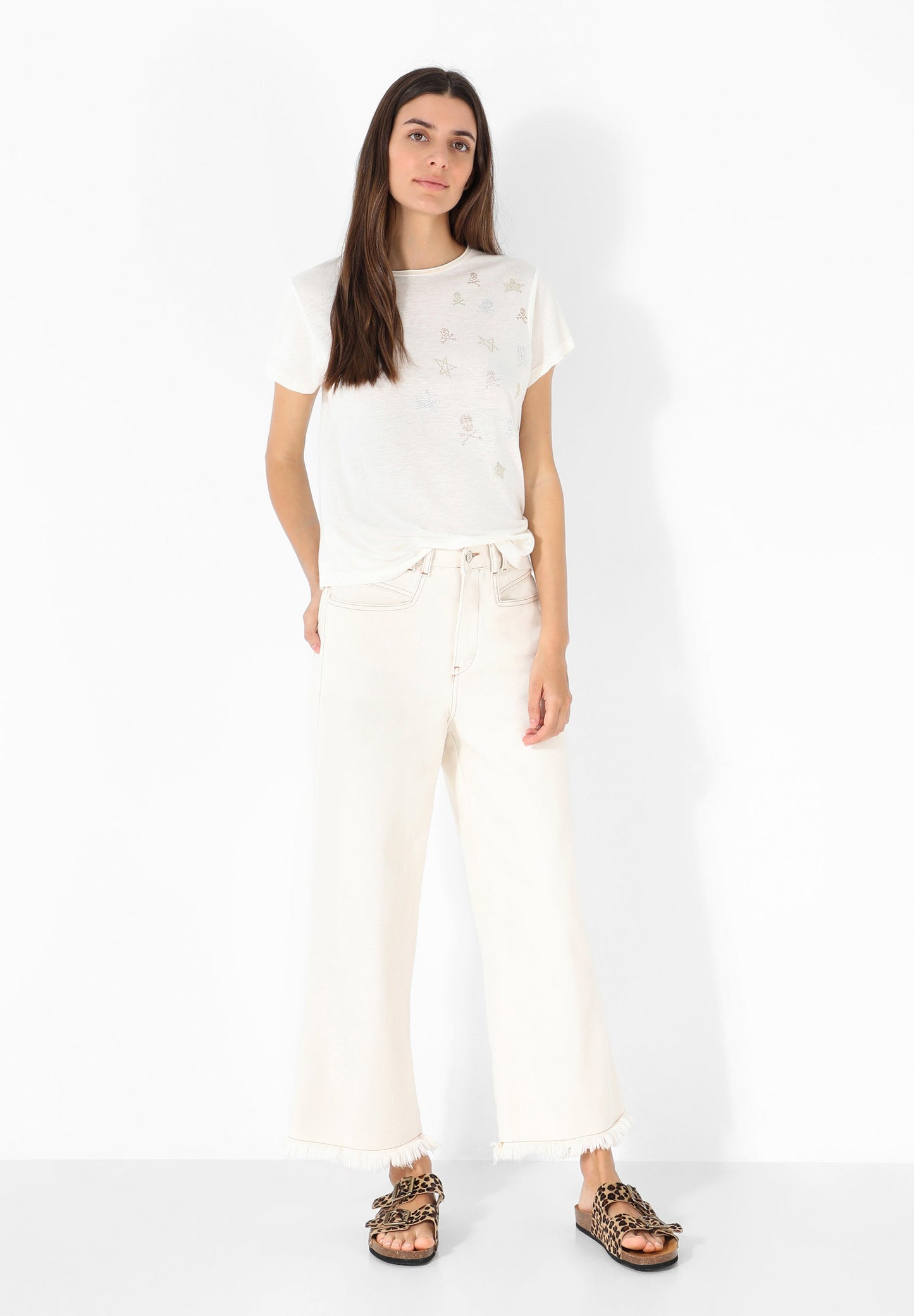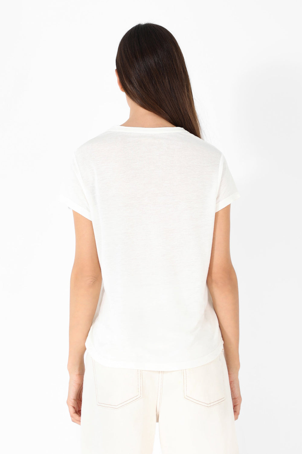 Camiseta confeccionada en tejido de lino. Corte Regular Fit, cuello redondo y manga corta. Detalle de prints bordados de mini tachuelas.