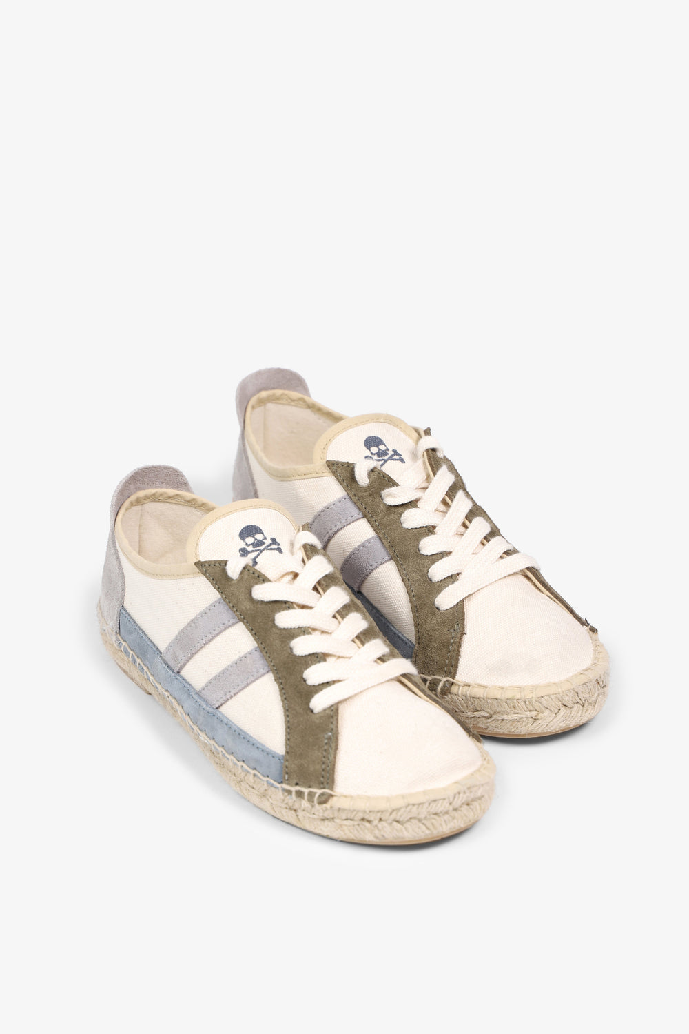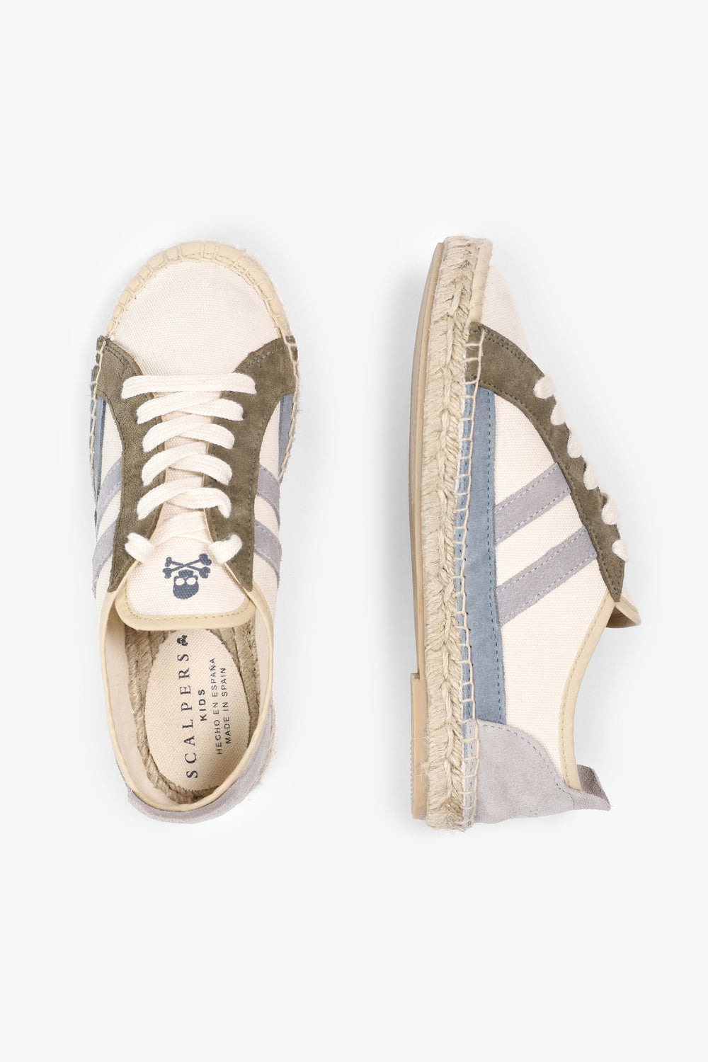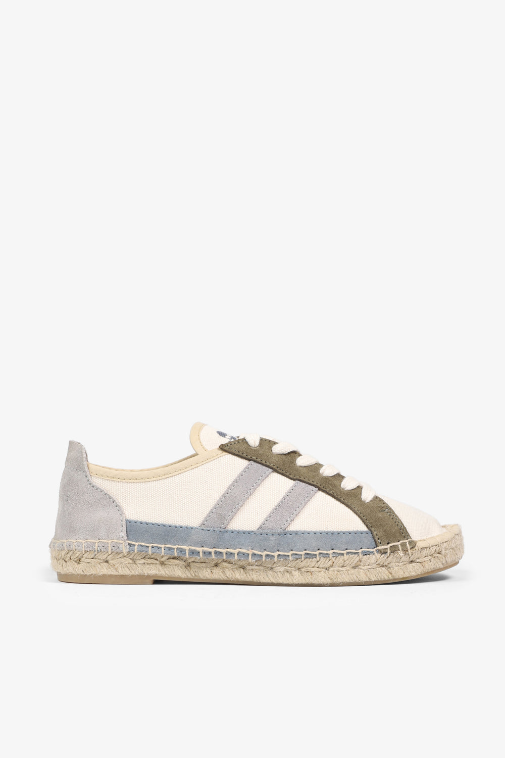 Alpargatas confeccionadas en tejido de canvas y piel. Cierre con cordones, suela de goma y yute y detalle de rayas laterales.
