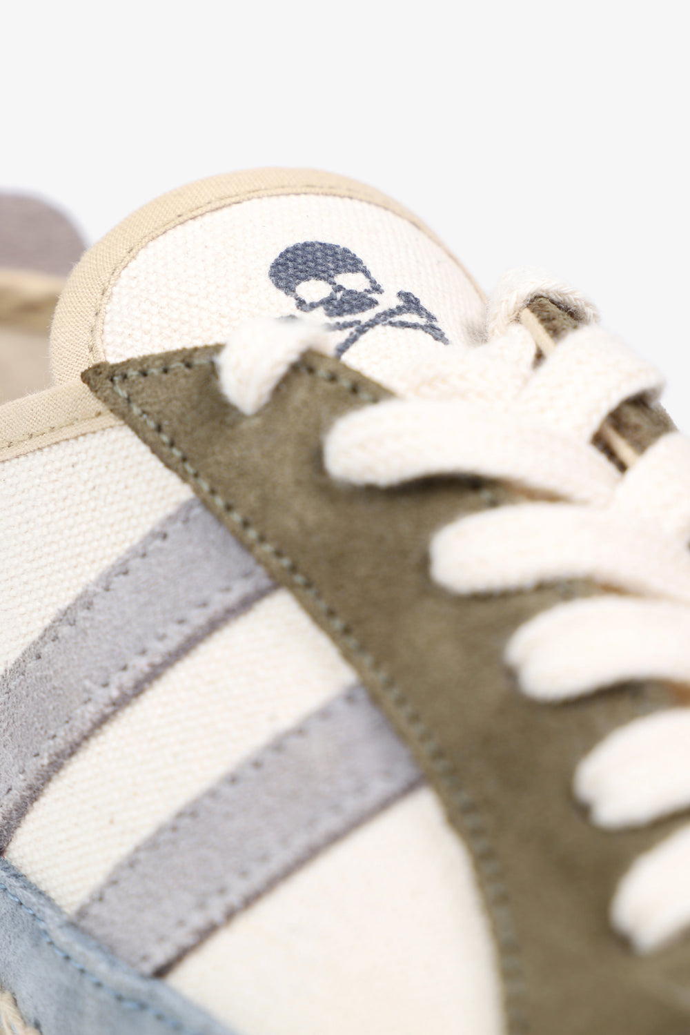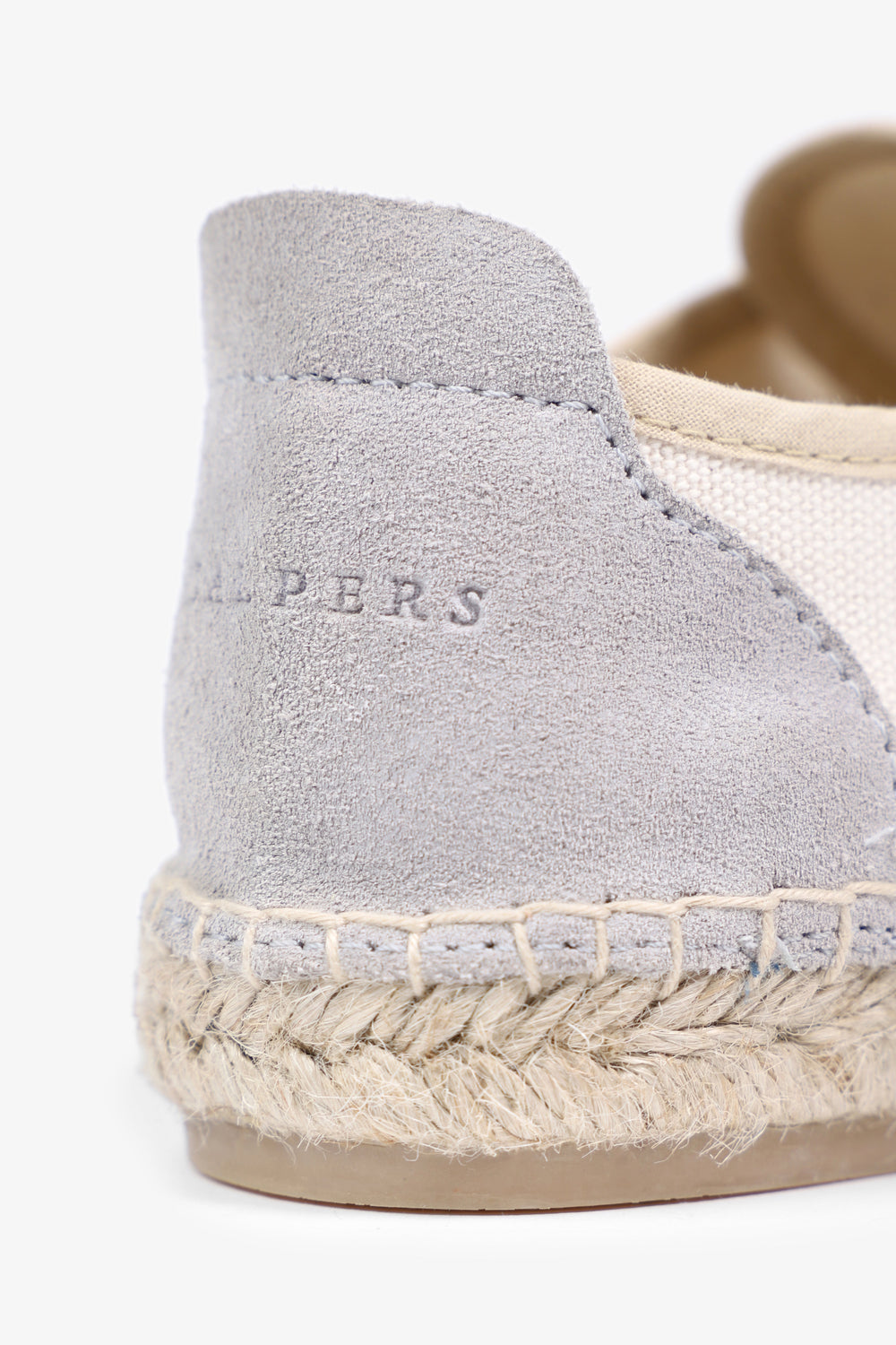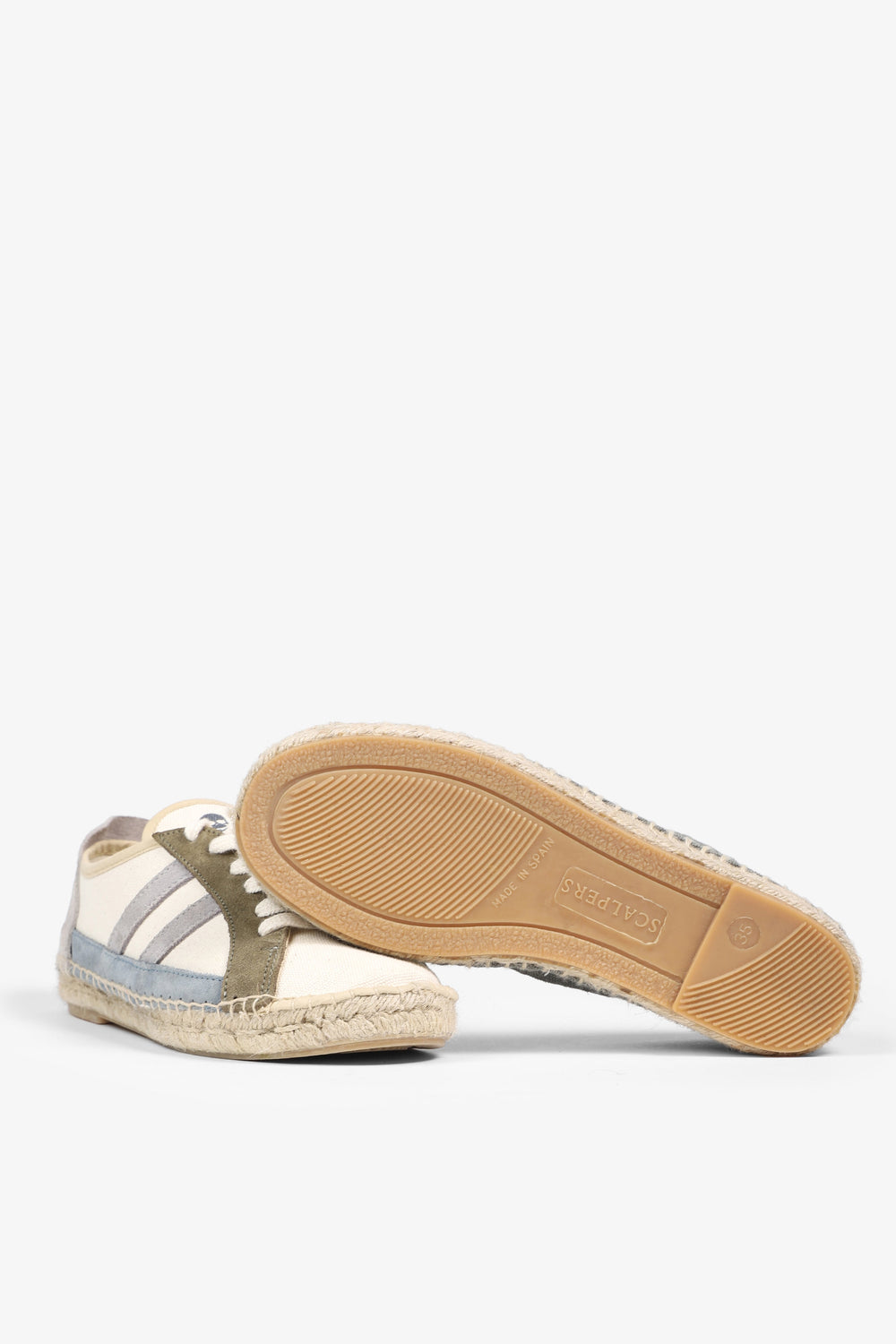 Alpargatas confeccionadas en tejido de canvas y piel. Cierre con cordones, suela de goma y yute y detalle de rayas laterales.