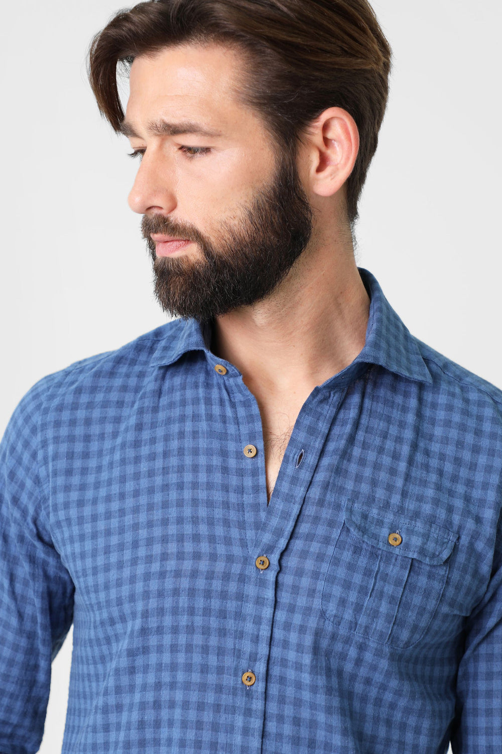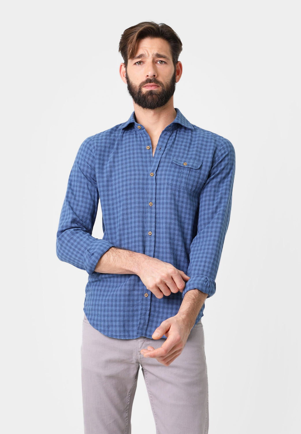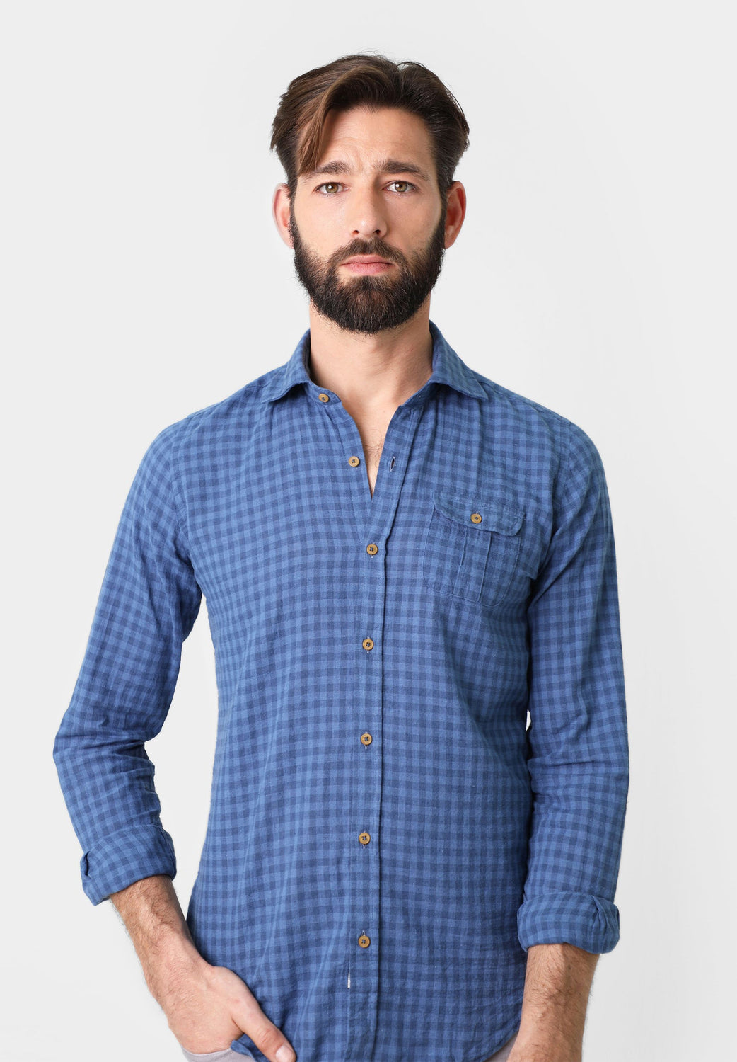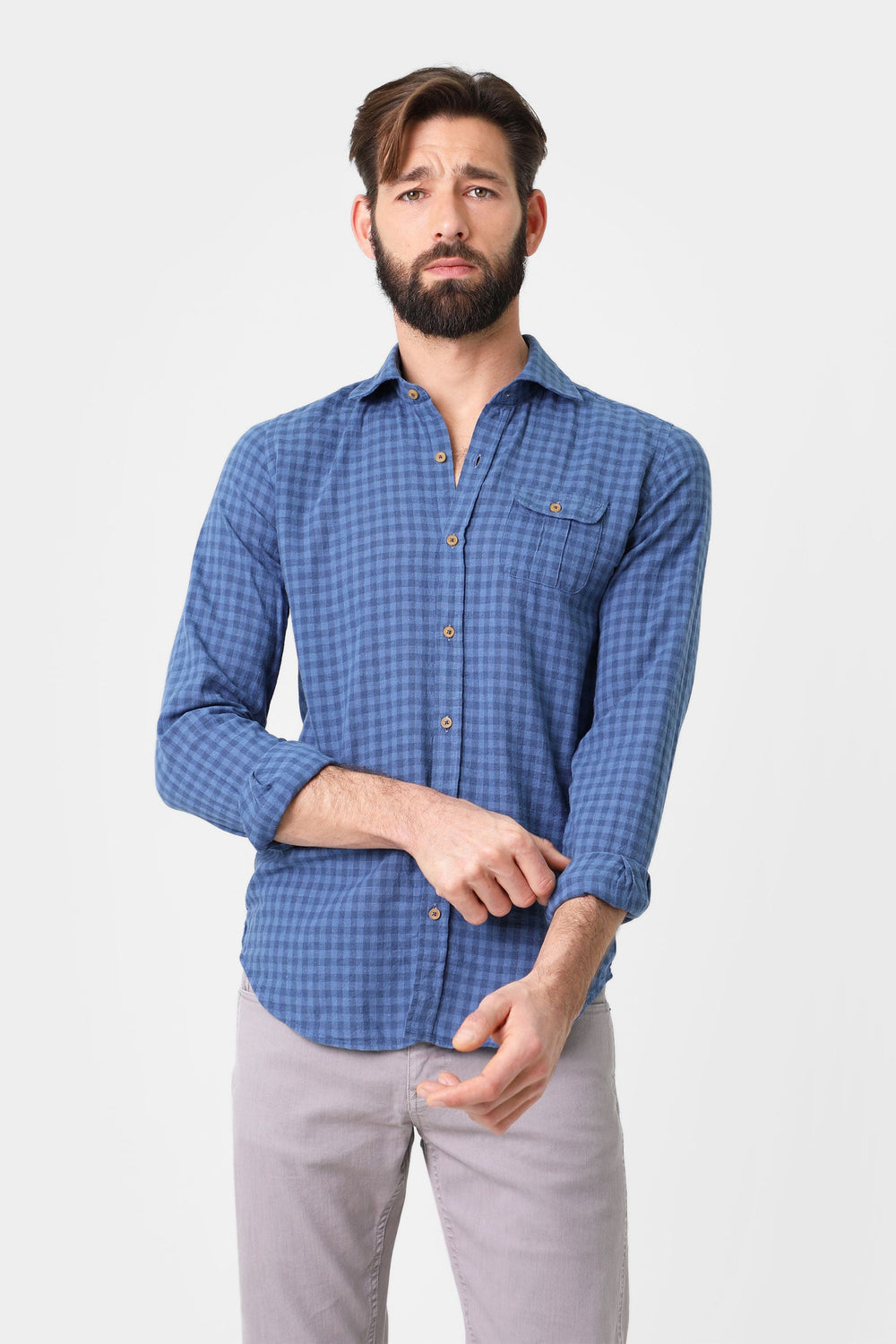 Camisa de cuadros confeccionada en tejido mezcla con 50% algodón y 50% lino. Corte Regular Fit, cuello italiano y manga larga terminada en puño con botones. Detalle de bolsillo en el pecho con botón y tapeta.