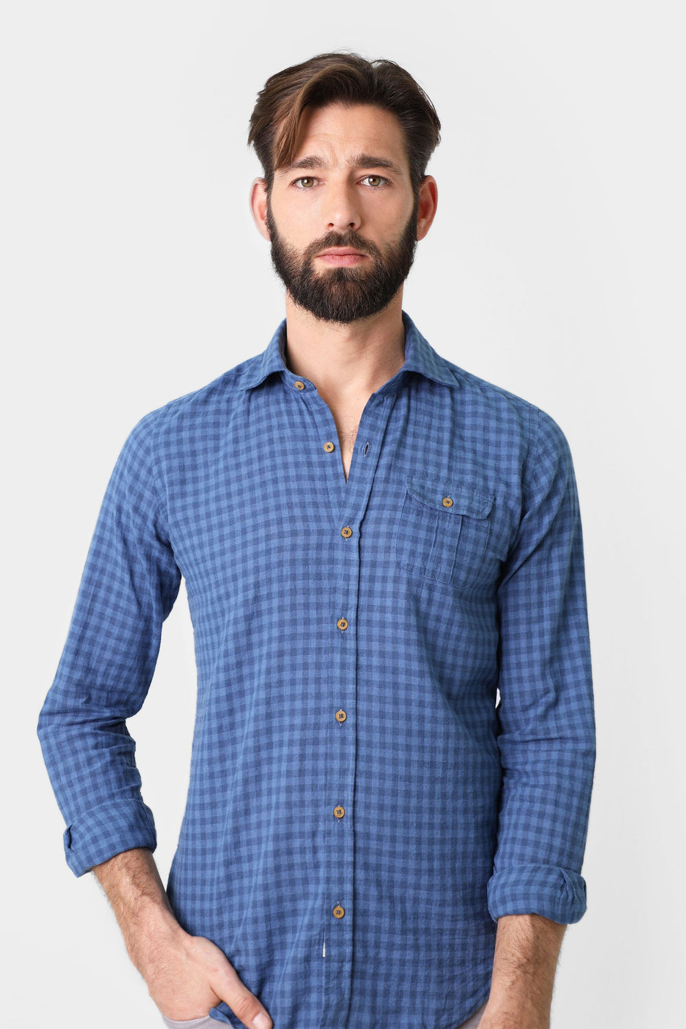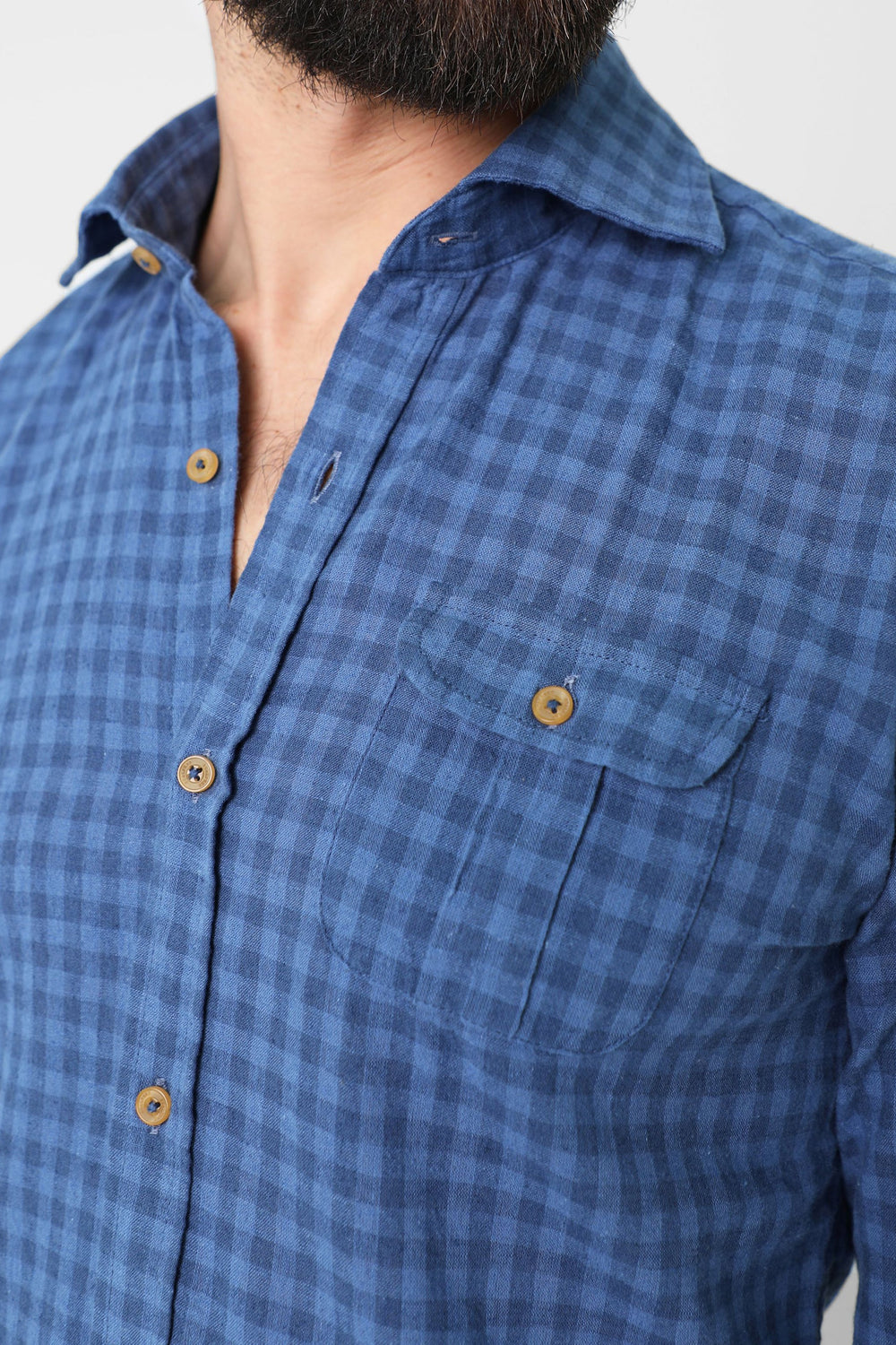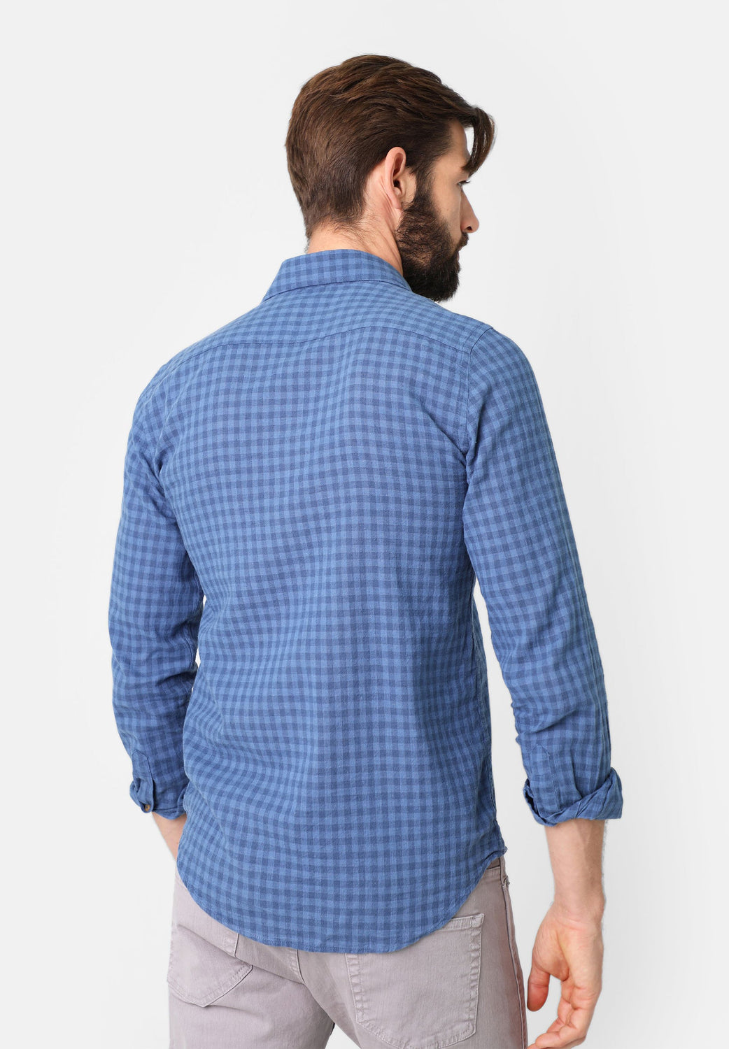 Camisa de cuadros confeccionada en tejido mezcla con 50% algodón y 50% lino. Corte Regular Fit, cuello italiano y manga larga terminada en puño con botones. Detalle de bolsillo en el pecho con botón y tapeta.