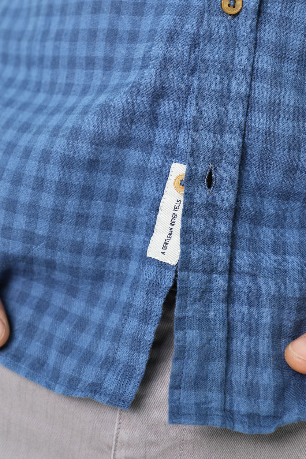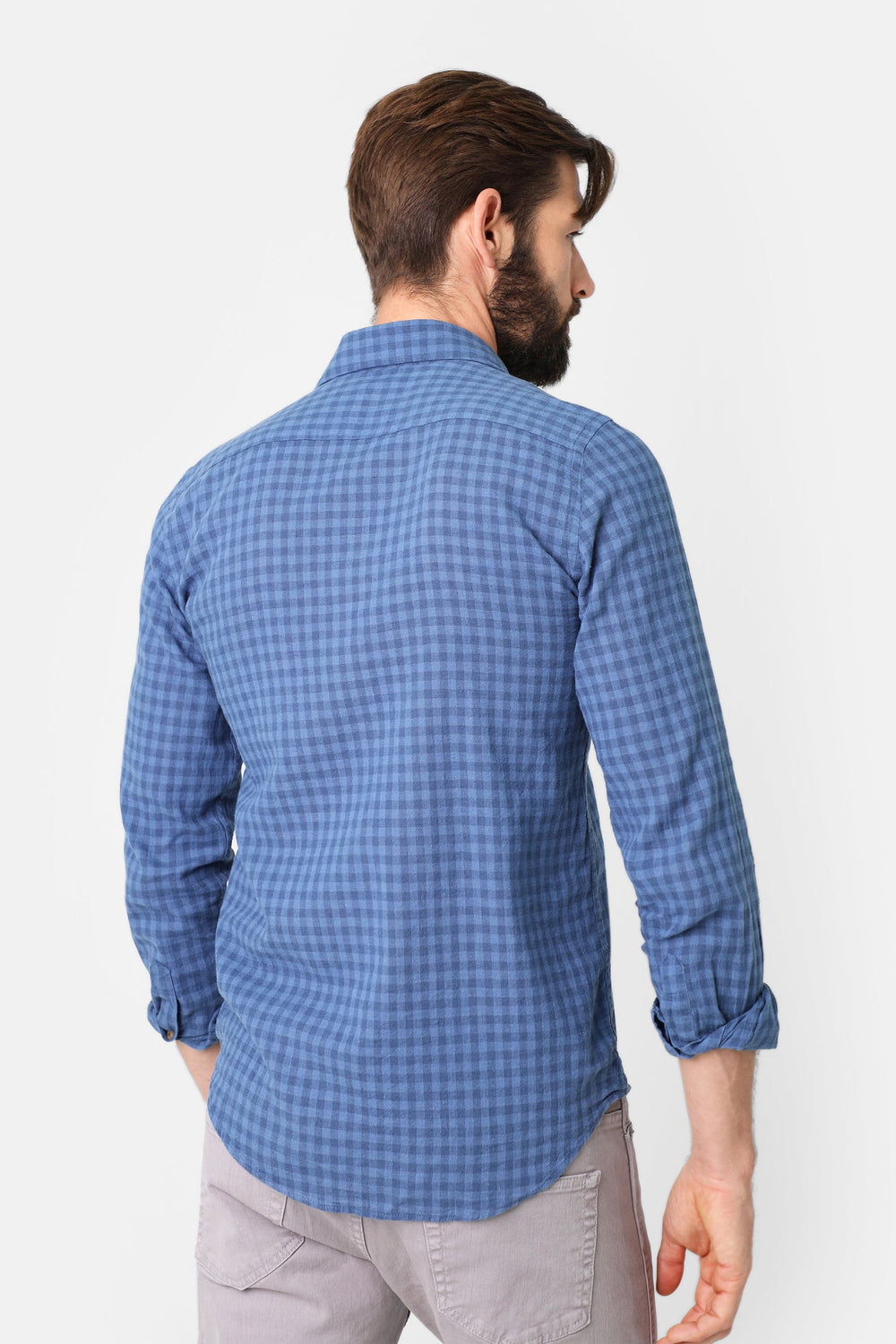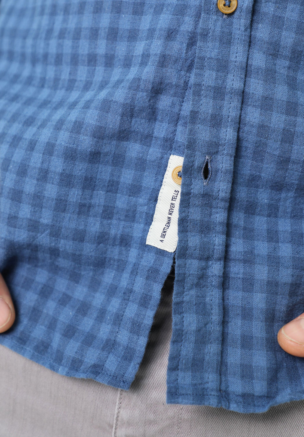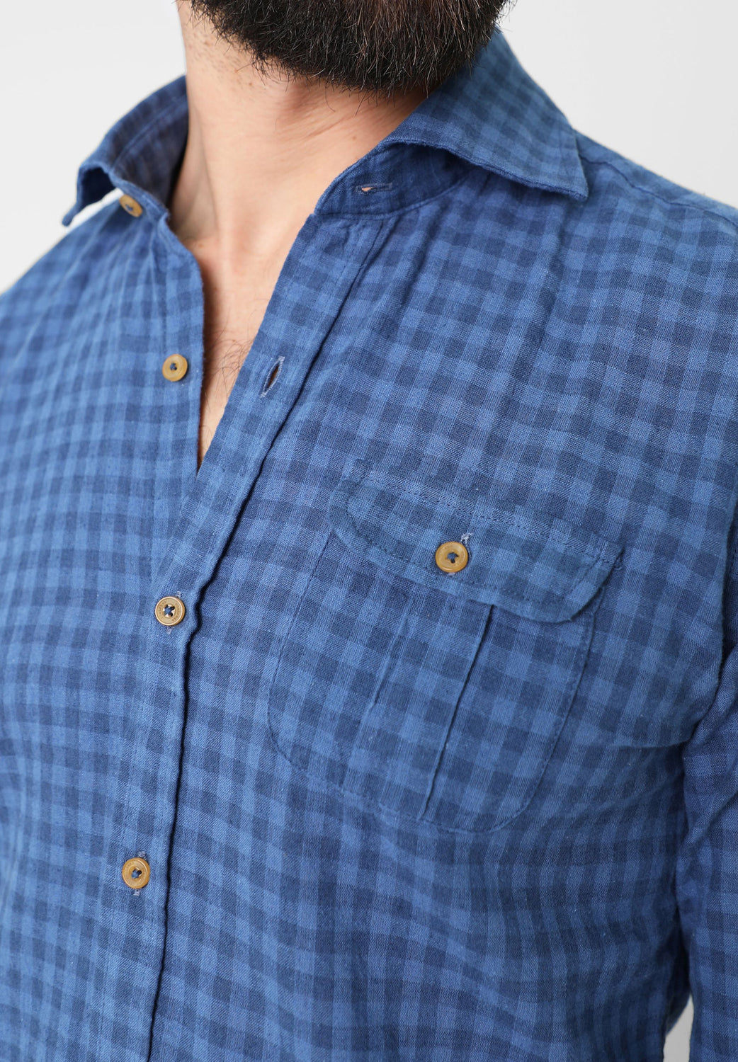 Camisa de cuadros confeccionada en tejido mezcla con 50% algodón y 50% lino. Corte Regular Fit, cuello italiano y manga larga terminada en puño con botones. Detalle de bolsillo en el pecho con botón y tapeta.