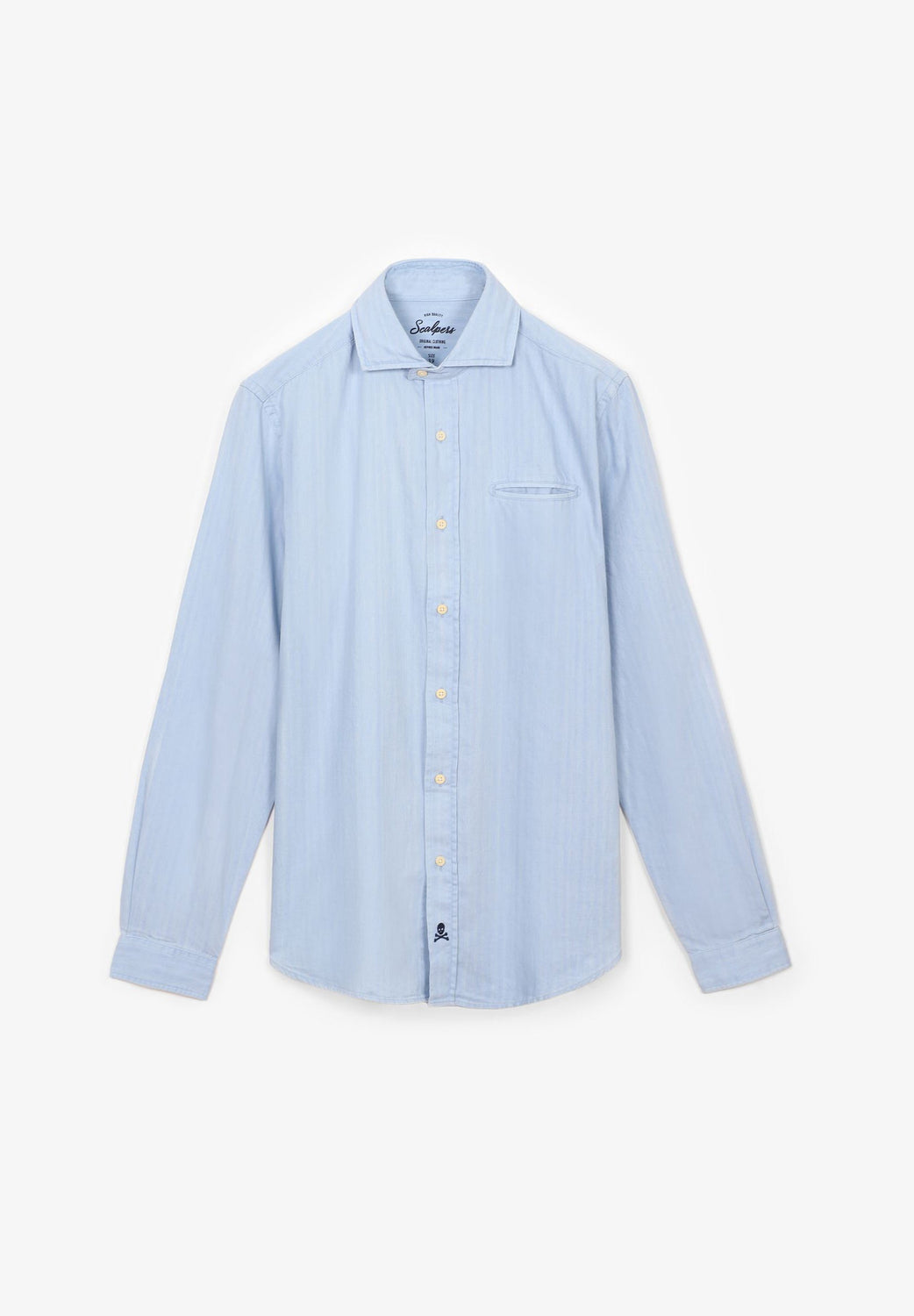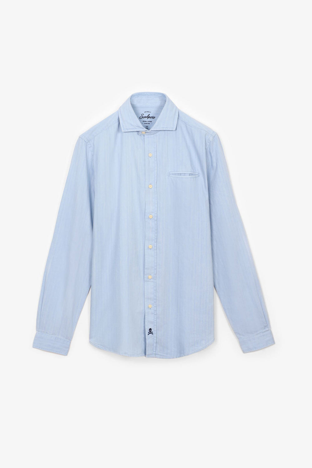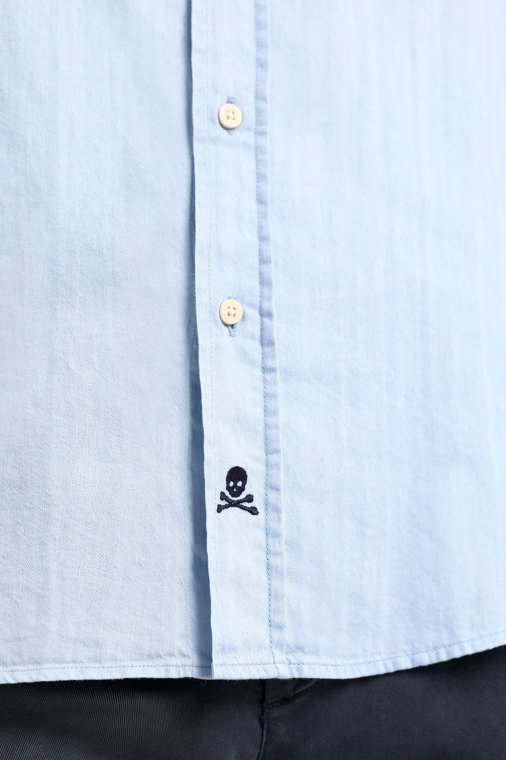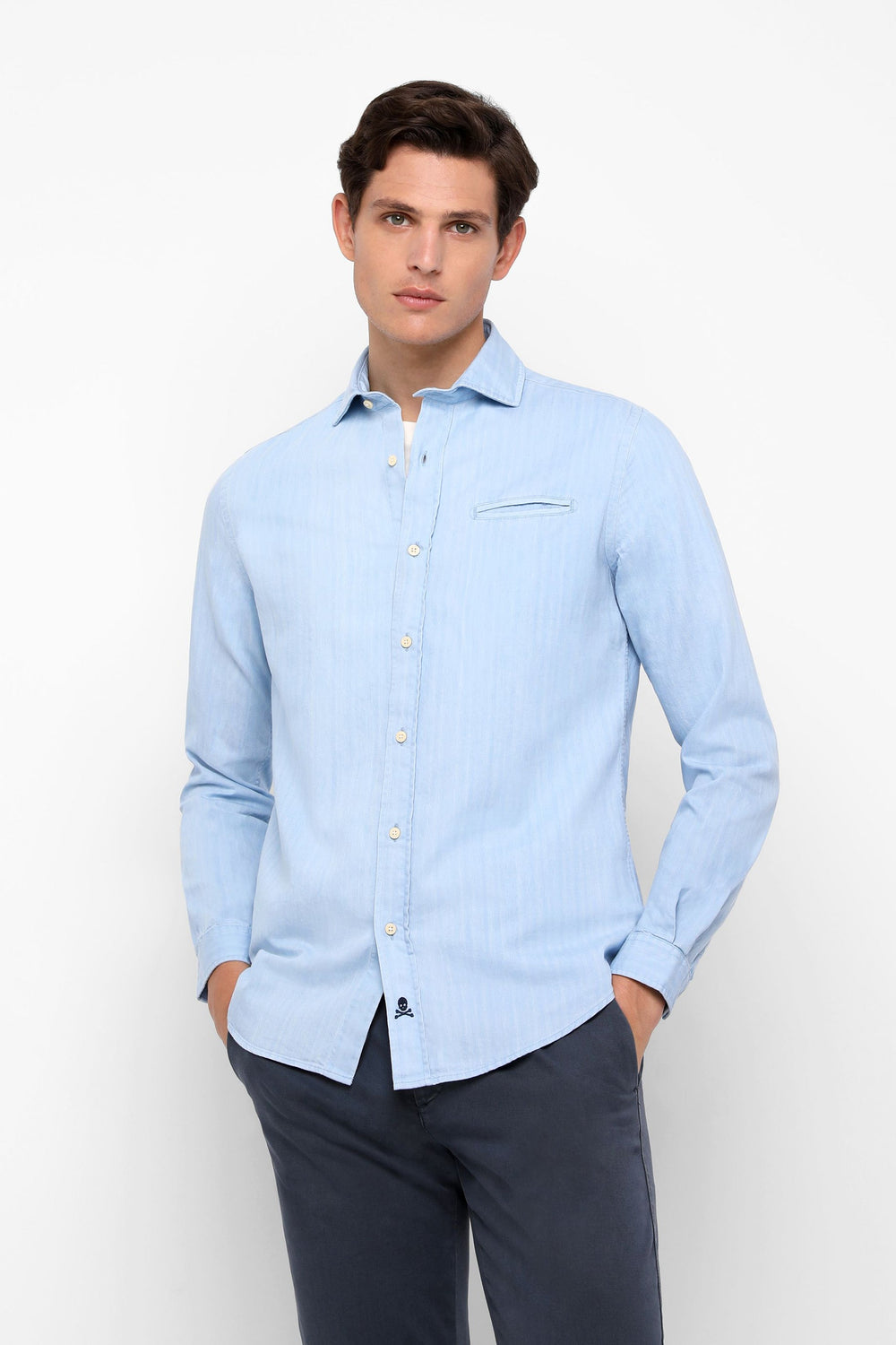 Camisa denim confeccionada en tejido 100% algodón. Corte Regular Fit, cuello italiano y cierre con botones. Manga larga terminada en puño con botones. Bolsillo insertado en el pecho. Detalle de calavera en la tapeta.