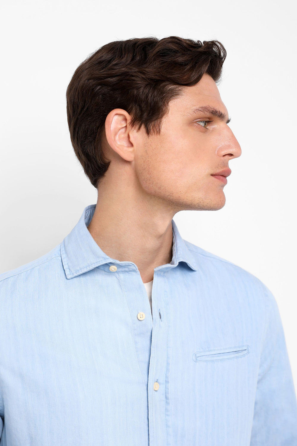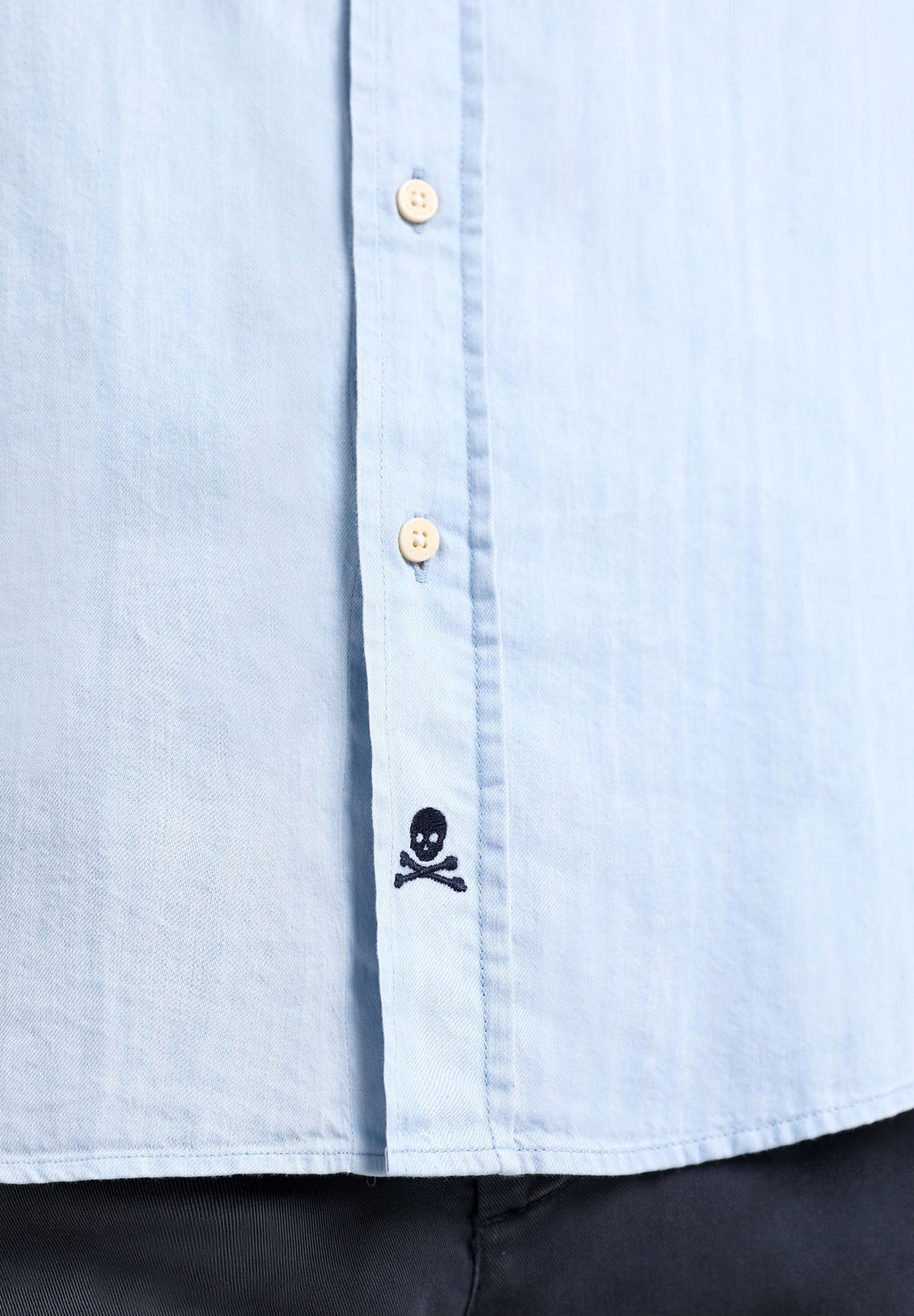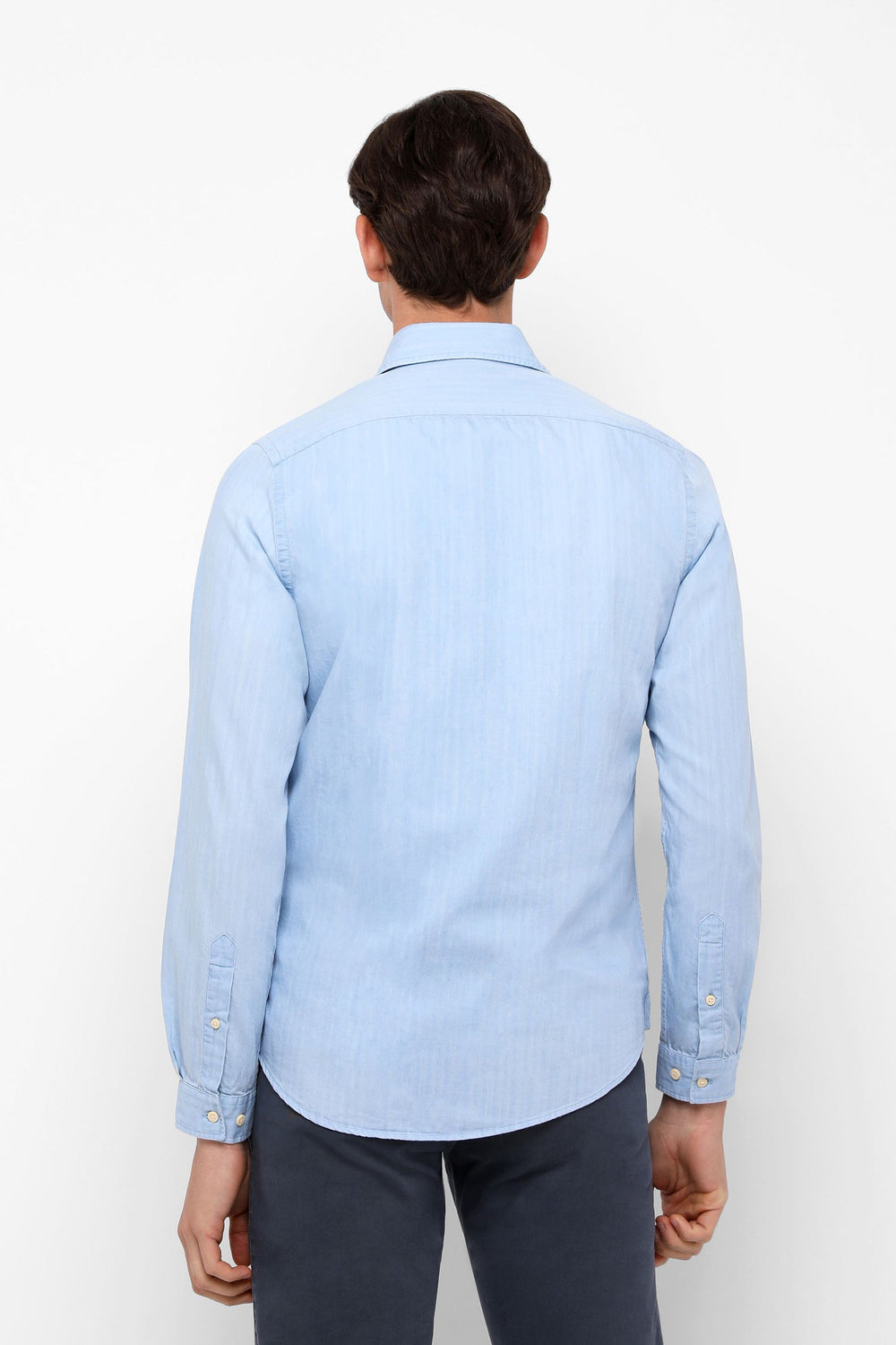 Camisa denim confeccionada en tejido 100% algodón. Corte Regular Fit, cuello italiano y cierre con botones. Manga larga terminada en puño con botones. Bolsillo insertado en el pecho. Detalle de calavera en la tapeta.