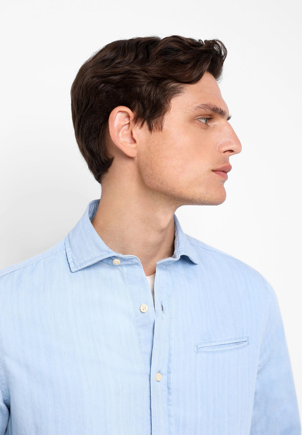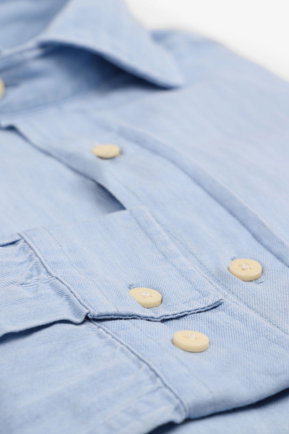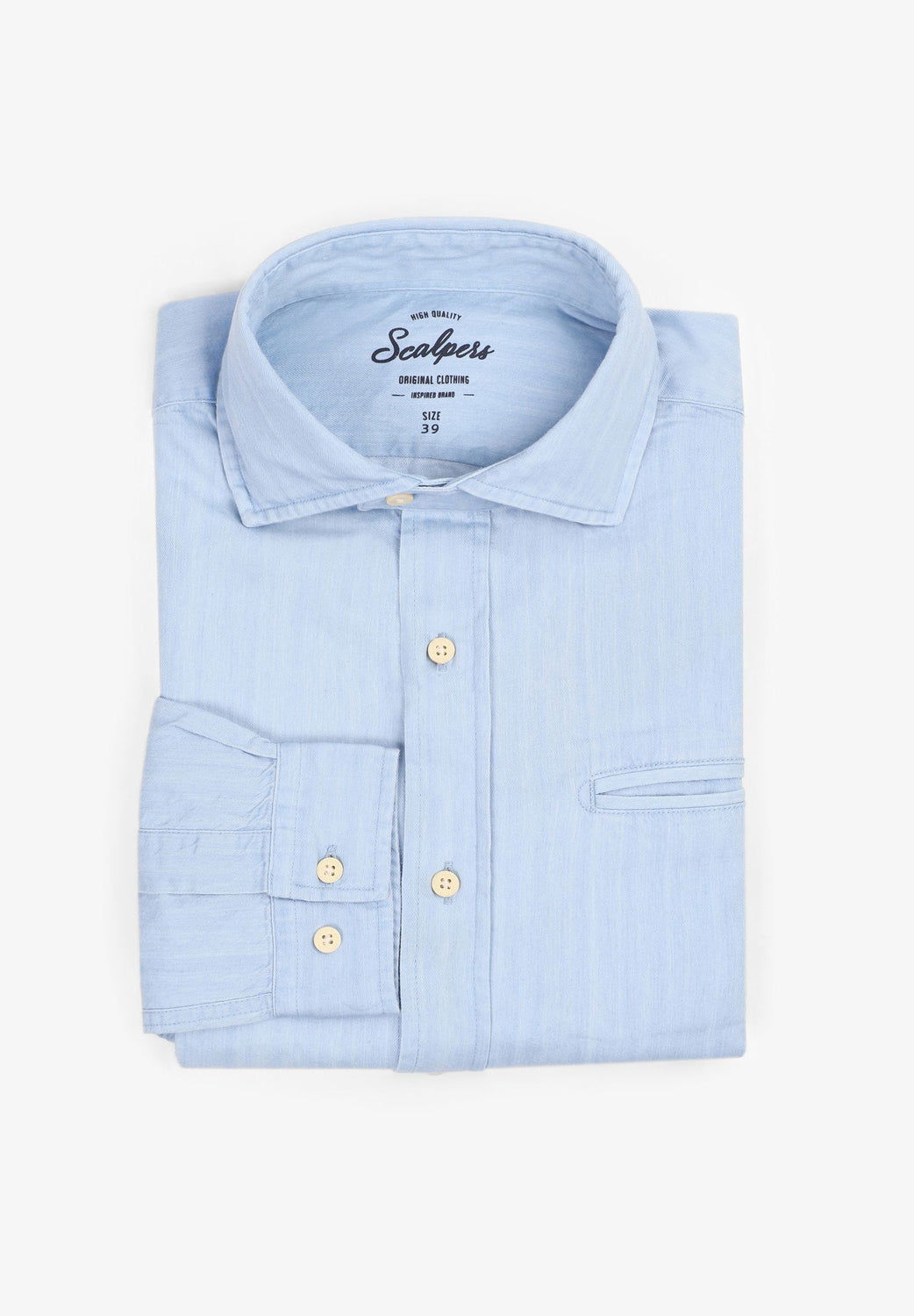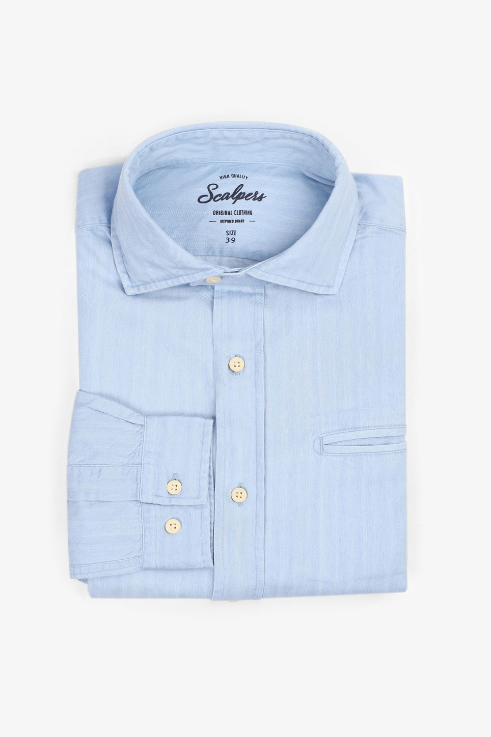 Camisa denim confeccionada en tejido 100% algodón. Corte Regular Fit, cuello italiano y cierre con botones. Manga larga terminada en puño con botones. Bolsillo insertado en el pecho. Detalle de calavera en la tapeta.