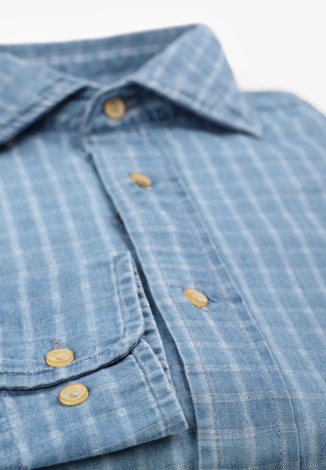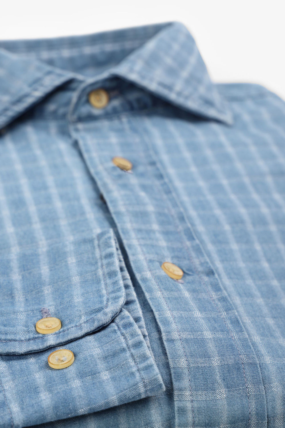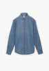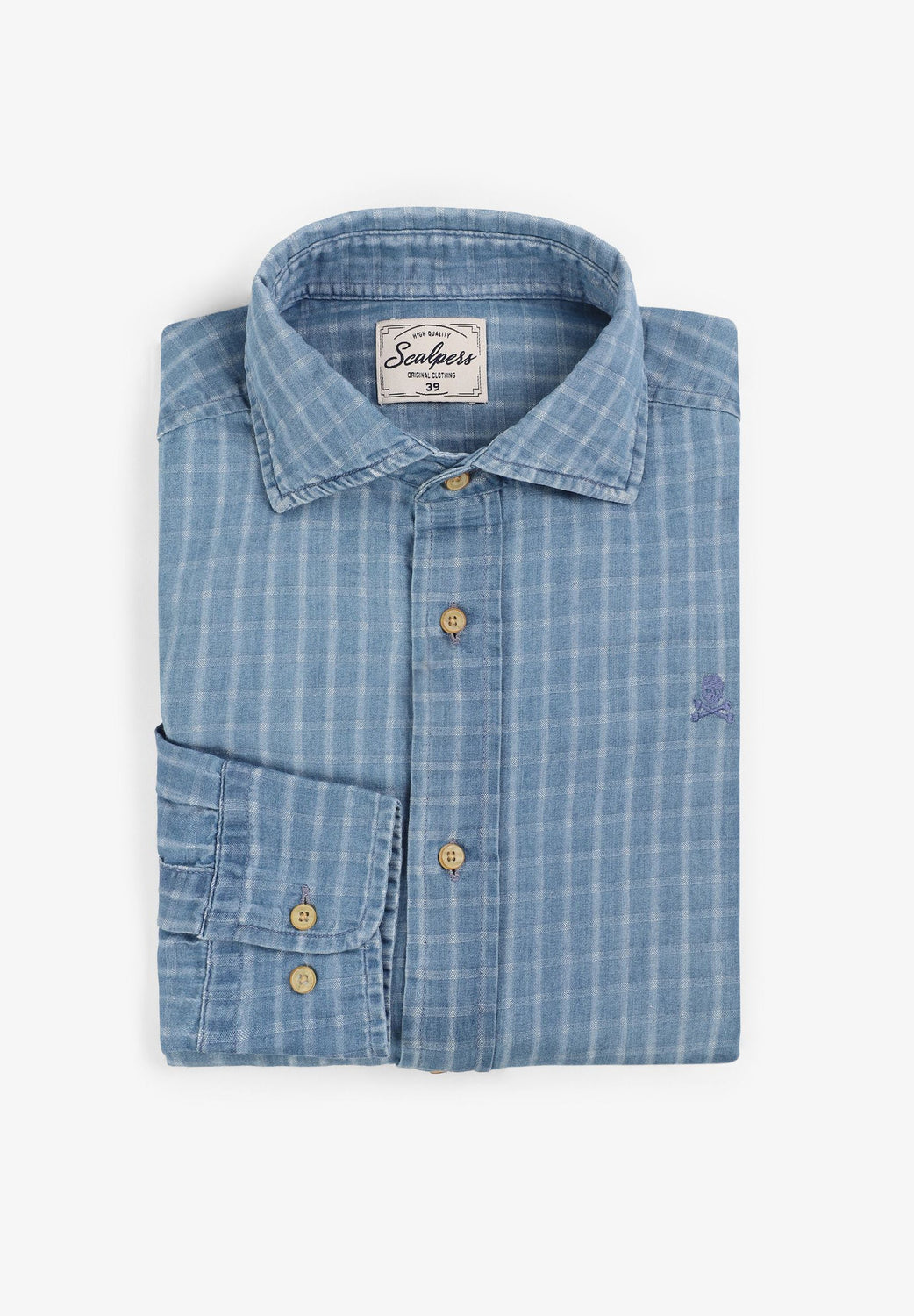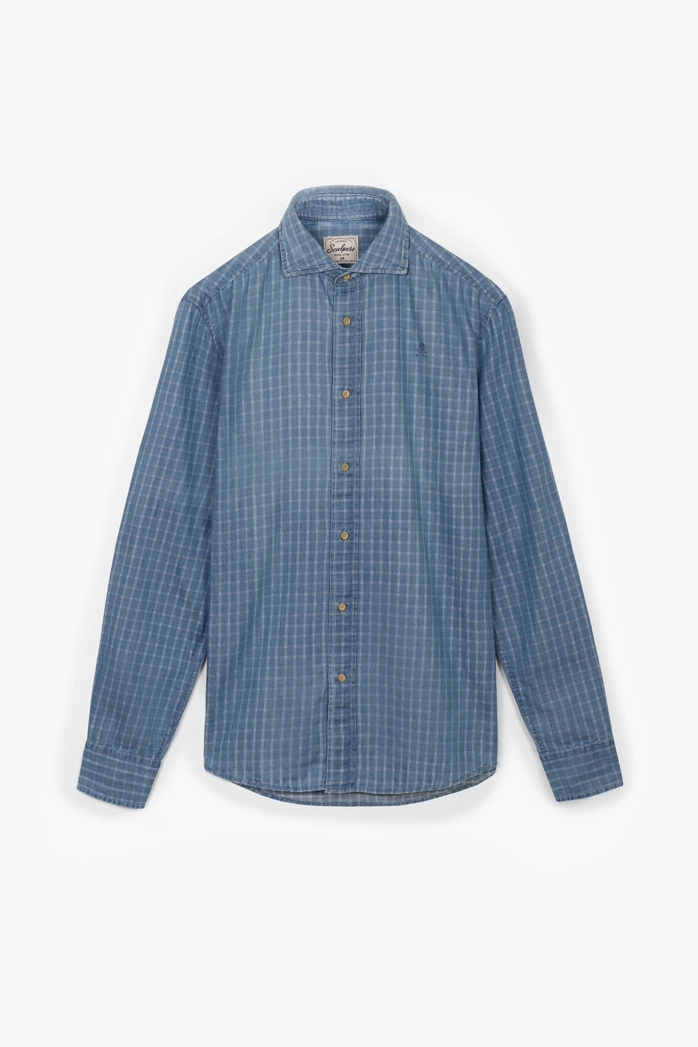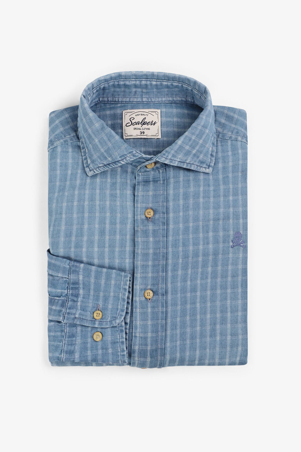 Camisa denim confeccionada en tejido 100% algodón. Corte Regular Fit, cuello italiano y cierre con botones. Manga larga terminada en puño con botones y detalle de calavera bordada en el pecho.