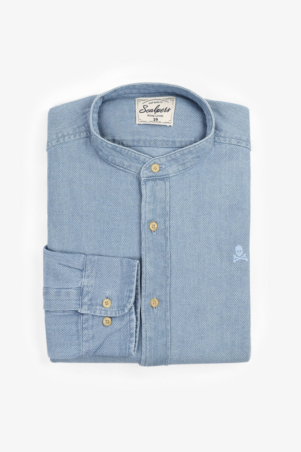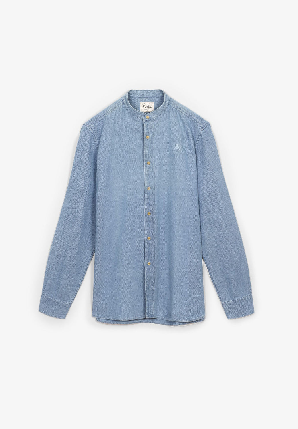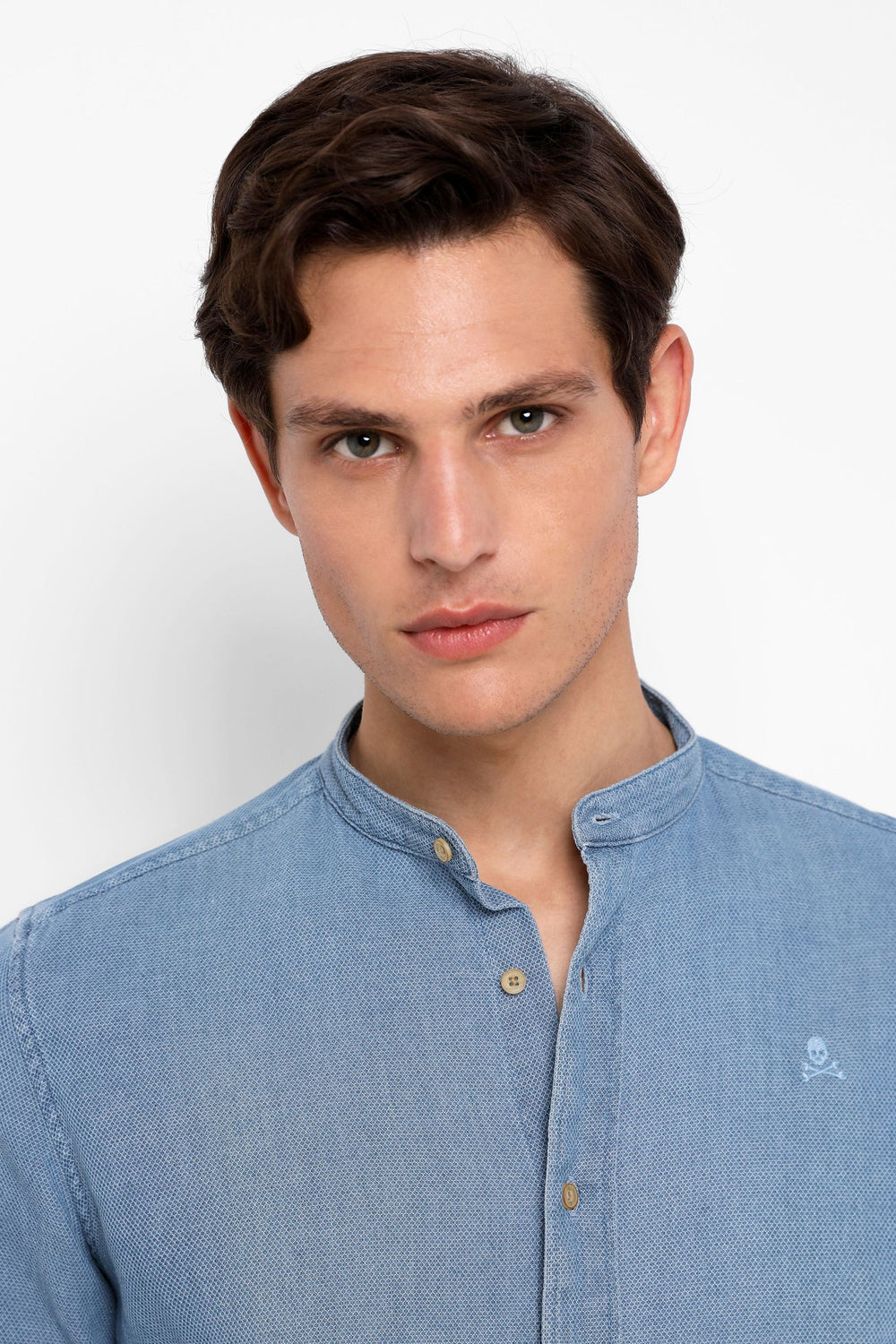 Camisa denim confeccionada en tejido 100% algodón. Corte Regular Fit, cuello mao y cierre con botones. Manga larga terminada en puño con botón y detalle de calavera bordada a tono.