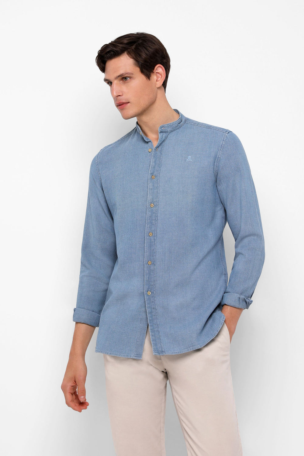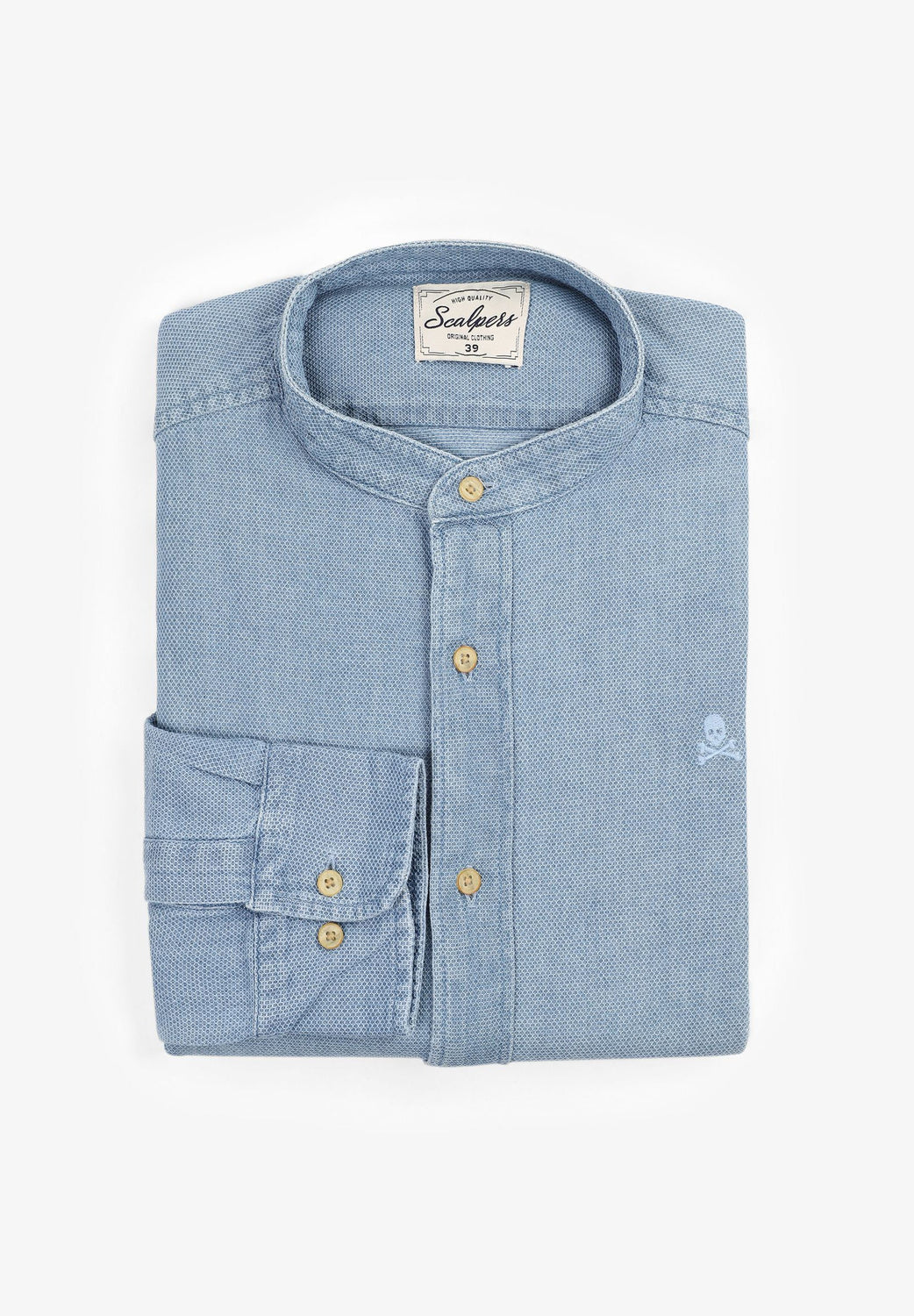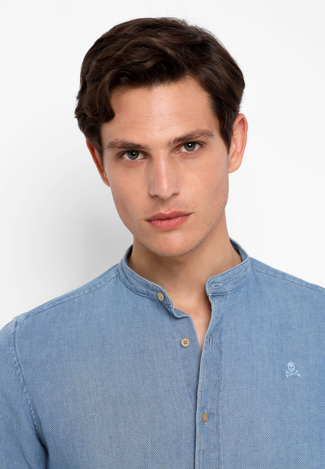 Camisa denim confeccionada en tejido 100% algodón. Corte Regular Fit, cuello mao y cierre con botones. Manga larga terminada en puño con botón y detalle de calavera bordada a tono.