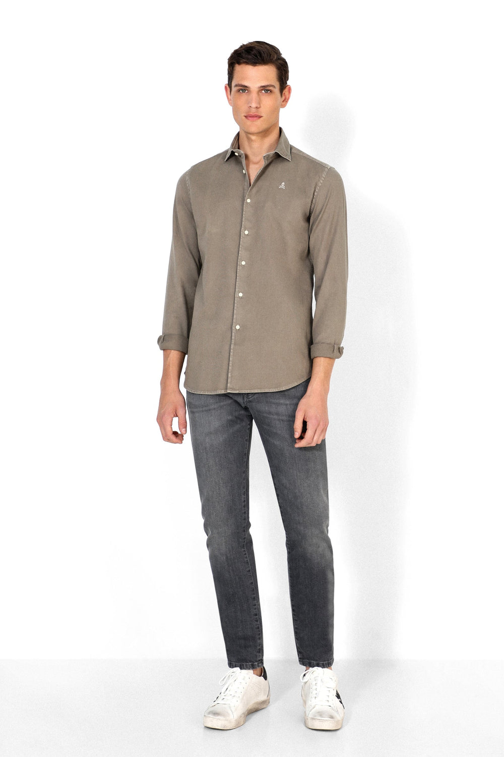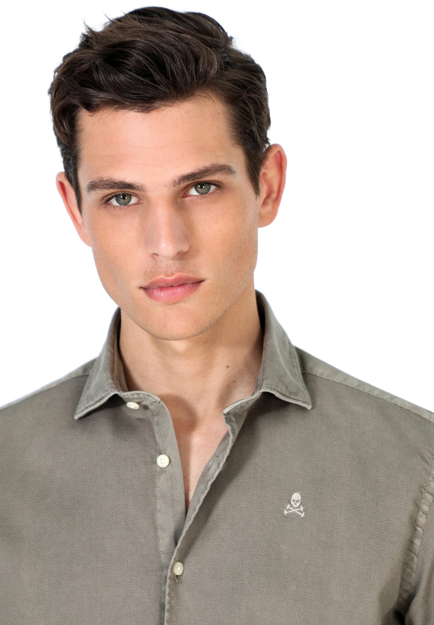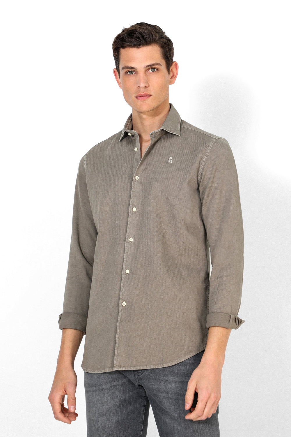 Camisa confeccionada en tejido 100% algodón tipo polo. Corte Regular Fit, cuello cutaway y cierre con botones. Manga larga terminada en puño con botones y detalla de calavera bordada a tono.