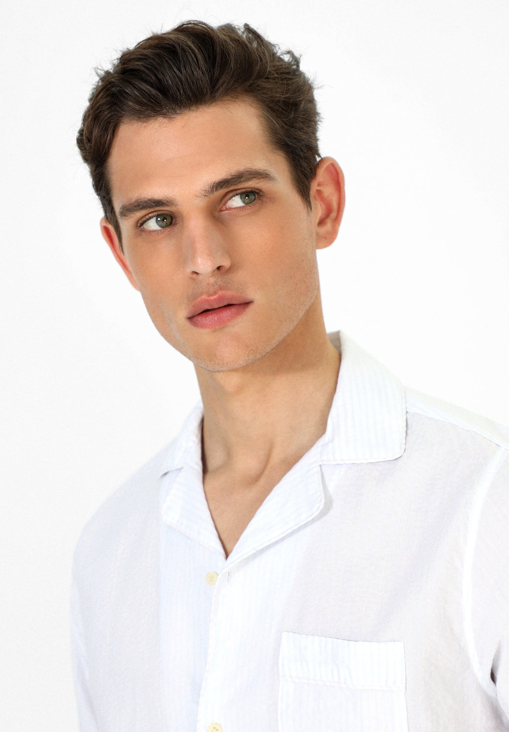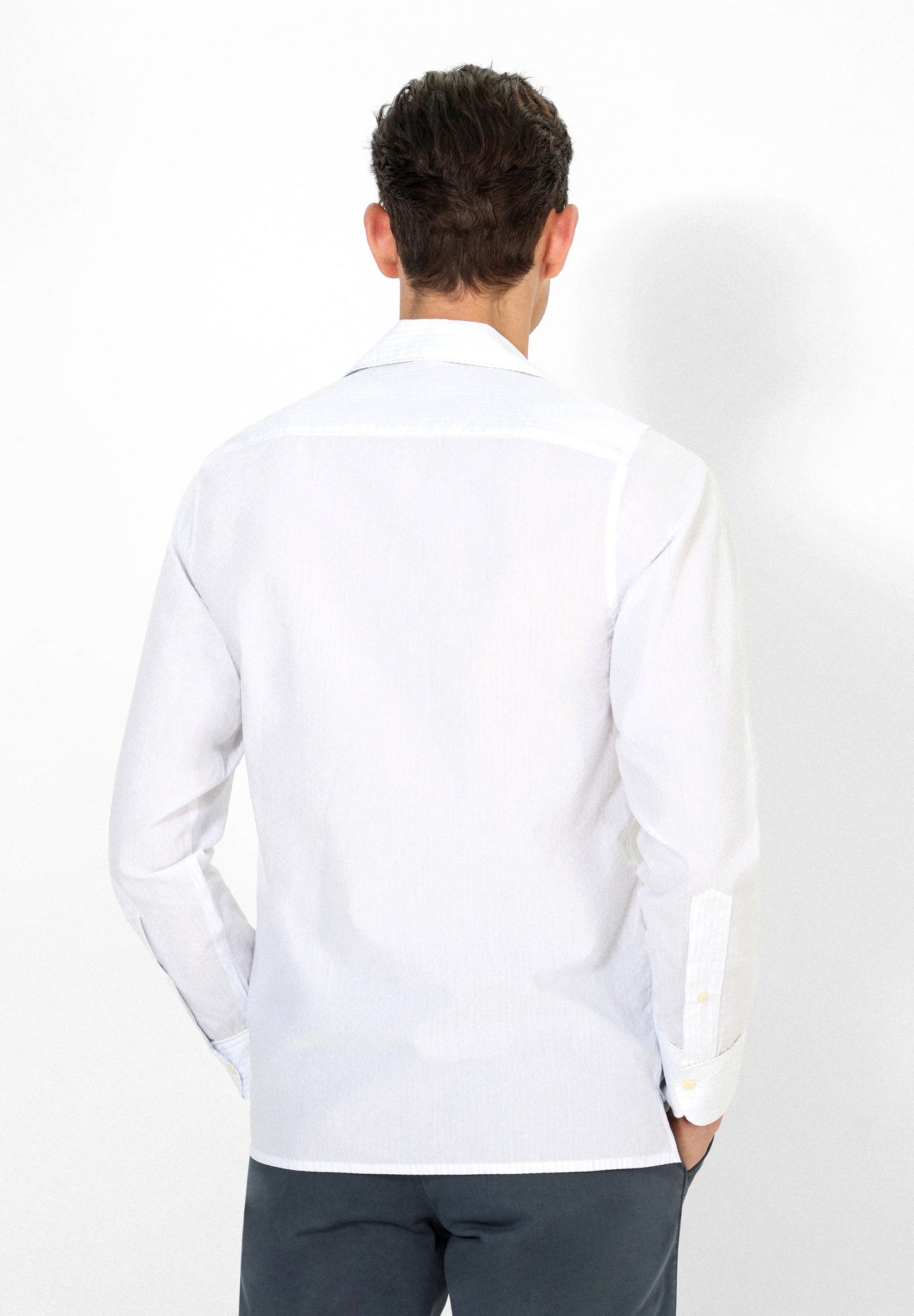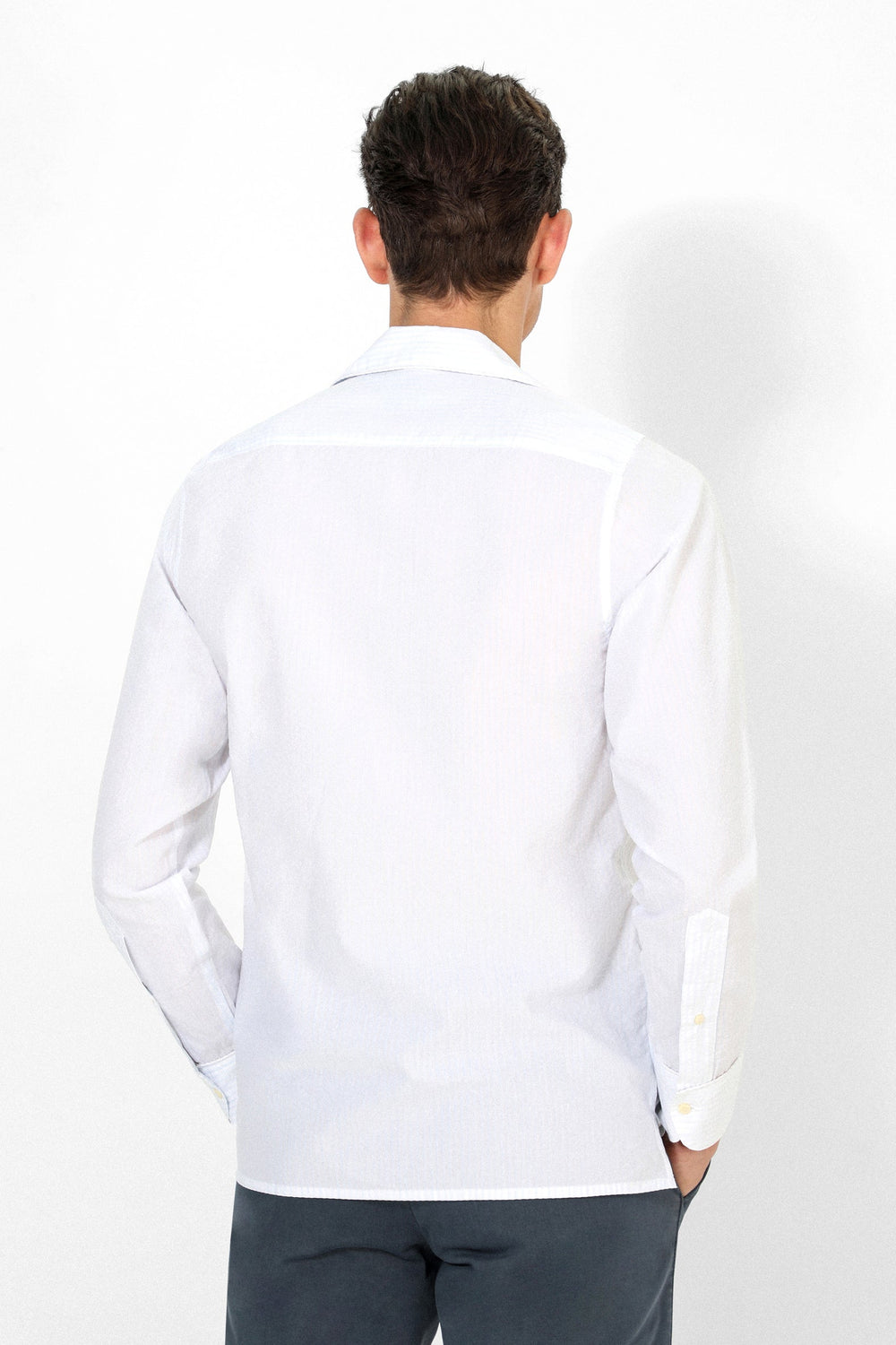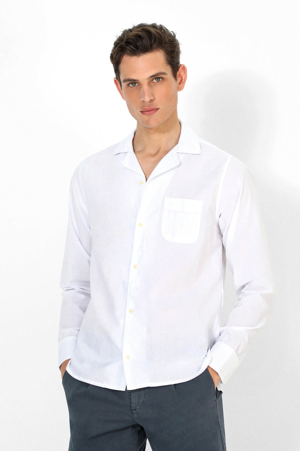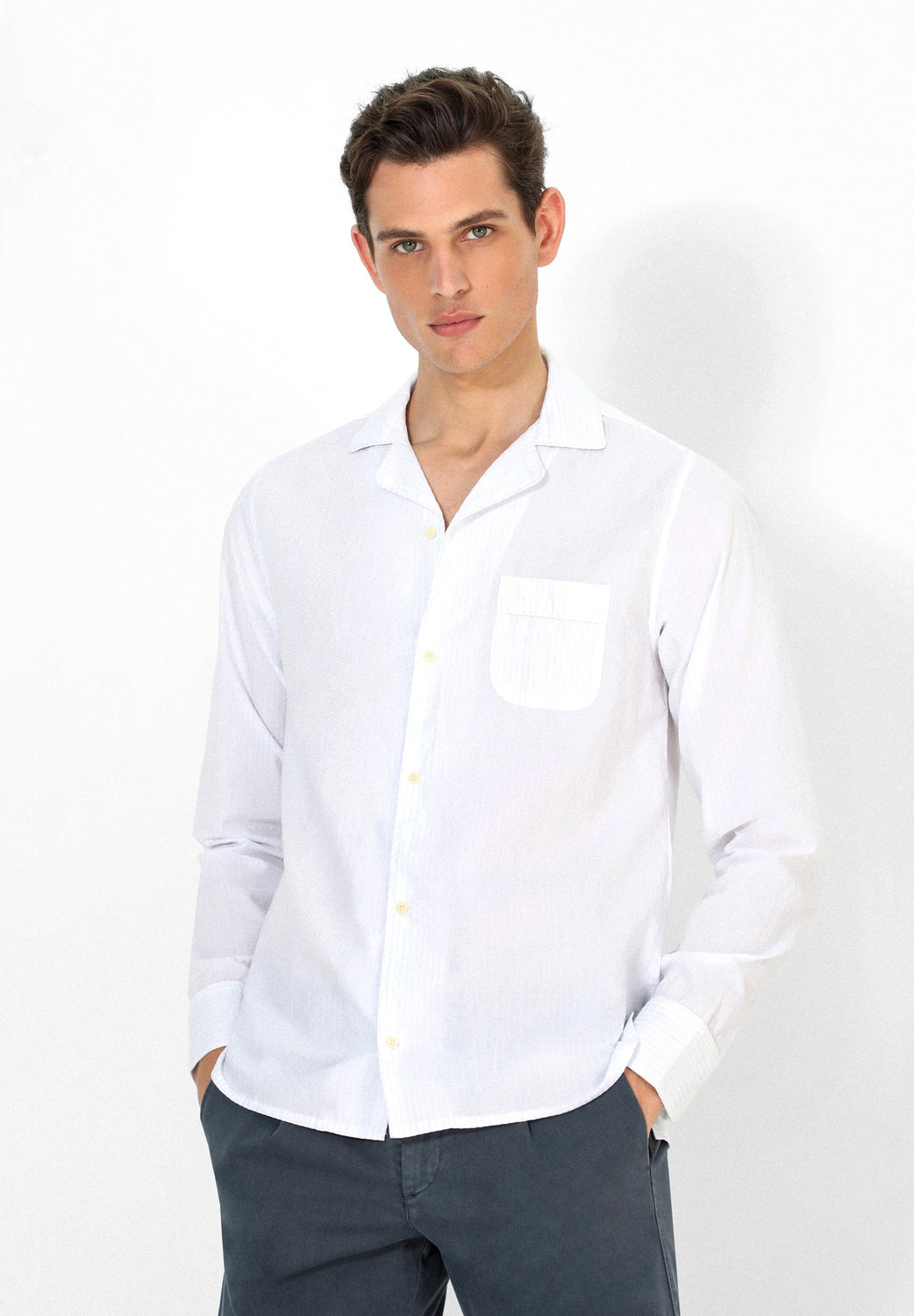 Camisa confeccionada en tejido 100% algodón con estructura. Corte Regular Fit, cuello pijamero y cierre con botones. Manga larga terminada en puño con botones.