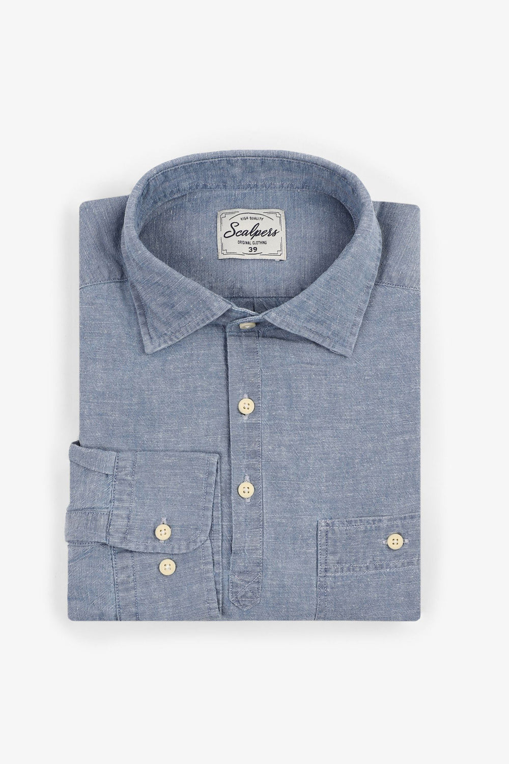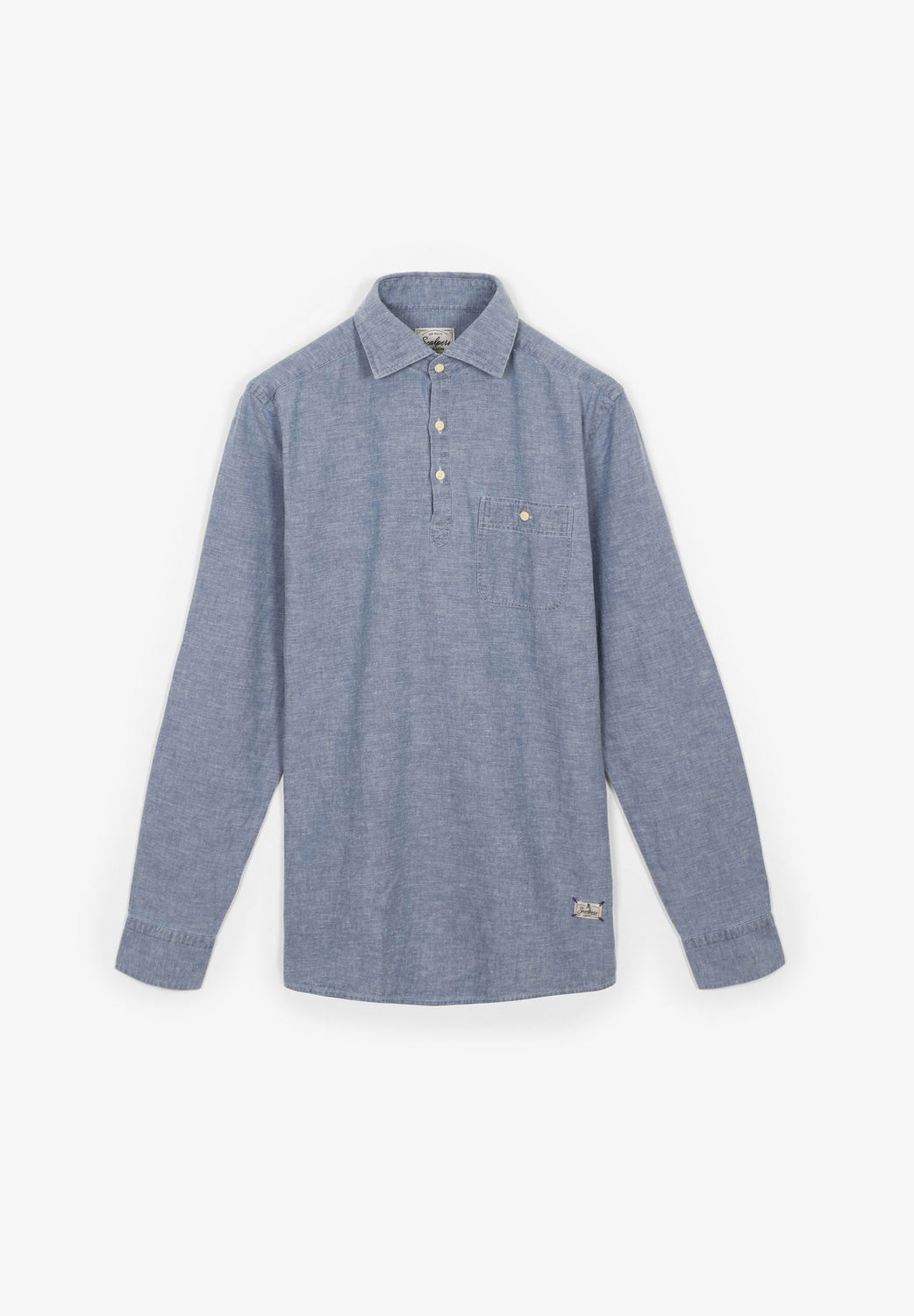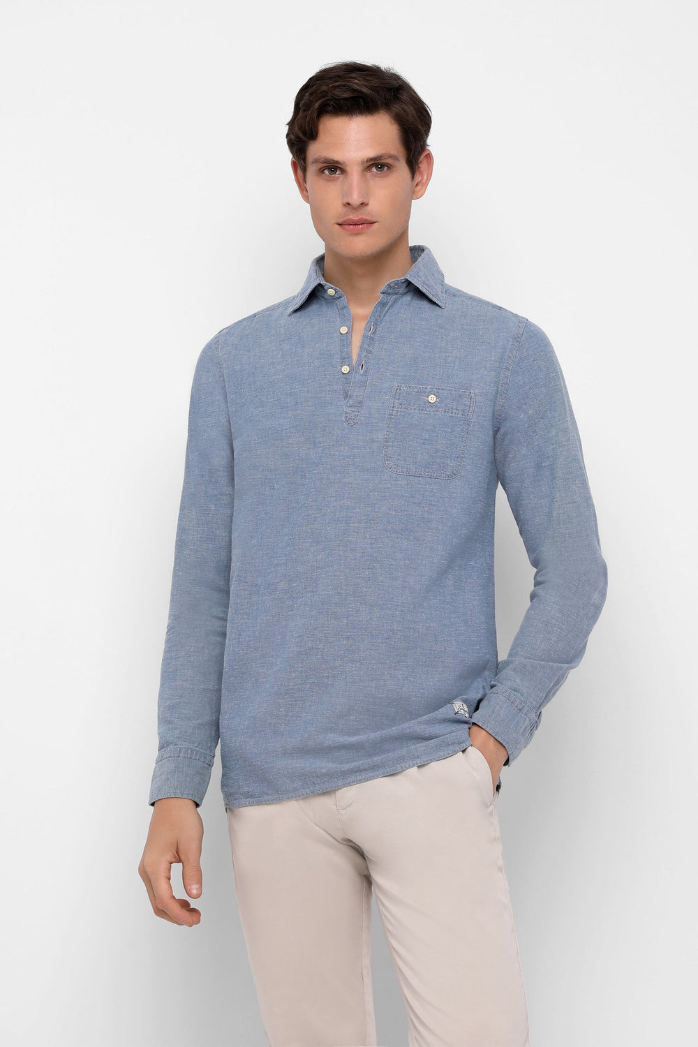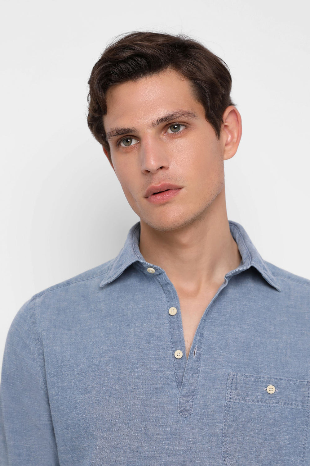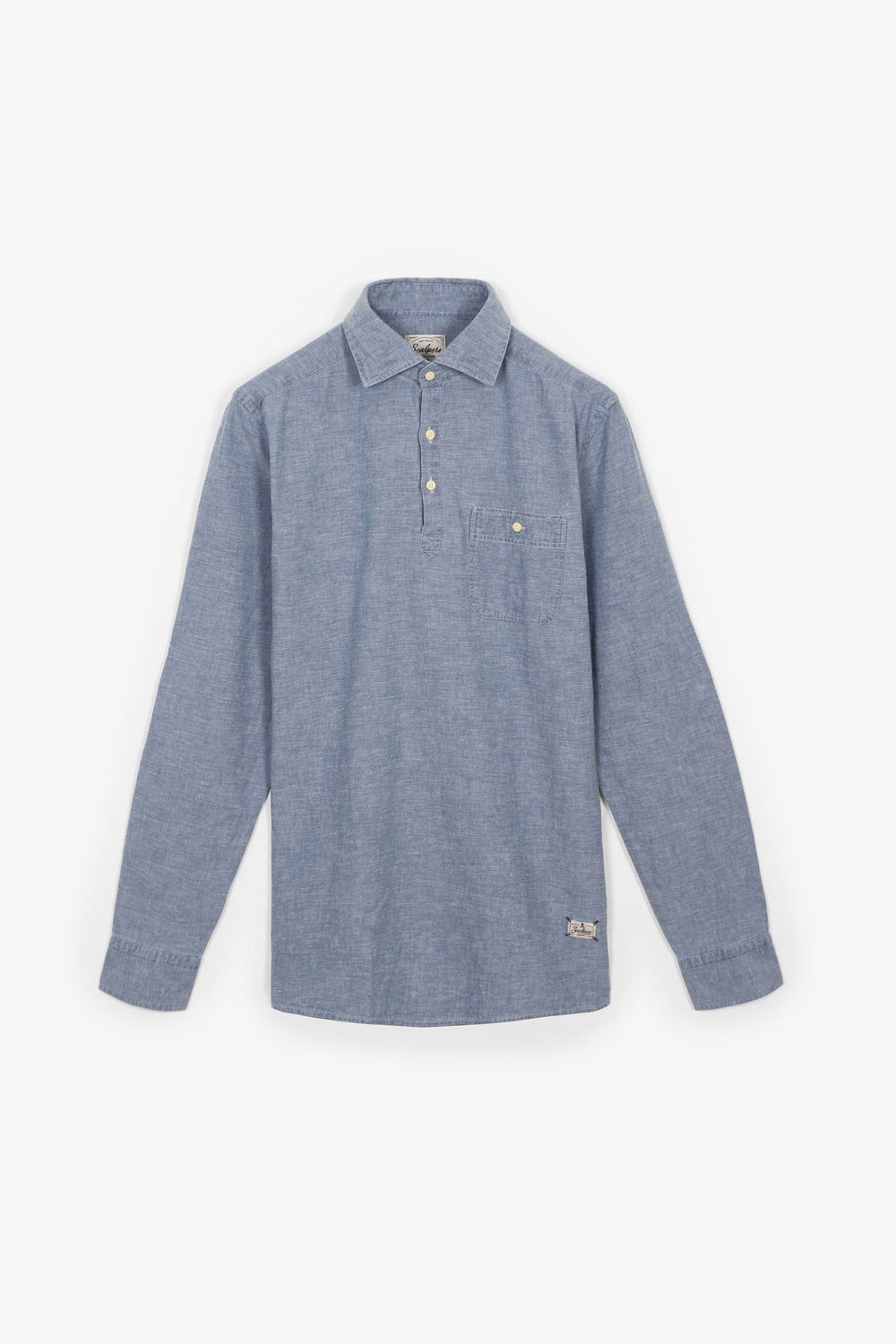 Camisa polera denim confeccionada en tejido 100% algodón. Corte Regular Fit, cuello italiano y cierre con botones. Manga larga terminada en puño con botones y bolsillo en pecho con botón.