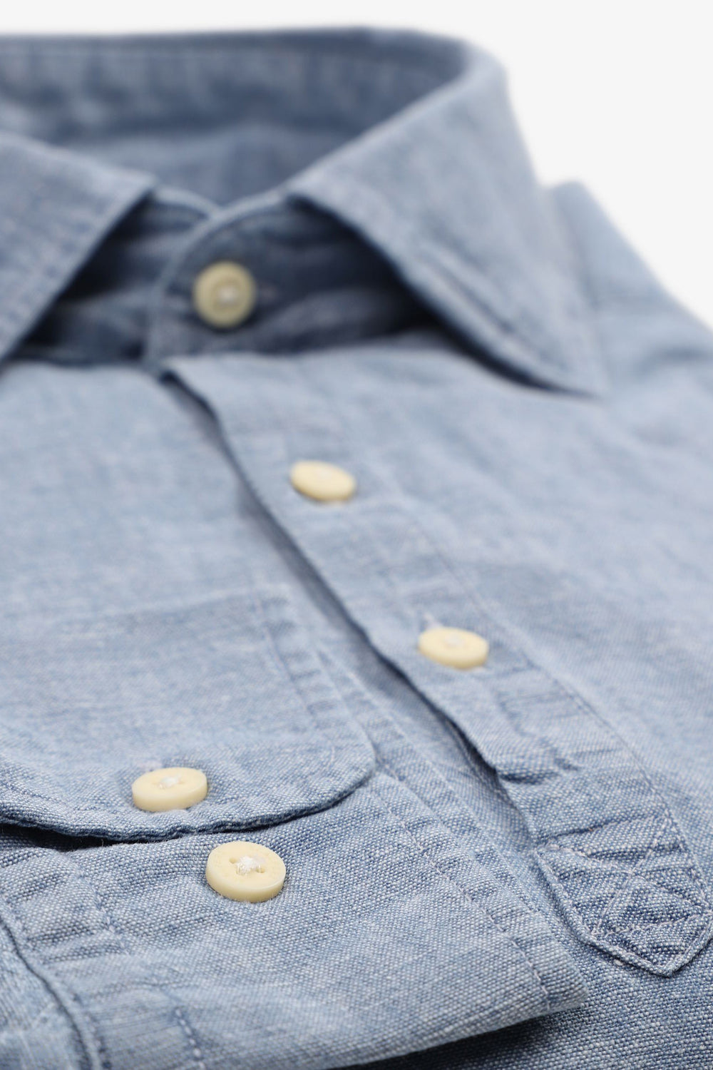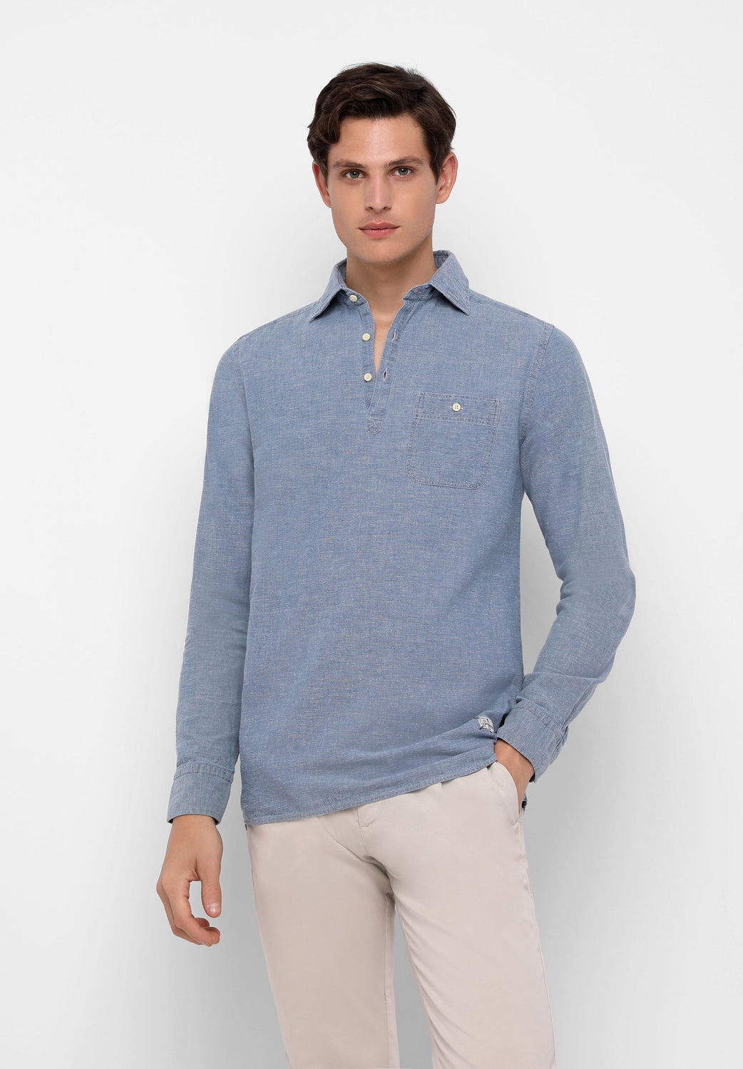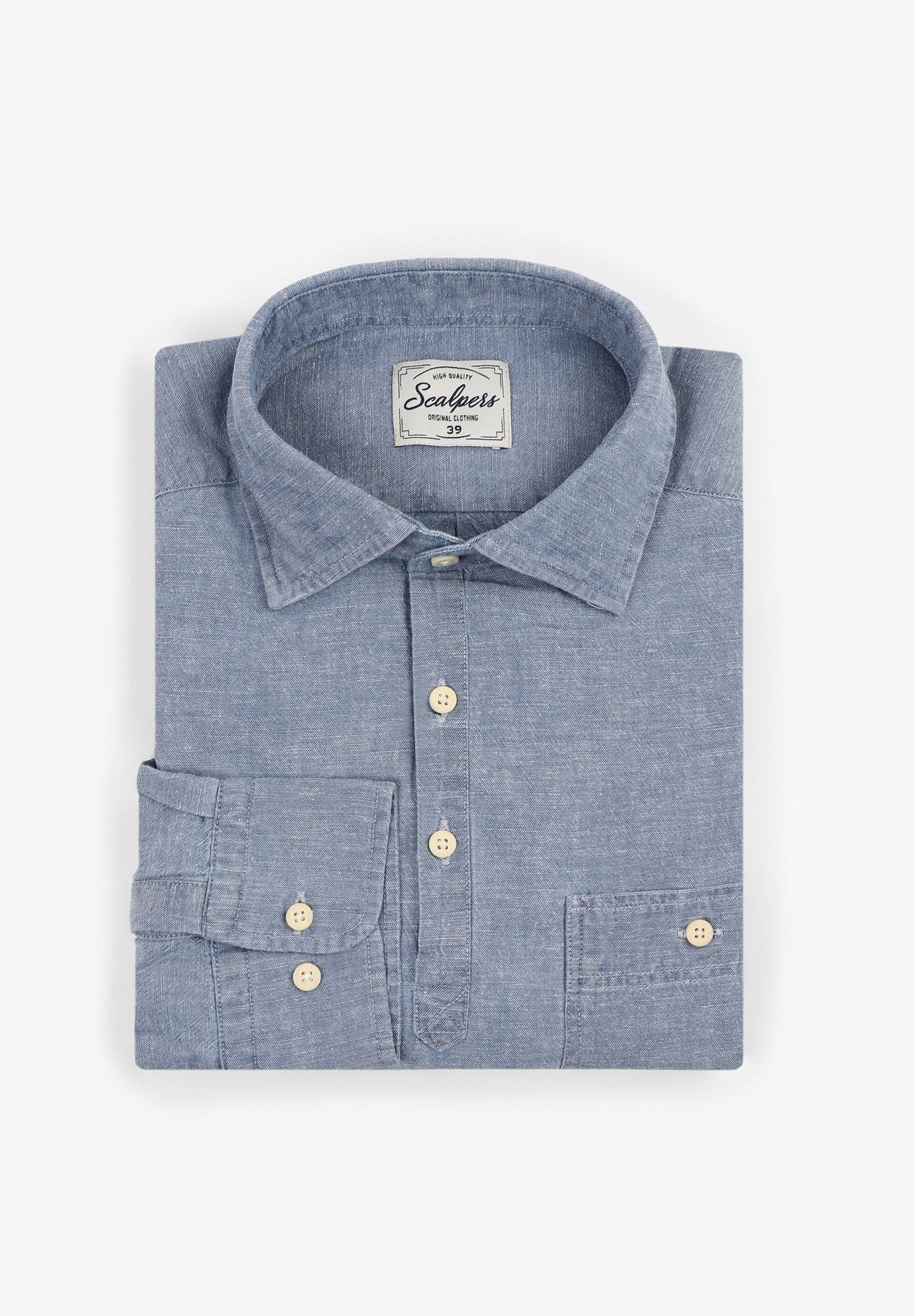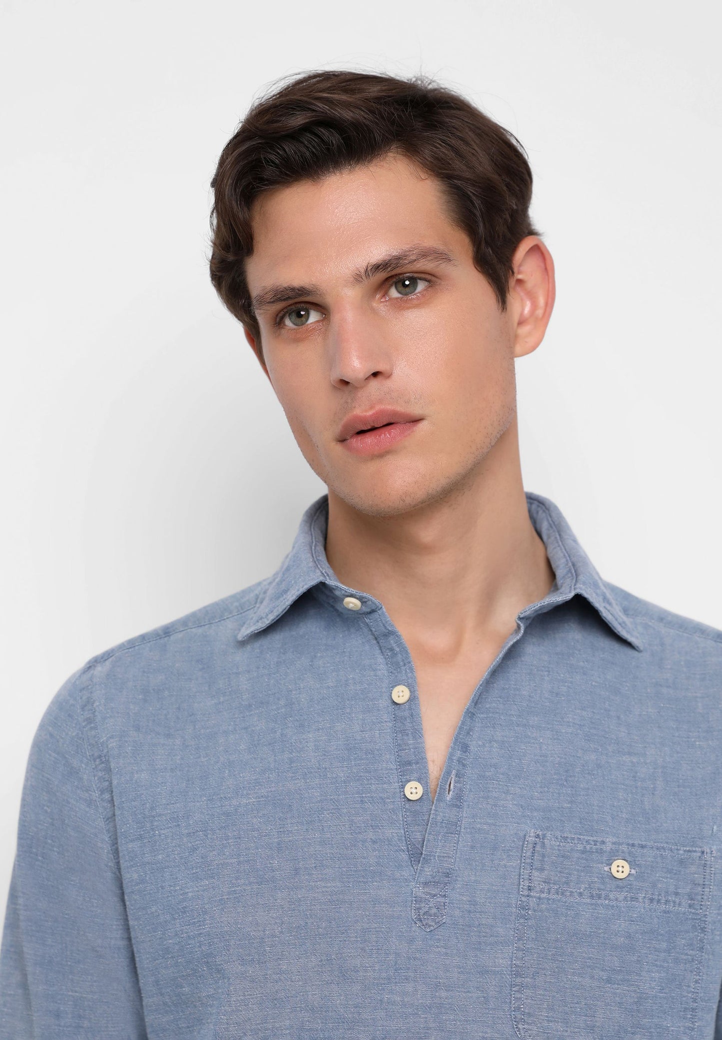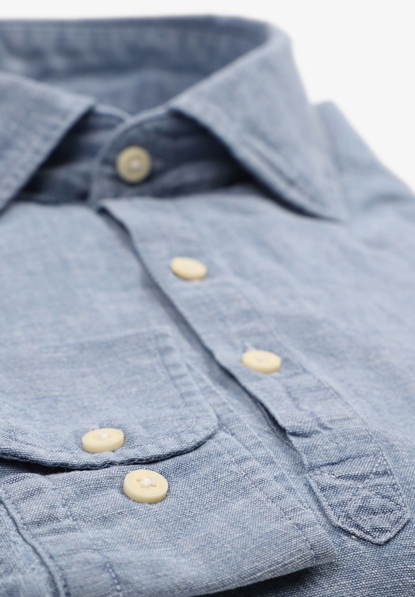 Camisa polera denim confeccionada en tejido 100% algodón. Corte Regular Fit, cuello italiano y cierre con botones. Manga larga terminada en puño con botones y bolsillo en pecho con botón.