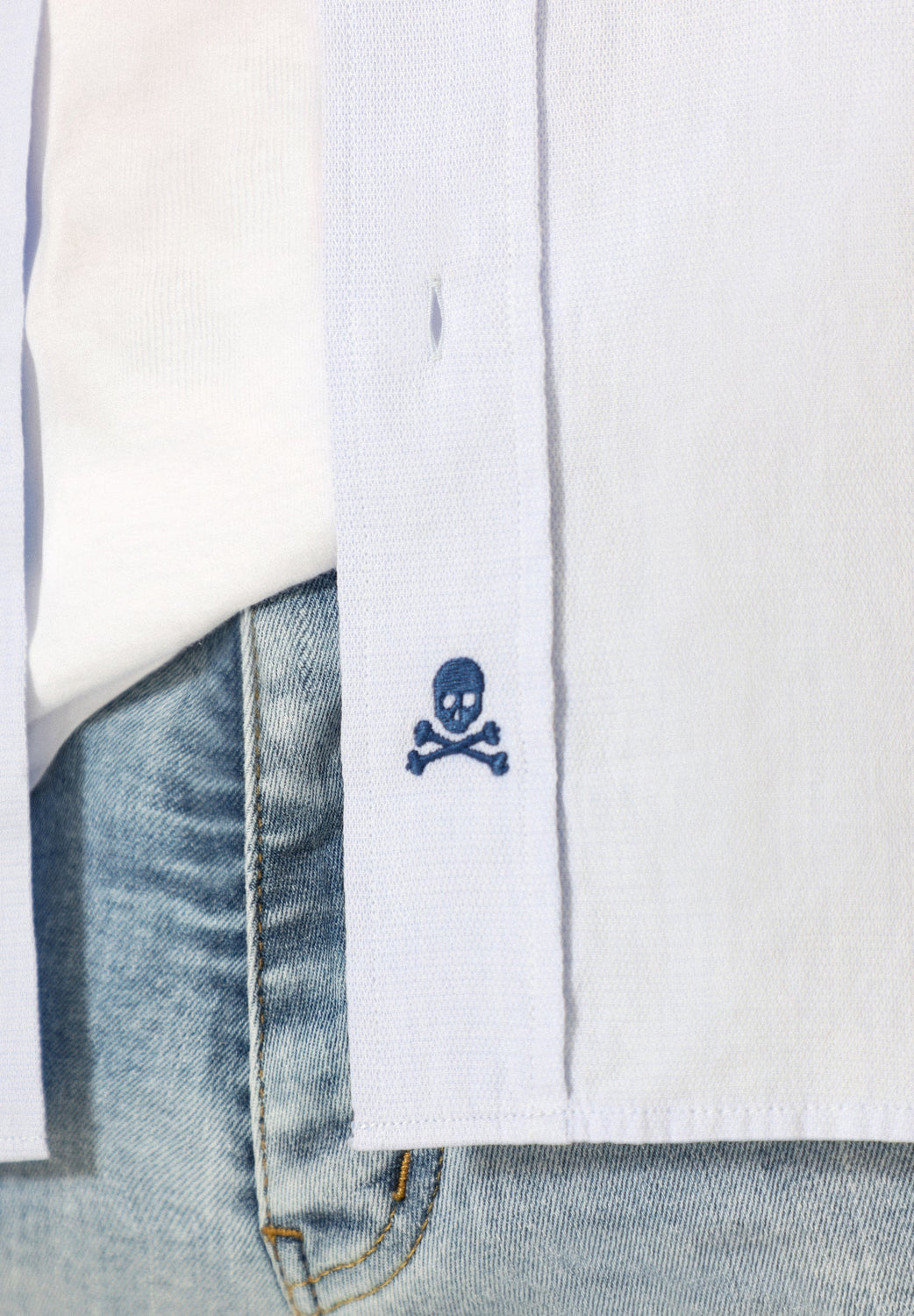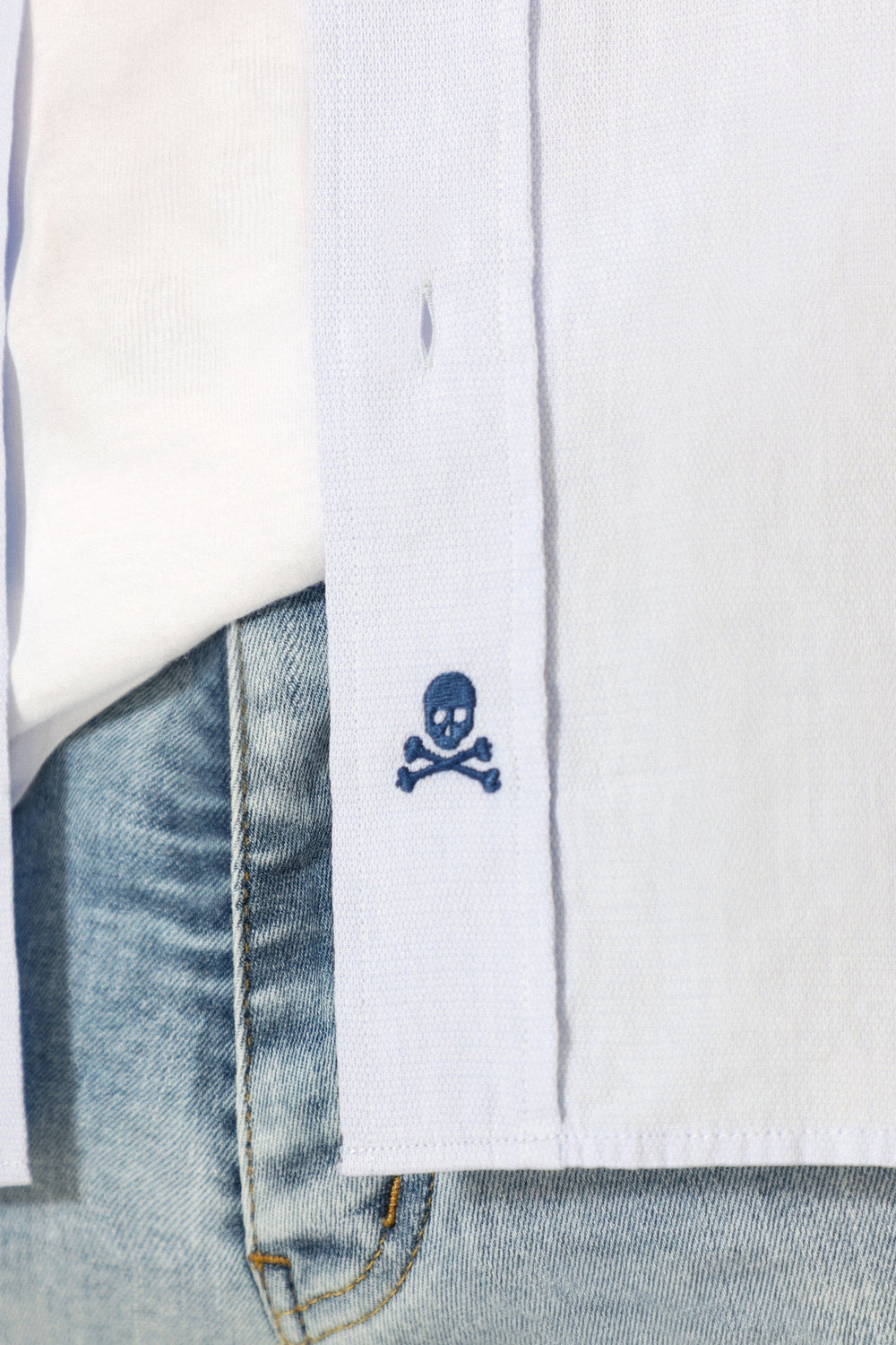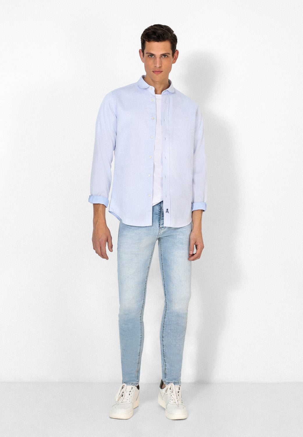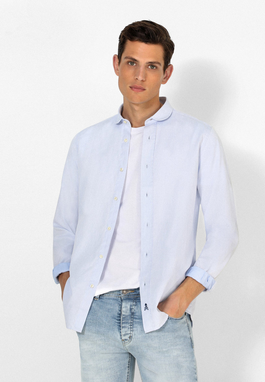 Camisa confeccionada en tejido 100% algodón. Corte Regular Fit, cuello redondeado y cierre con botones. Manga larga terminada en puño con botones y detalle de calavera bordada en el bajo.