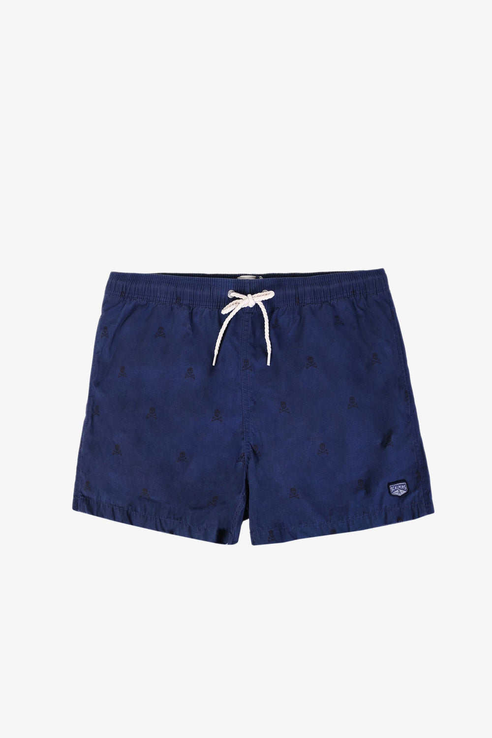 Bañador con estampado de calaveras all over a tono confeccionado en tejido técnico. Corte Reguler Fit, cierre con cordón y bolsillos laterales y trasero. Detalle de etiqueta en el bajo.
