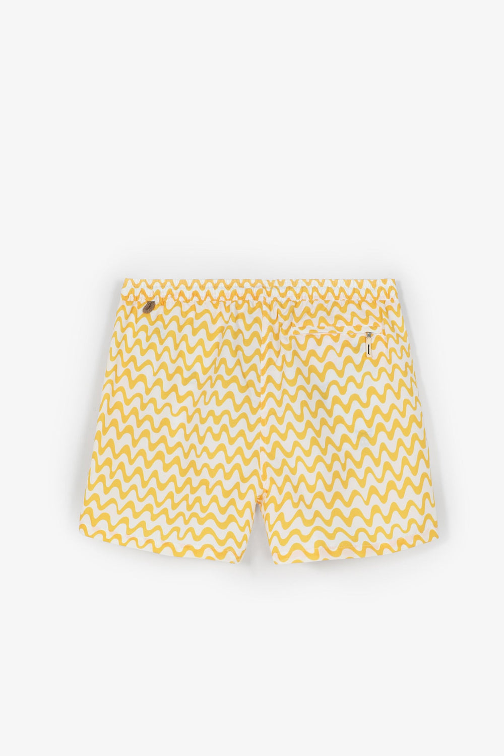 Bañador con estampado de ondas. Cintura elástica y cierre con cordón. Tiene dos bolsillos laterales y un parche en el bajo.