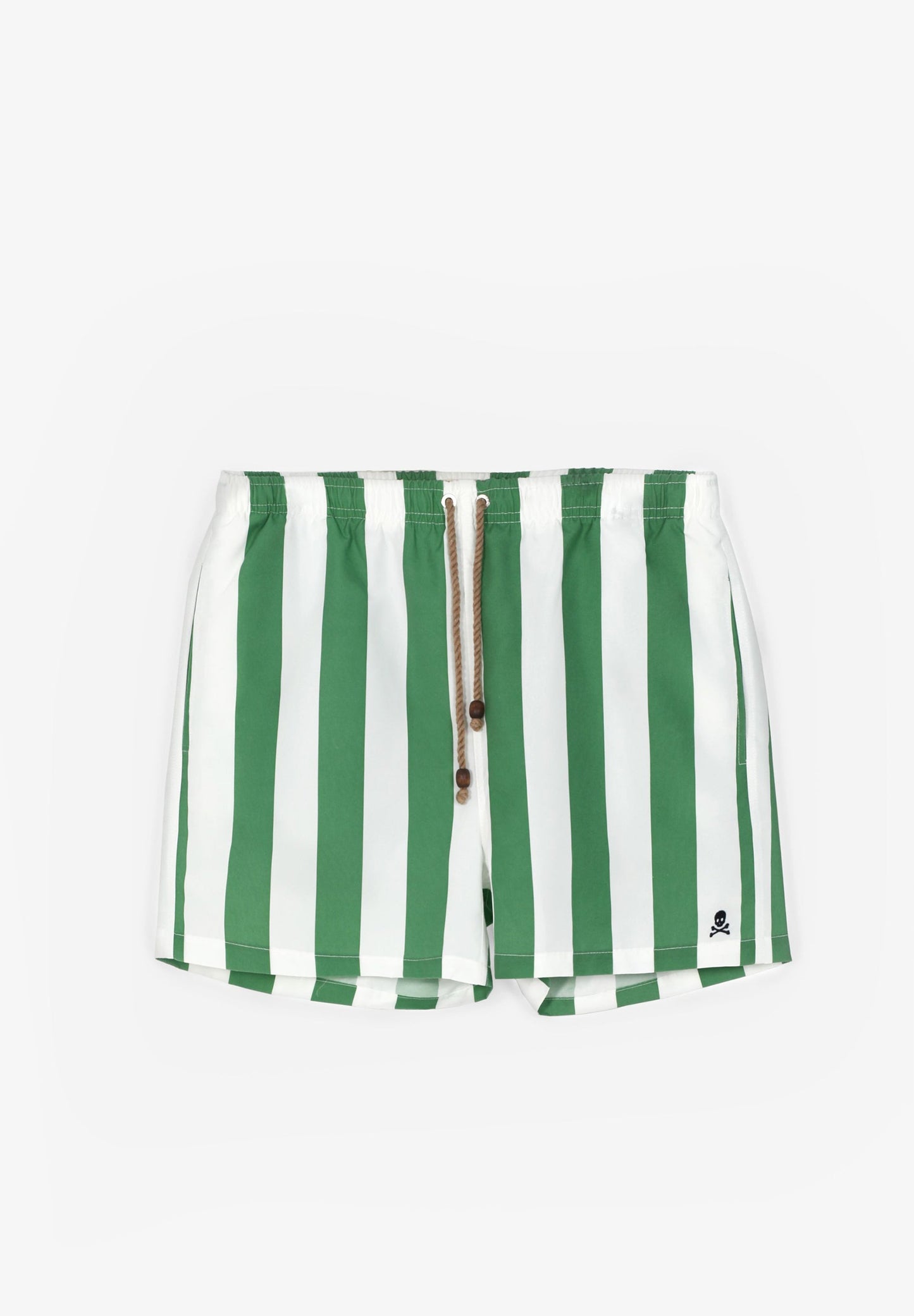 Bañador de rayas confeccionado en tejido técnico. Corte Regular Fit con cinturilla elástica, cierre con cordón y bolsillos laterales y traseros. Detalle de calavera bordada en el bajo.