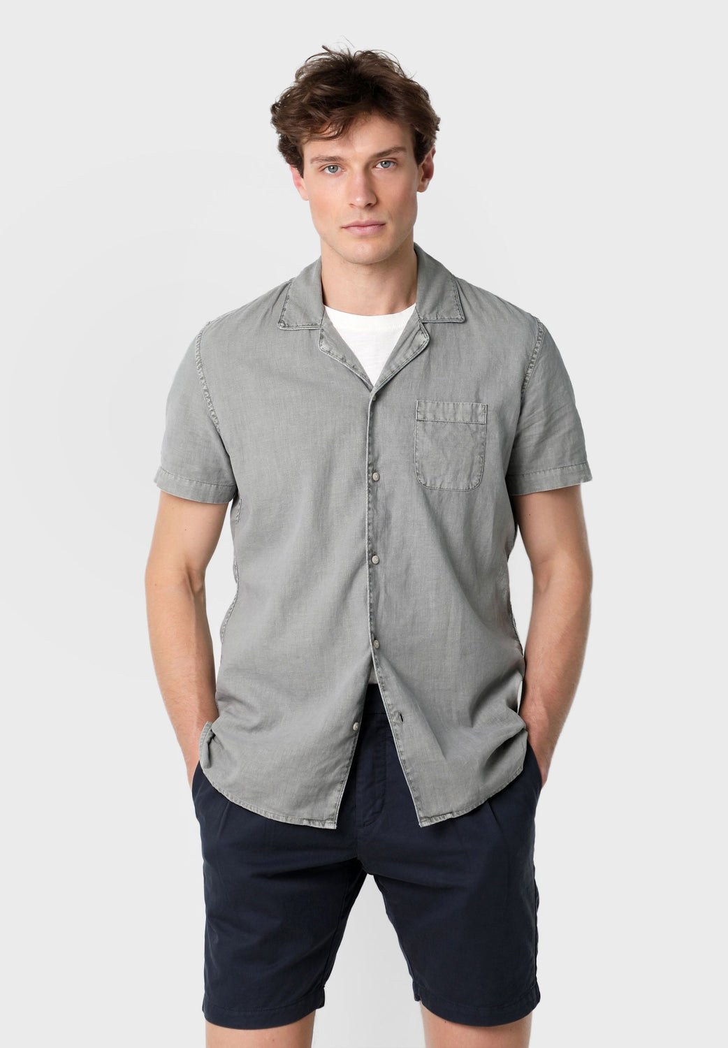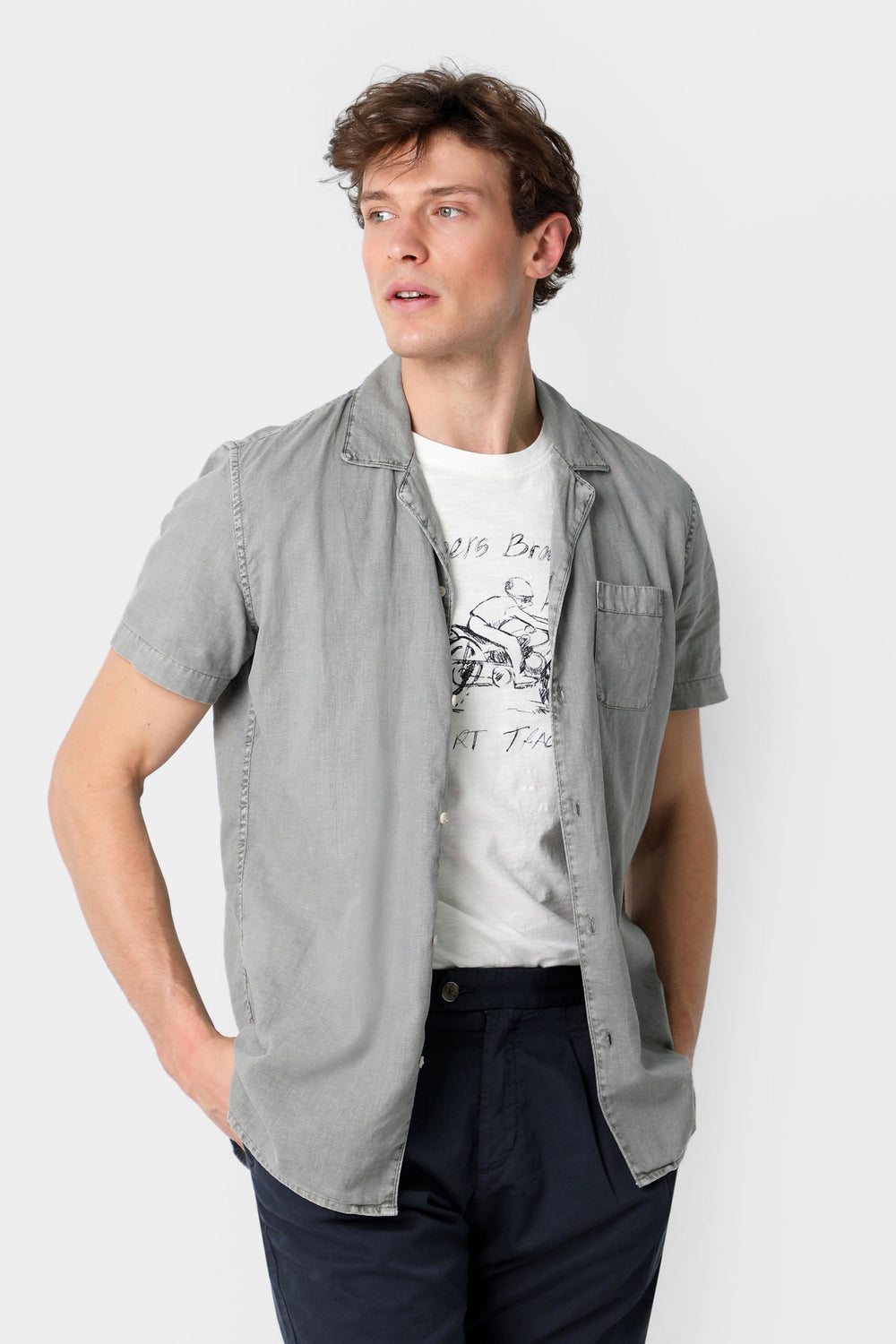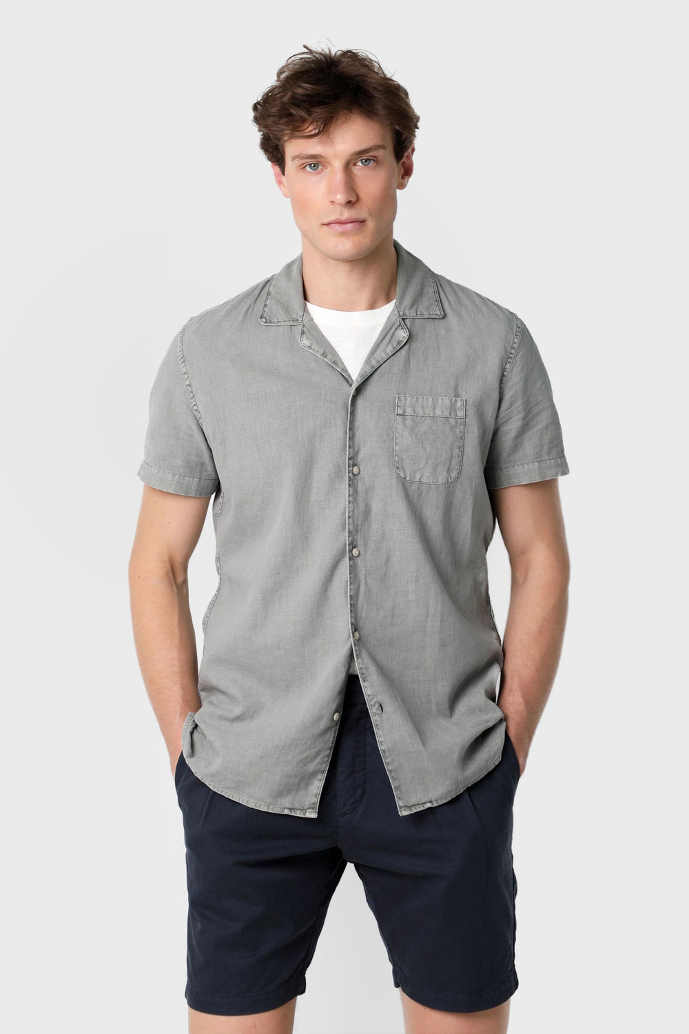 Camisa confeccionada en tejido mezcla de lino y algodón. Corte Regular Fit, manga corta, cuello pijamero y cierre con botones. Detalle bolsillo pecho.