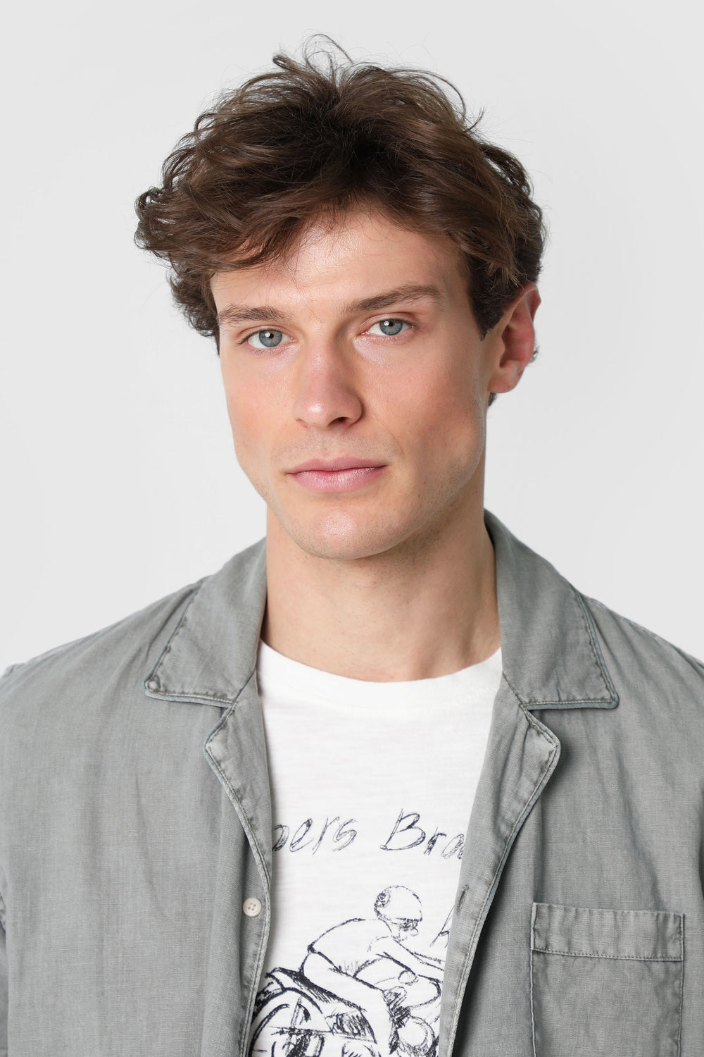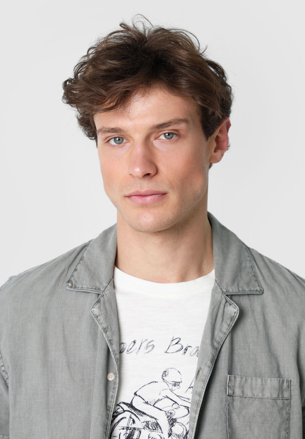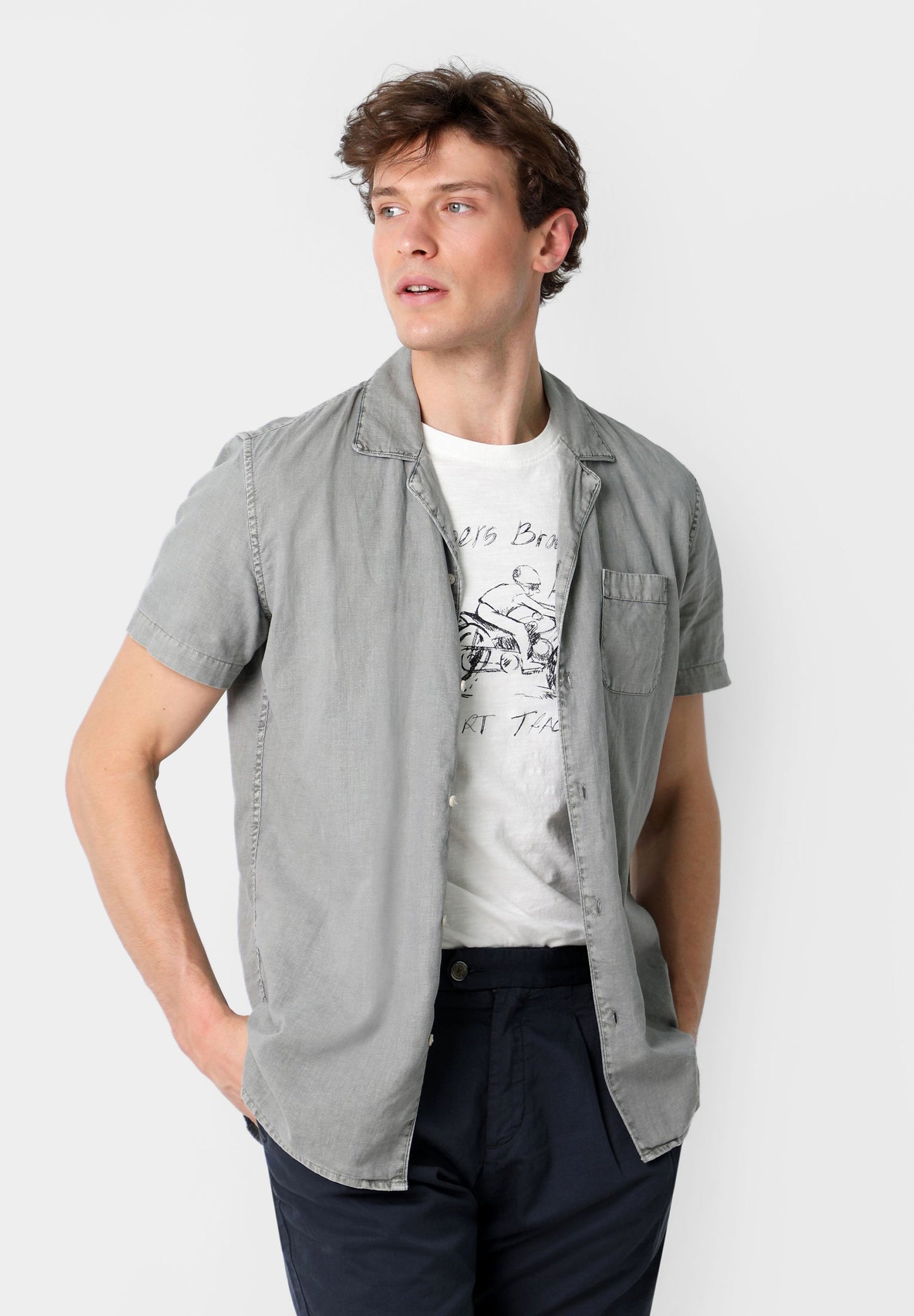 Camisa confeccionada en tejido mezcla de lino y algodón. Corte Regular Fit, manga corta, cuello pijamero y cierre con botones. Detalle bolsillo pecho.